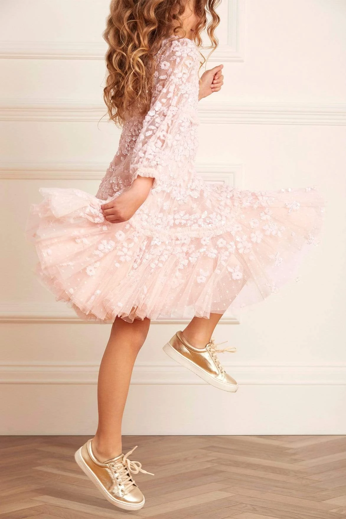 NEW SEASON | NEEDLE & THREAD EXCLUSIVE. The Margot Long Sleeve KIDS Dress in Petal Pink. This dress is adorned with shimmering sequins in a scattered floral artwork creating a sparkling effect. Its skirt is crafted with a soft tulle net to create a fuller shape and a voluminous silhouette. The Margot features Needle & Thread signature frill detailing and elasticated cuffs for easy styling. The ultimate princess piece.