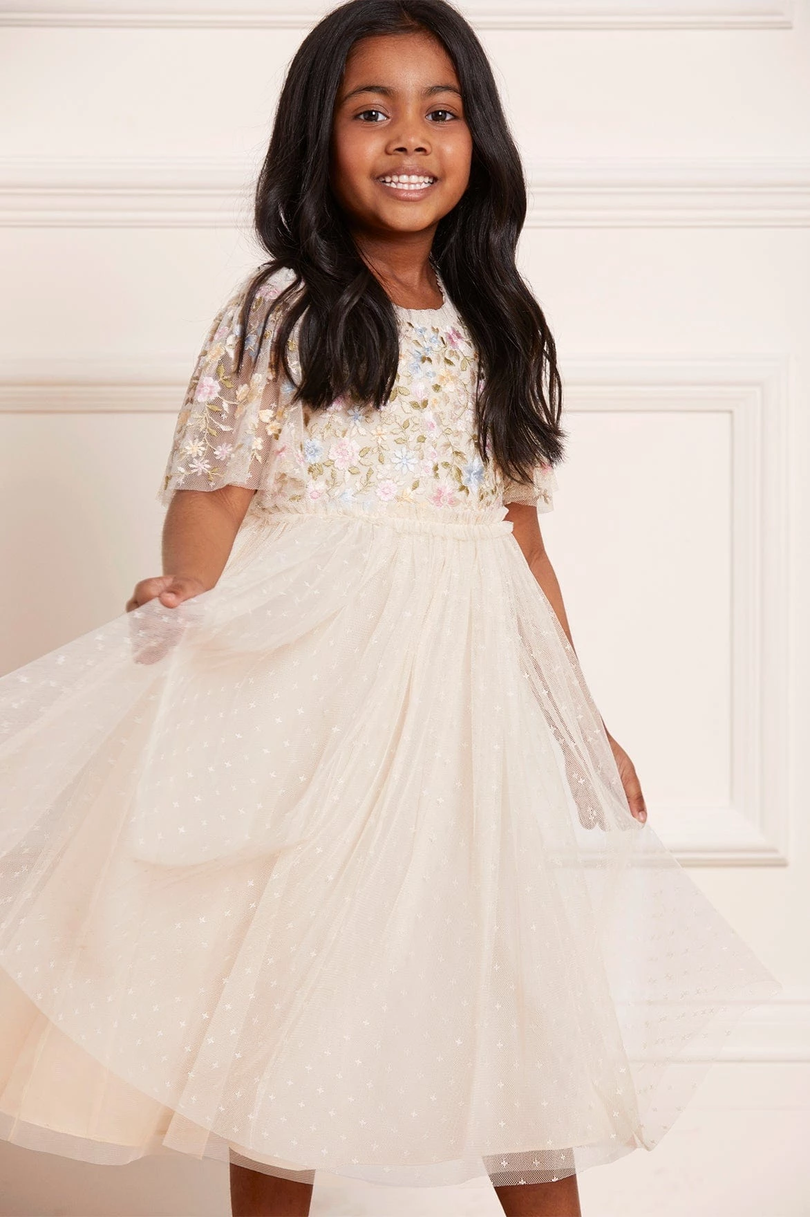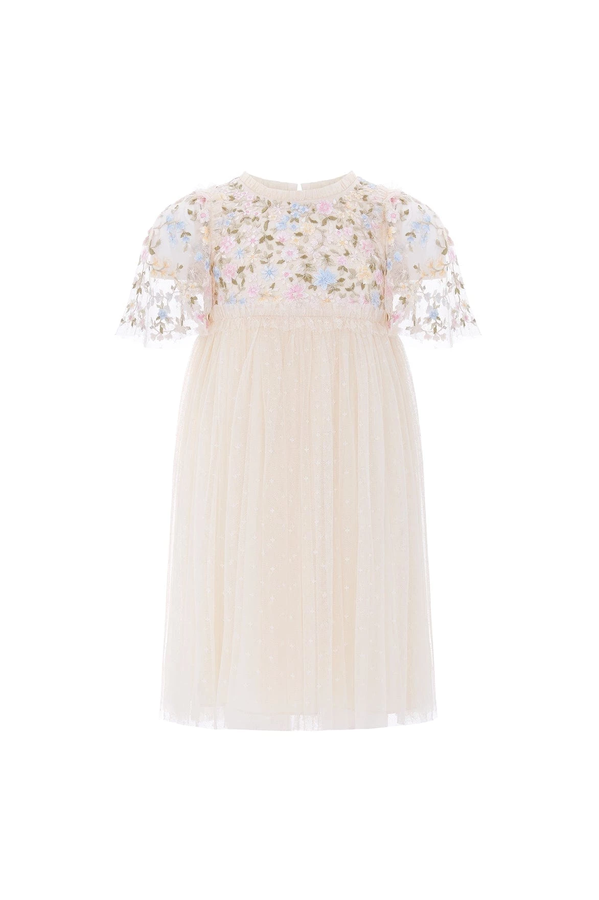 NEW SEASON | The Secret Garden Bodice KIDS Dress in Champagne / Sundaze. A signature Needle & Thread style featuring tulle trims and a layered tulle skirt. The bodice of this dress is adorned with statement embroidery artwork. Designed with a floral motif design in pastel shades. The perfect statement piece for her wardrobe.