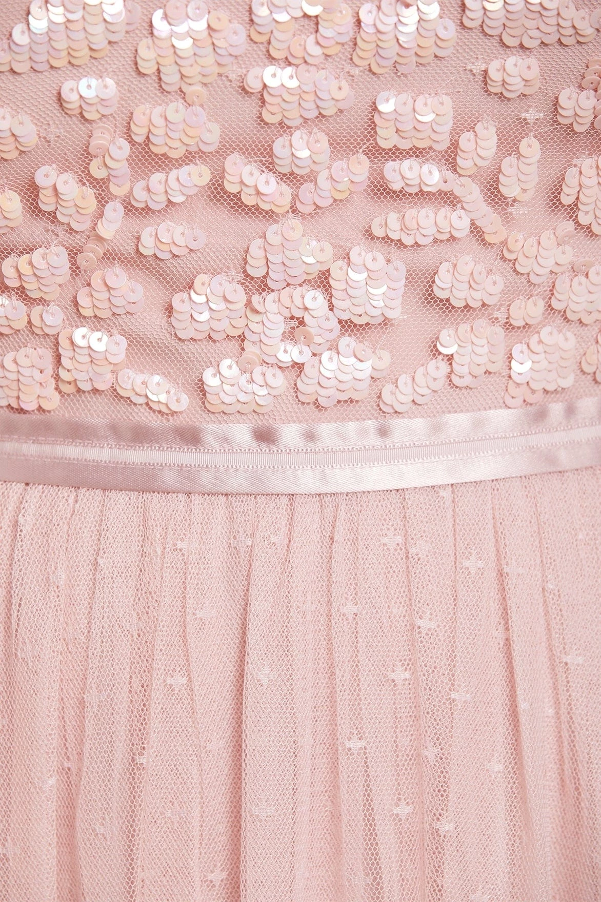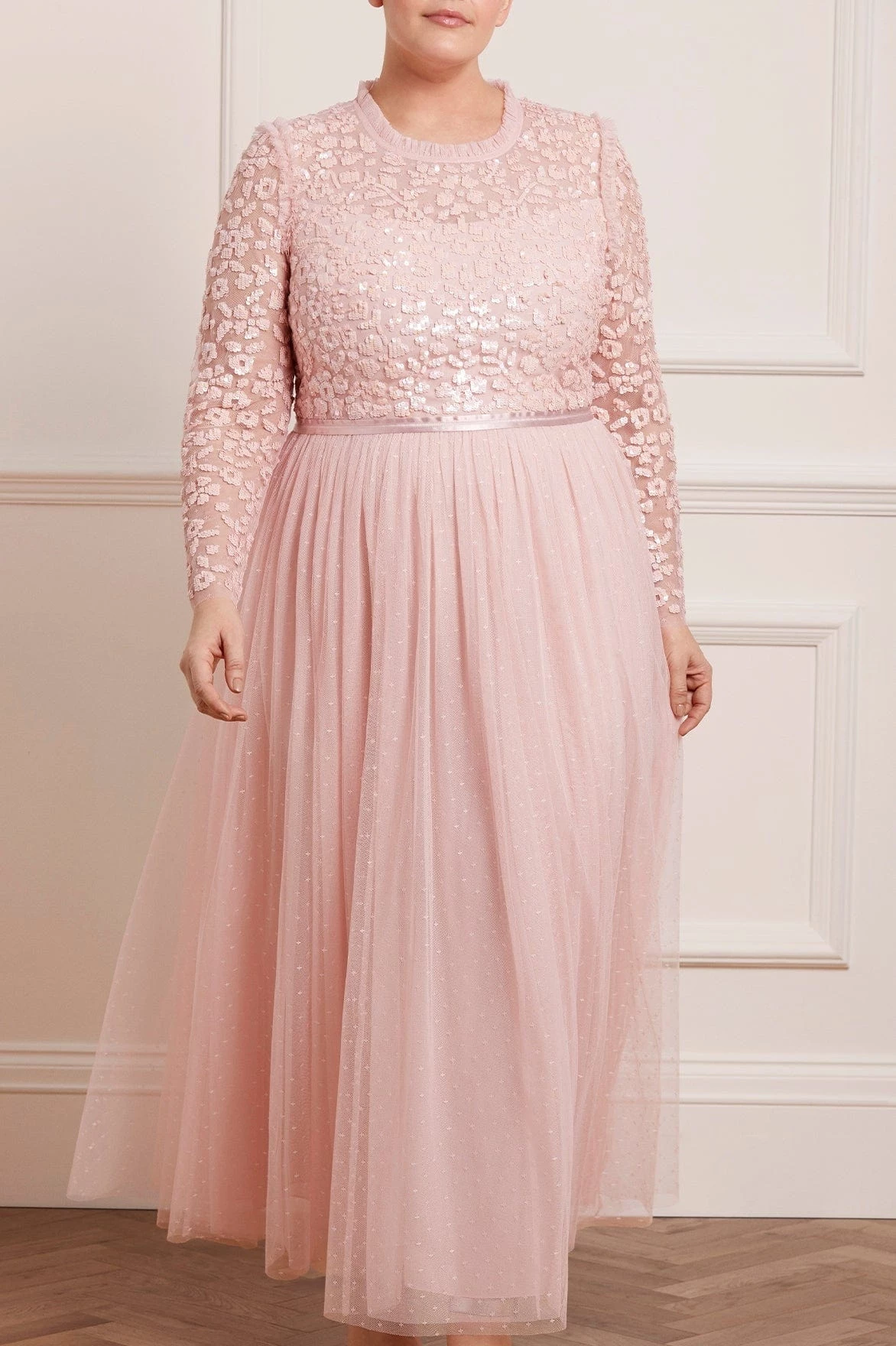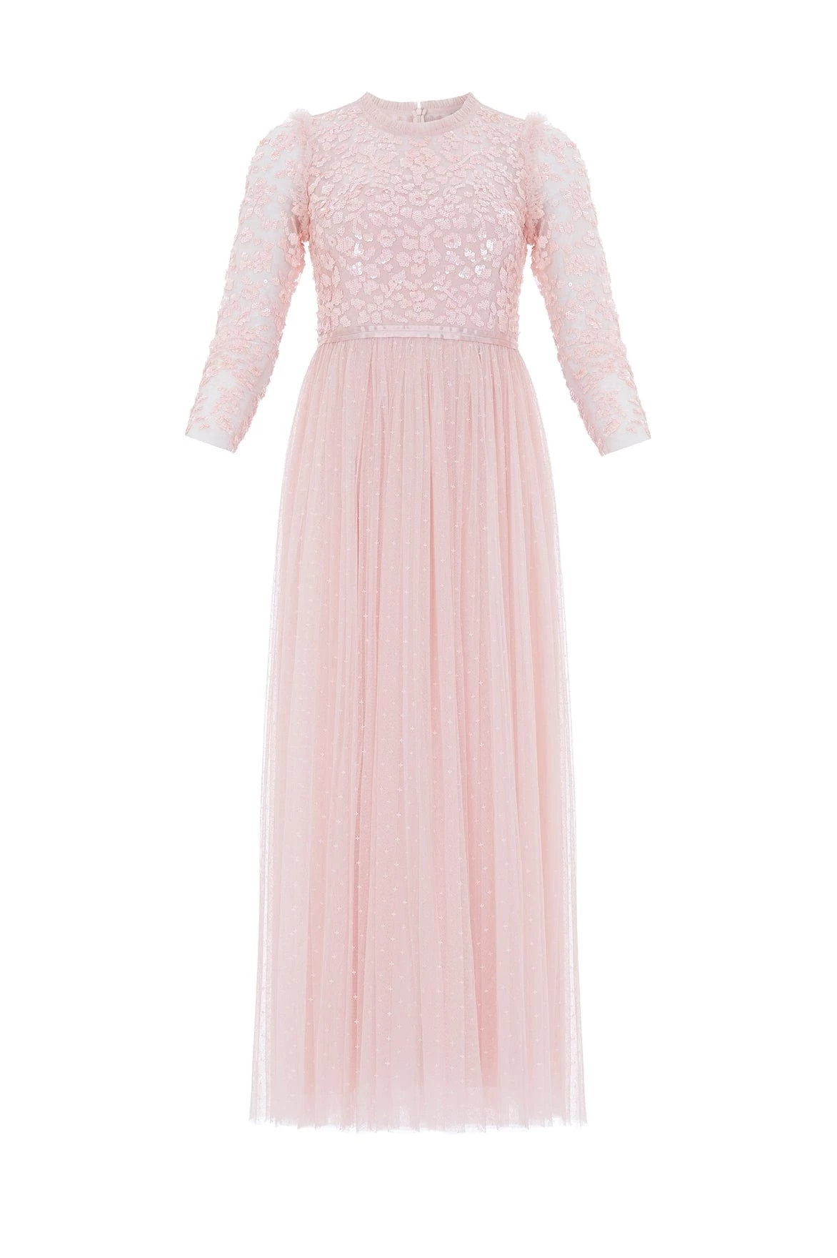 The Amalie Bodice Long Sleeve Ankle Gown in Seashell Coral. Featuring a bodice decorated with intricate shimmering sequins and floral motifs, this gown is designed with a layered tulle skirt featuring ‘x’ kiss motifs throughout, adding subtle texture. Make this gown your new season go-to.