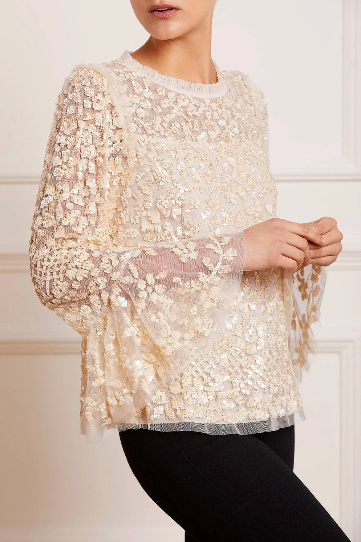 NEEDLE & THREAD EXCLUSIVE. The Amalie Sequin Top in Champagne. Decorated with intricate shimmering sequins and floral motifs, this top is designed with fluted sleeves and cuffs for romantic styling. Make a statement in effortless glamour.