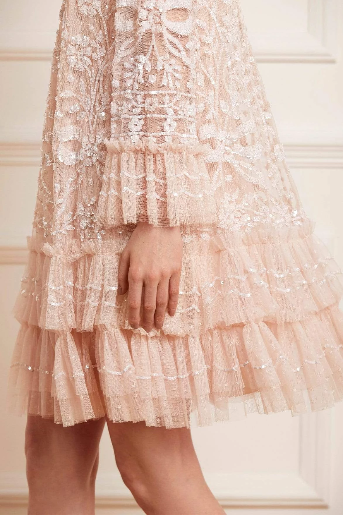 The Celia Long Sleeve Mini Dress in Strawberry Icing. This statement long sleeve dress is designed with romantic artwork featuring ornate florals with ribbon bows, densely filled with shimmering ivory sequins and exquisite detailing. Crafted with an effortless, loose fit with soft, playful tulle frills on the hem and cuffs. A key piece of the collection.