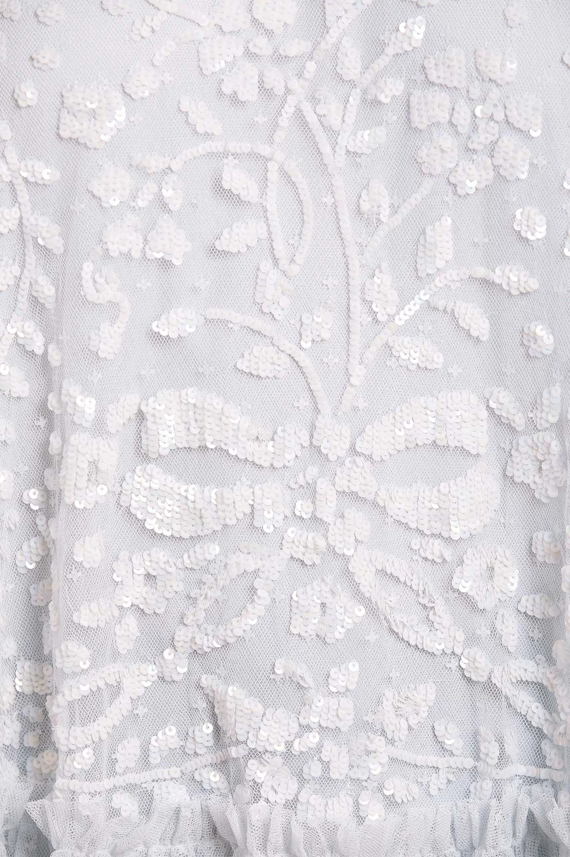 NEEDLE & THREAD EXCLUSIVE. The Celia Top in Ice Blue. This statement long sleeve top is designed with romantic artwork featuring ornate florals, ribbon bows densely filled with shimmering sequins and exquisite detailing. Crafted to produce an effortless, loose fit with soft, playful tulle frills on the cuffs. A key piece in our collection.