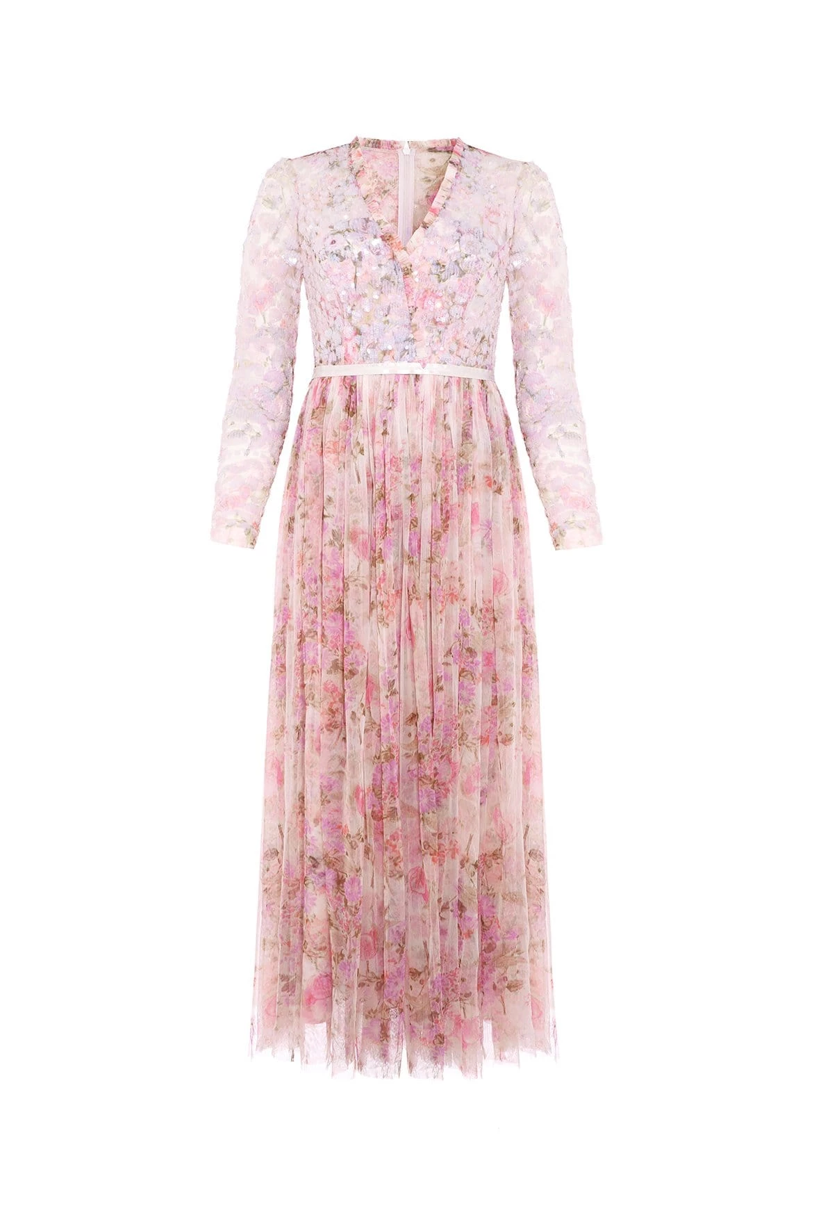 The Darling Meadow V Neck Bodice Ankle Gown in Pink / Multi. This statement gown is beautifully printed with painted flowers and garden motifs, inspired by a vintage French fabric. The bodice is adorned with shimmering, iridescent sequins in romantic floral motifs and features our signature Needle & Thread satin ribbon at the waist. Crafted with layers of tulle creating romantic, delicate movement. The perfect gown for every special occasion.