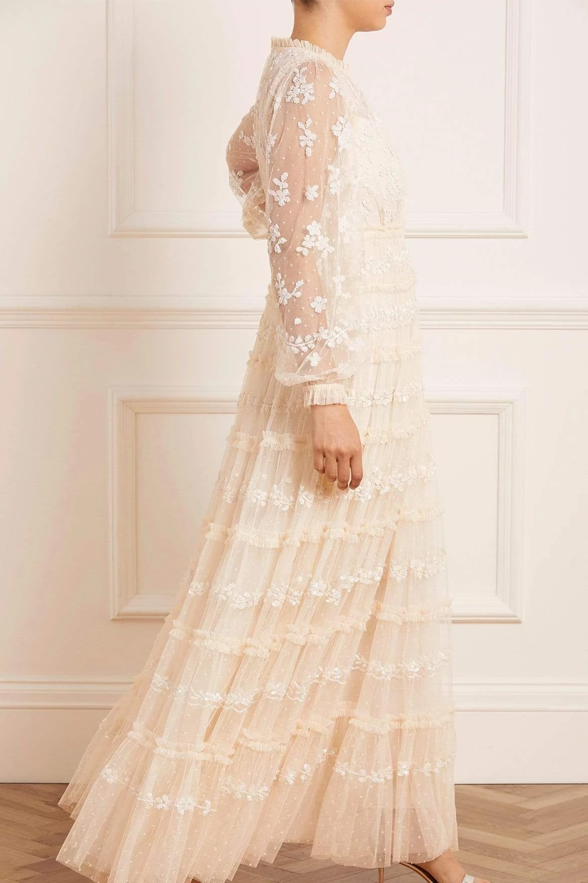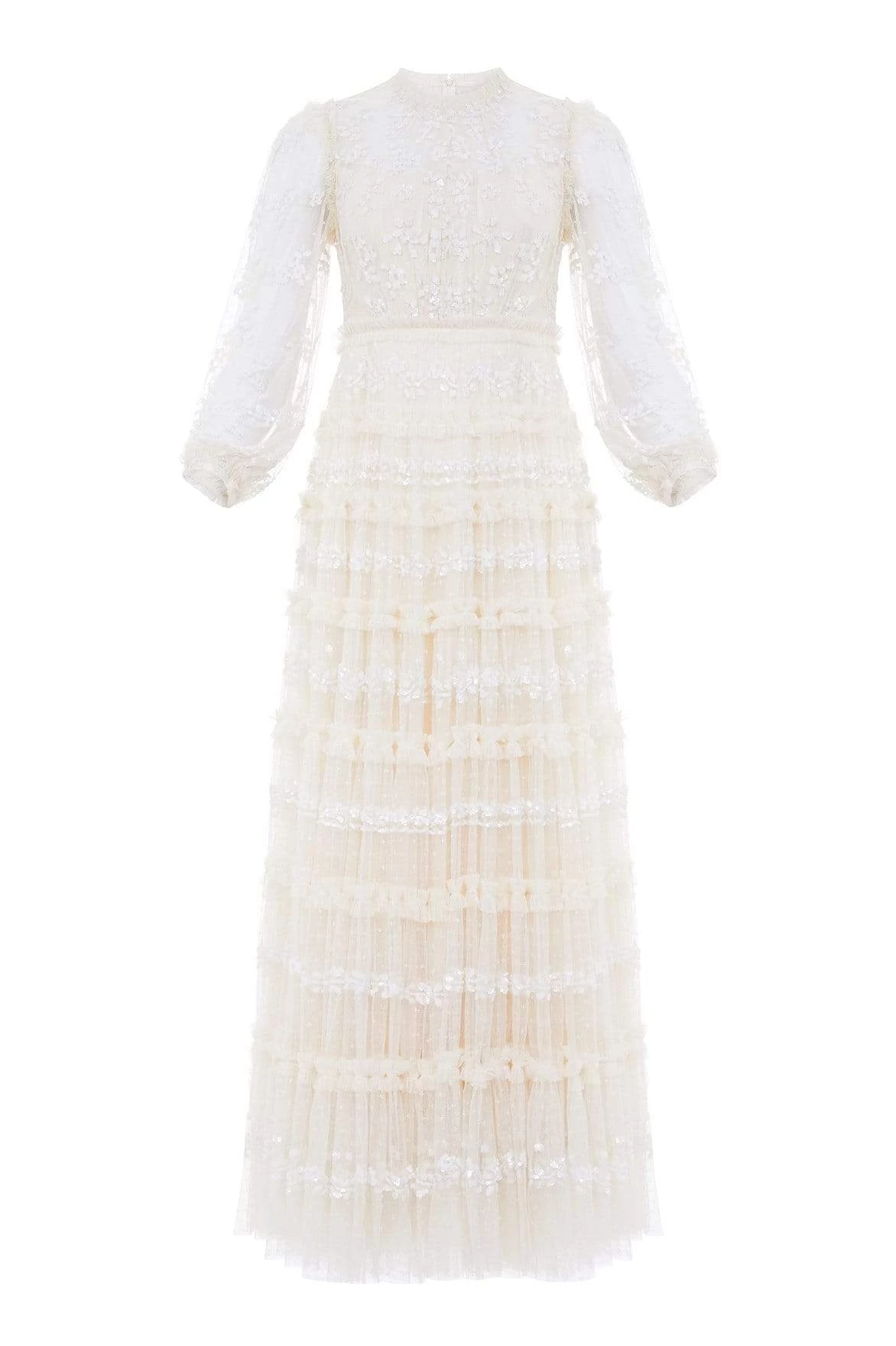 The Eve Sequin Gown in Champagne. This gown is romantically designed with a flattering, gently gathered bodice and full sleeves. Crafted with layers of our signature kisses tulle, and intricately adorned with shimmering sequin borders in pretty, lace-inspired designs. Make a statement in the Eve this season.