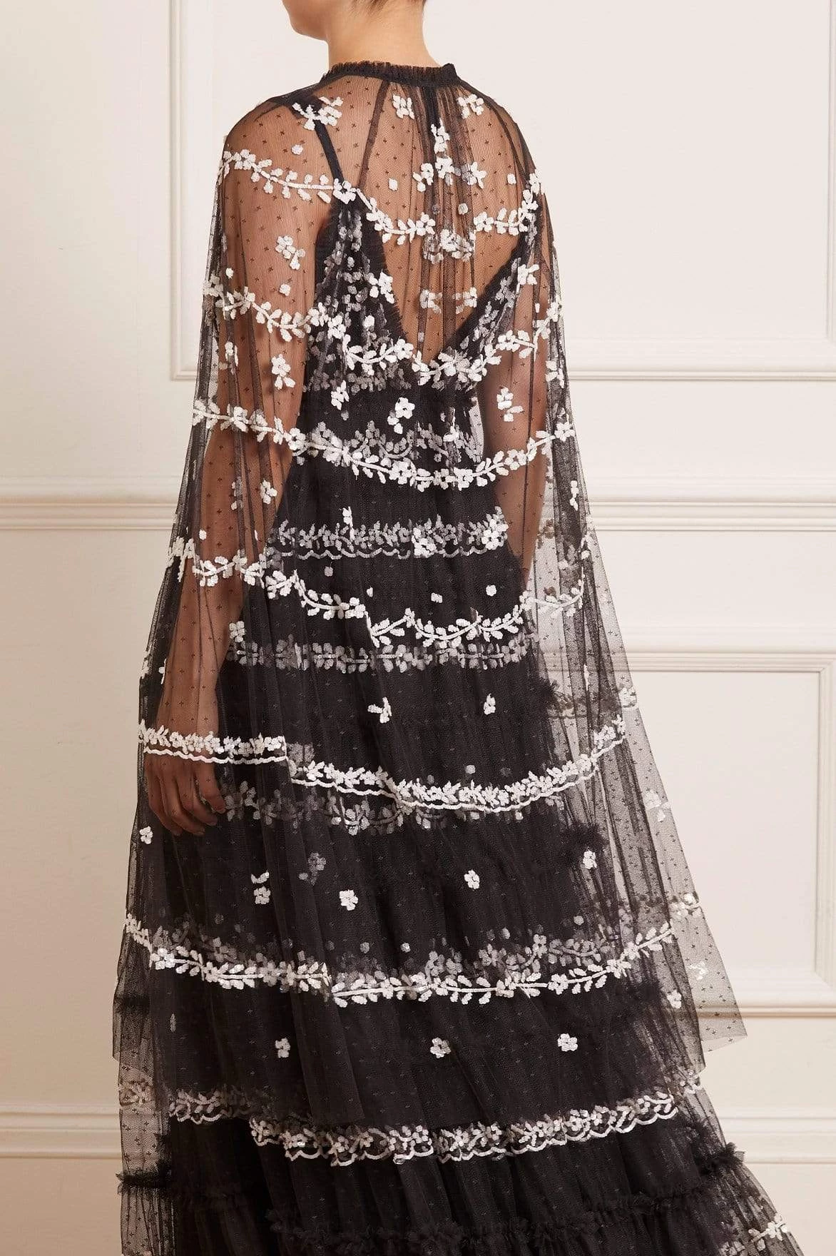 The Eve Sequin Midaxi Cape in Graphite / Champagne. This romantic cape is intricately adorned with shimmering sequin borders in pretty, lace-inspired designs. Designed to sit over the Eve Sequin Cami Gown for a statement look. Make this cape your new go-to piece this season.