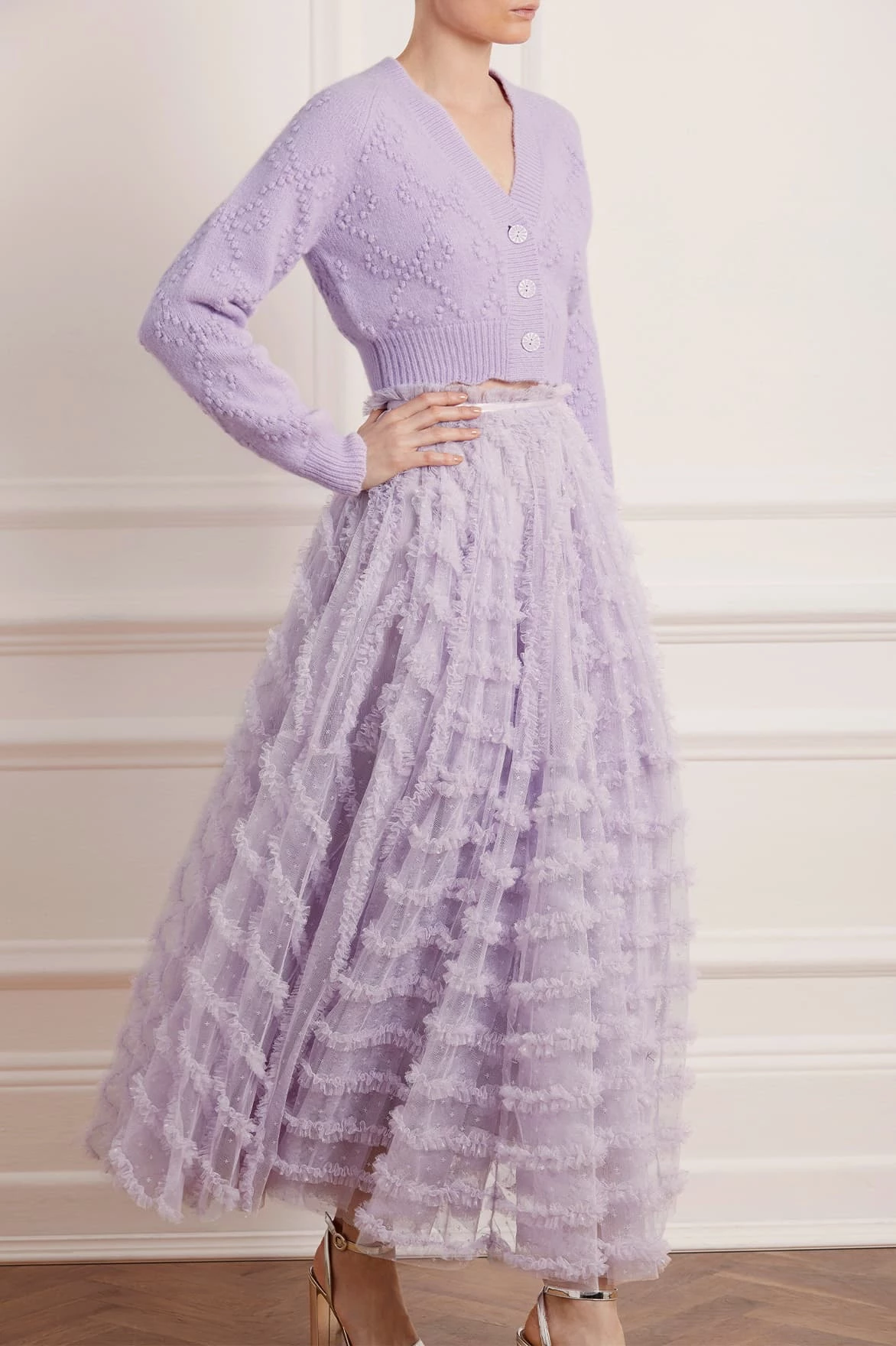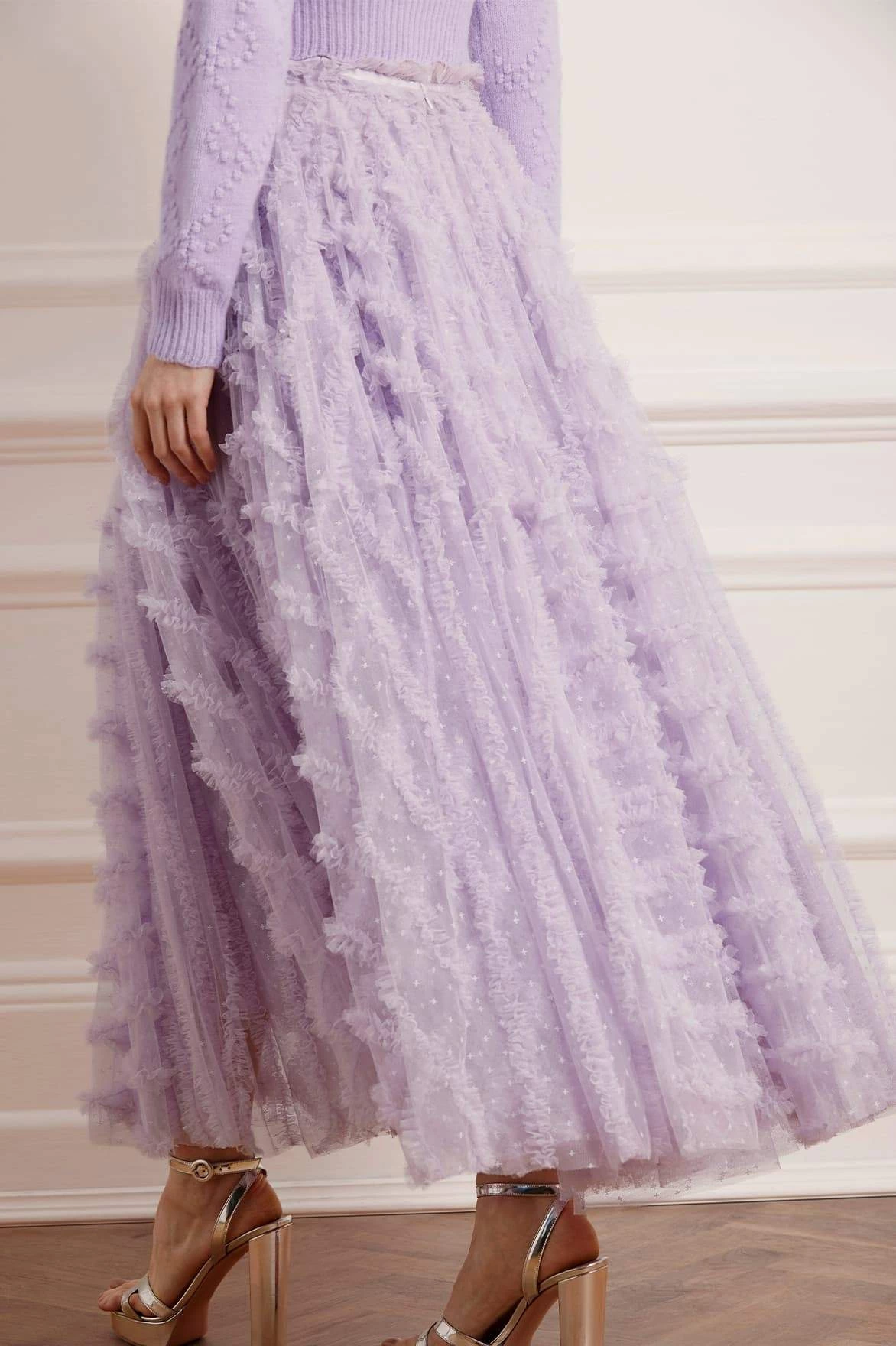 NEEDLE & THREAD EXCLUSIVE. Meet the Florence Ruffle Ankle Skirt in Lilac. This beautiful skirt is crafted with layers of kisses tulle, creating a voluminous, romantic look. This ankle-length skirt is designed elegantly with a satin waistband and gathered neatly with tulle trims. Pair with your favourite knit and make an entrance this season.