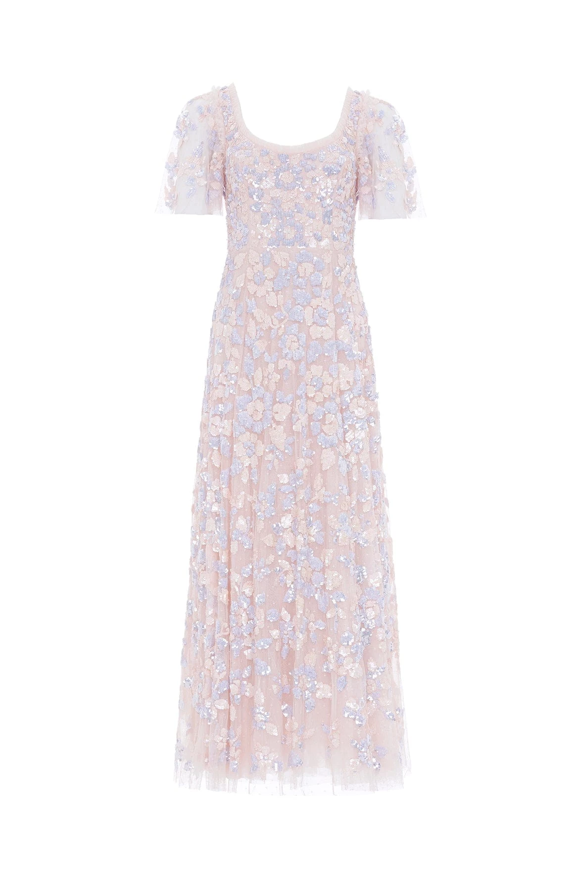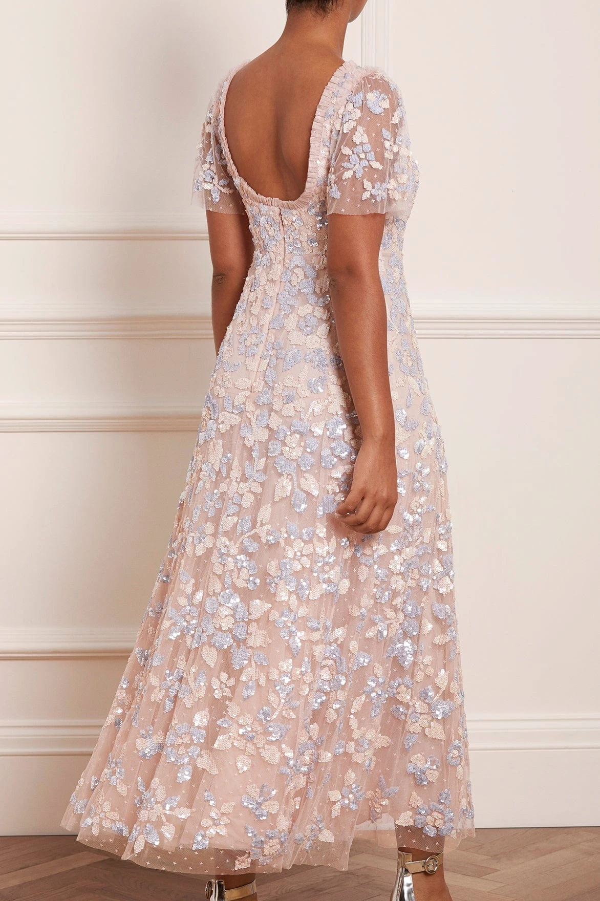 The Mary Rose Scoop Neck Ankle Gown in Petal Pink / Blue Multi. This ankle gown features a two tone floral sequin design creating a statement artwork. Beautifully crafted with a flattering silhouette. A net underlayer helps to shape this elegant piece. A truly show-stopping gown.