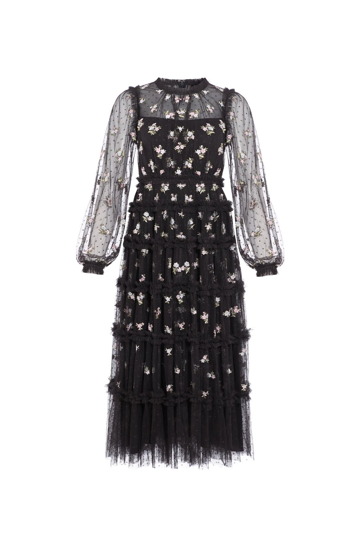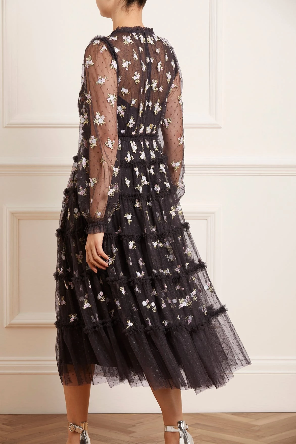 The Serefina Ditsy Ballerina Dress in Graphite. This ballerina dress is intricately adorned with embroidered florals scattered throughout. Crafted with layers of delicate tulle, featuring ruffle-trimmed tiers to create romantic volume through the enchanting silhouette. Make this dress your new statement piece.