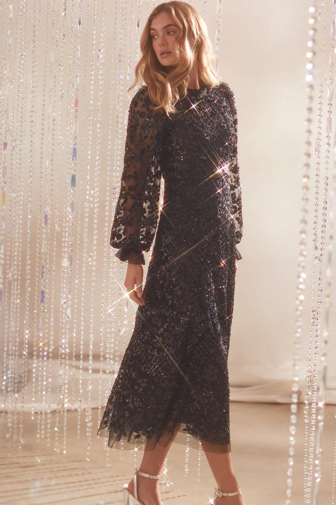 The Seren Long Sleeve Ballerina Dress in Graphite. This statement dress is adorned with a floral sequin artwork, creating an all-over shimmer effect. Crafted in our signature tulle , with an effortlessly flattering silhouette. Make a statement in this show-stopping ballerina dress.