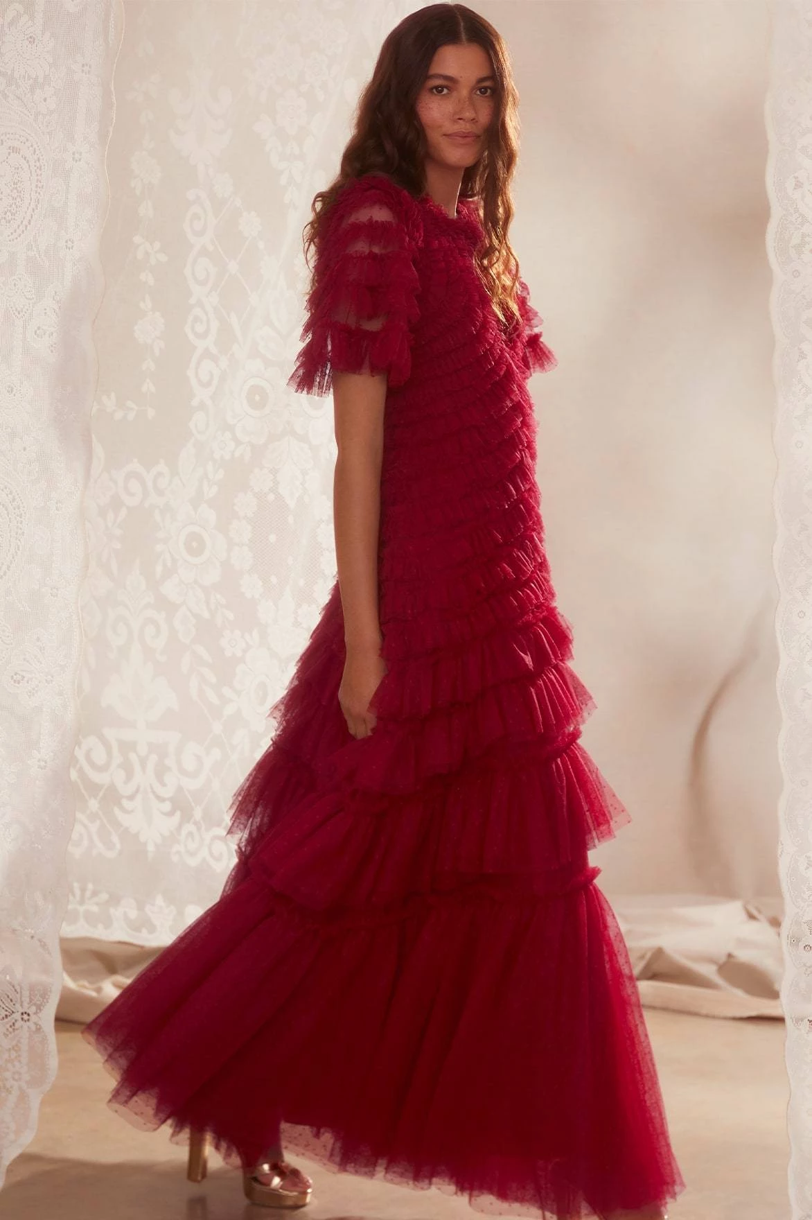 The Willow Ruffle Gown in Deep Red. A Needle & Thread signature shape. This show-stopping gown is adorned with layers of tulle frills engineered to create a flattering texture. Developed from our kisses tulle, featuring an ‘x’ motif throughout. Make a statement in the Willow.