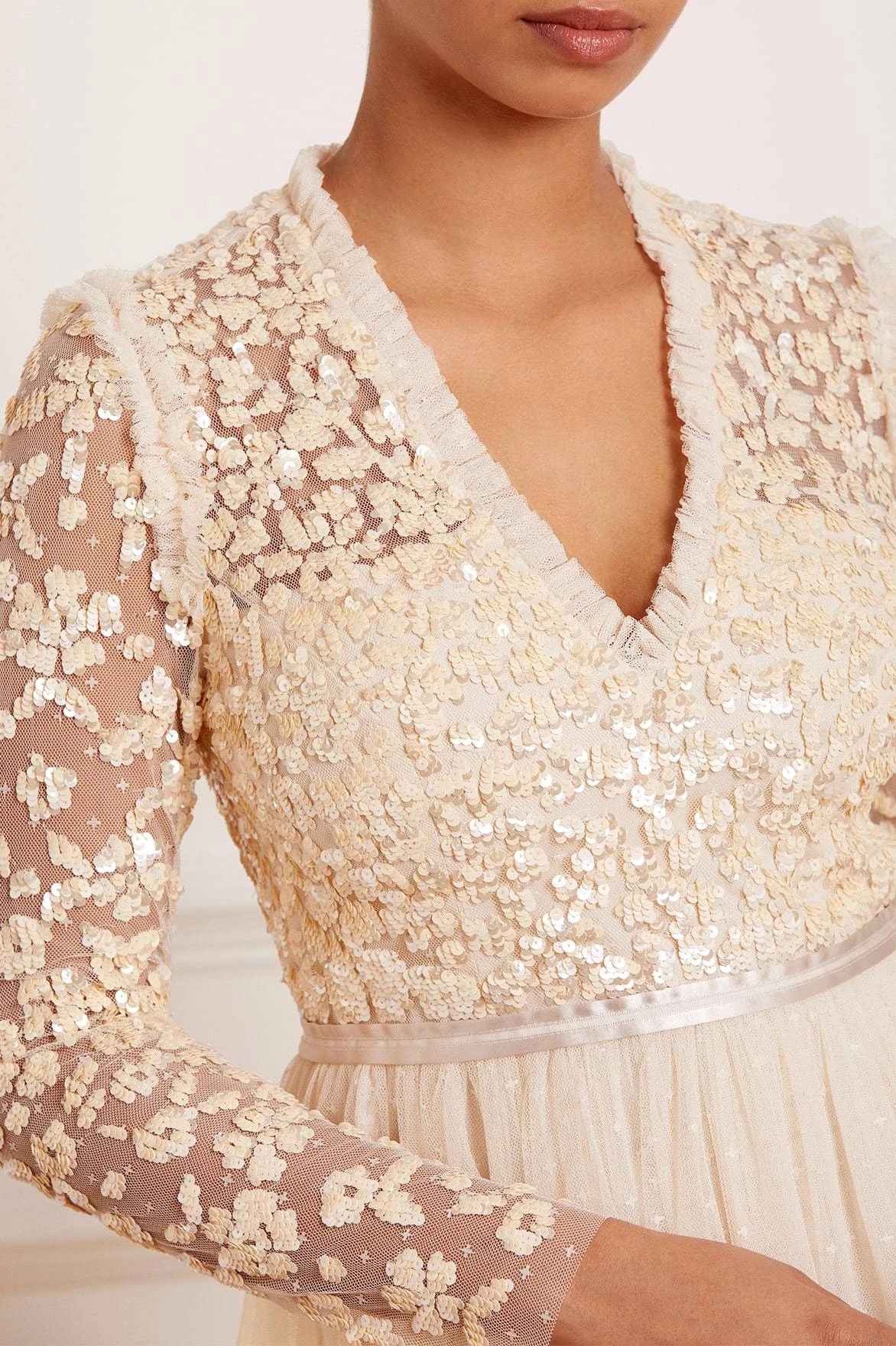 NEEDLE & THREAD EXCLUSIVE. The Amalie Bodice Long Sleeve V-Neck Midi Dress in Champagne. Featuring a bodice decorated with intricate shimmering sequins and floral motifs, this long-sleeved, V-neck dress is designed with a layered tulle skirt featuring ‘x’ motifs throughout, adding subtle texture. Make this dress your new season go-to.