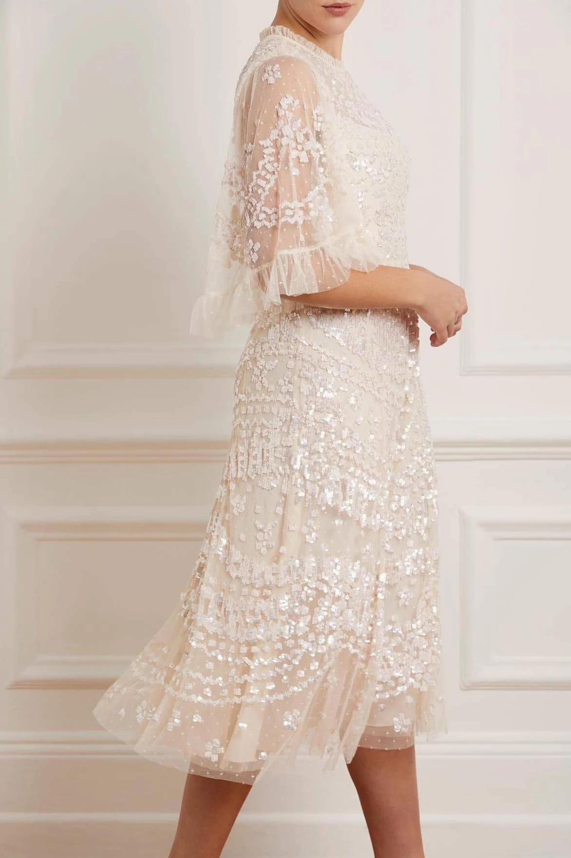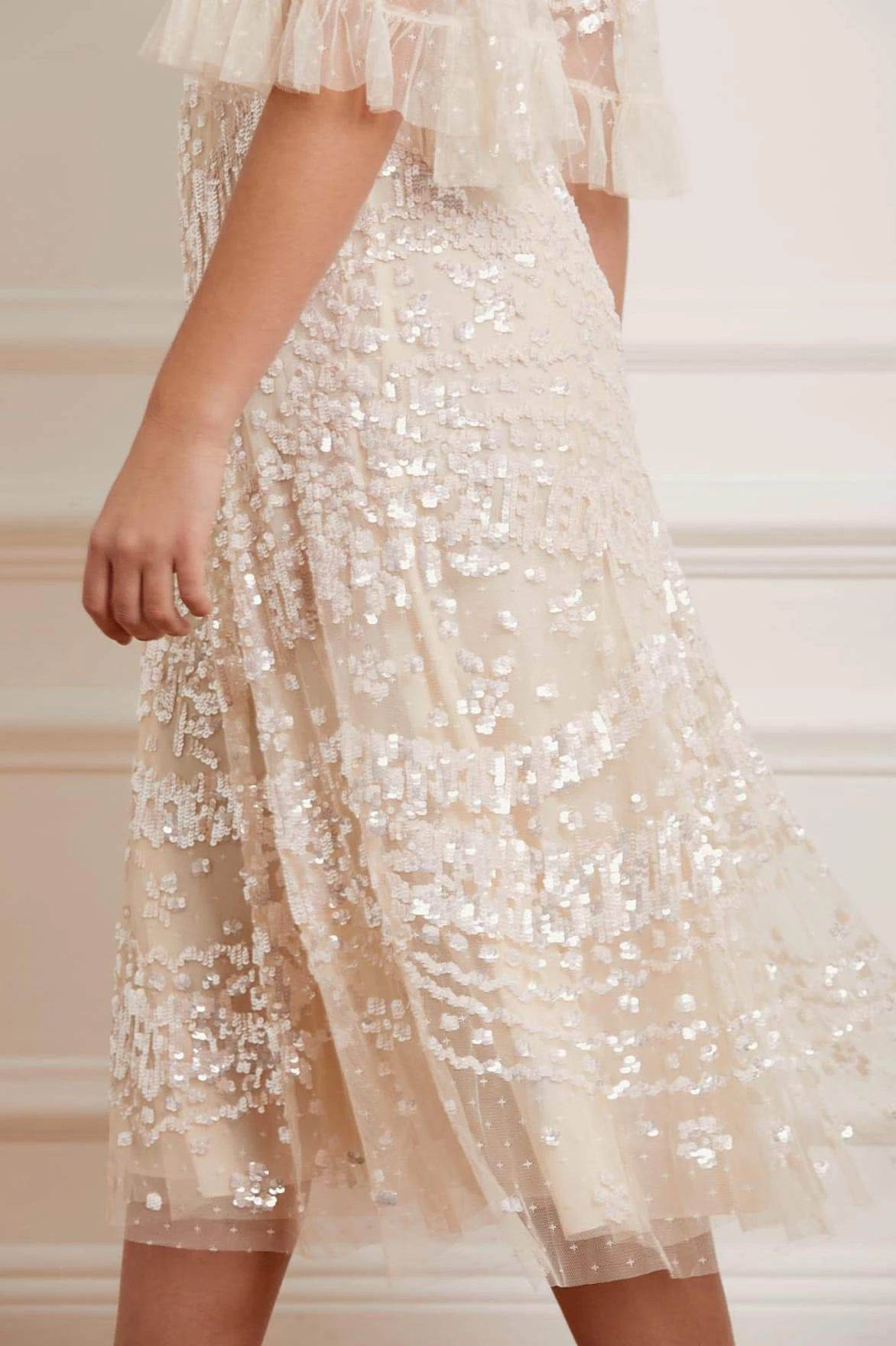 NEEDLE & THREAD EXCLUSIVE | The Anais Sequin Ballerina Dress in Champagne / Pink. This dress is beautifully decorated in sequins, developed from a vintage, French hand-drawn lace design. Crafted with lace floral borders throughout, and pretty, floaty sleeves. The perfect dress for any occasion.