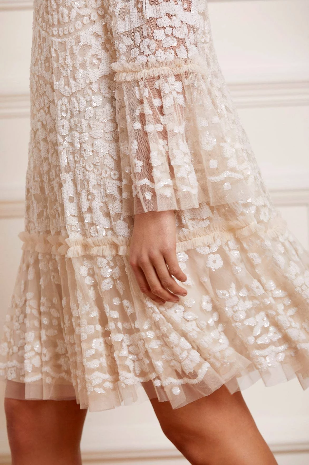 The Annie Sequin Tiered Mini Dress in Champagne. Adorned with shimmering sequins in a floral and bow artwork, this mini dress is inspired by a lace tablecloth. Designed with a loose fit silhouette and tiered throughout, creating beautiful movement. Make an effortless statement.