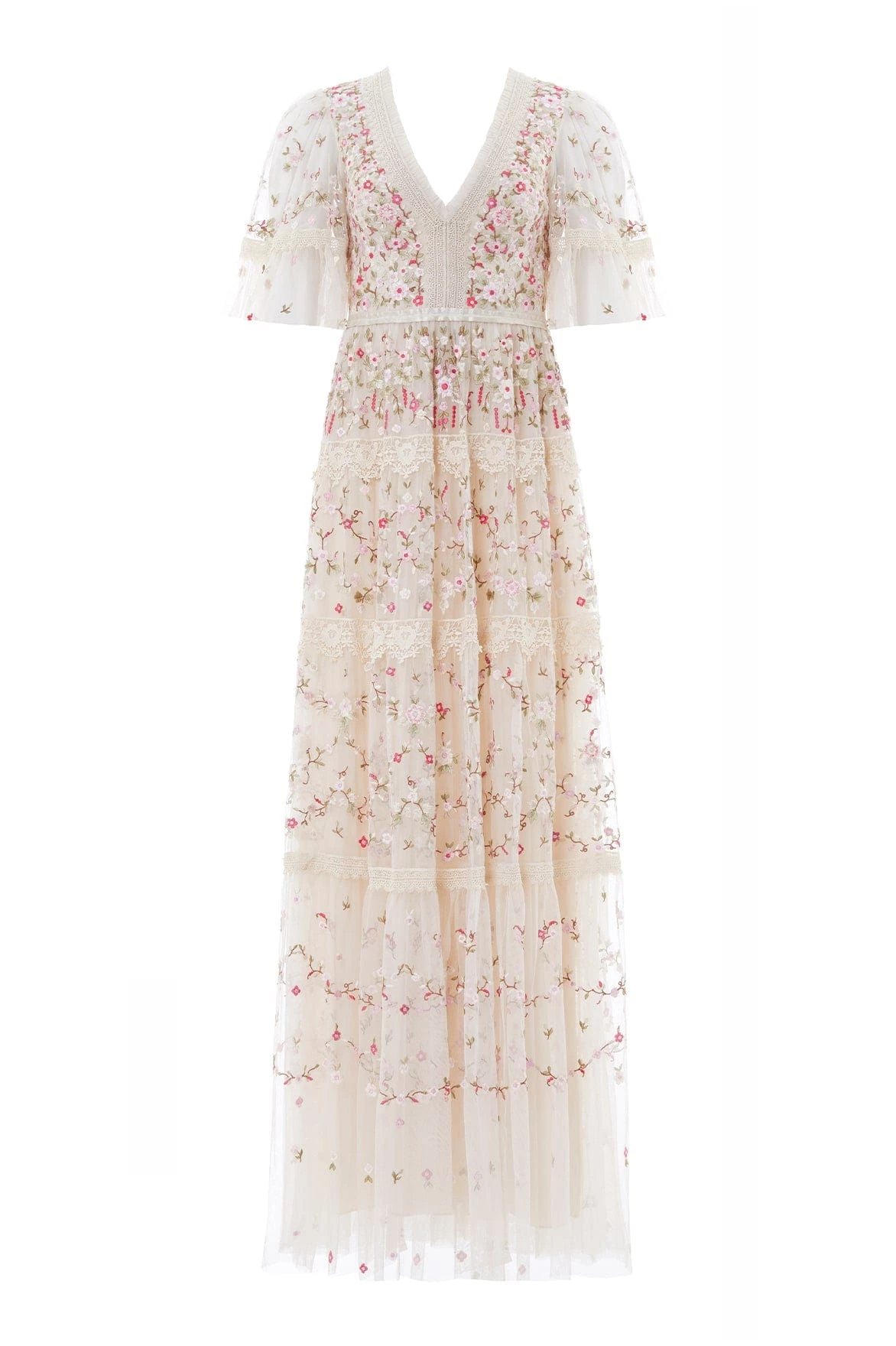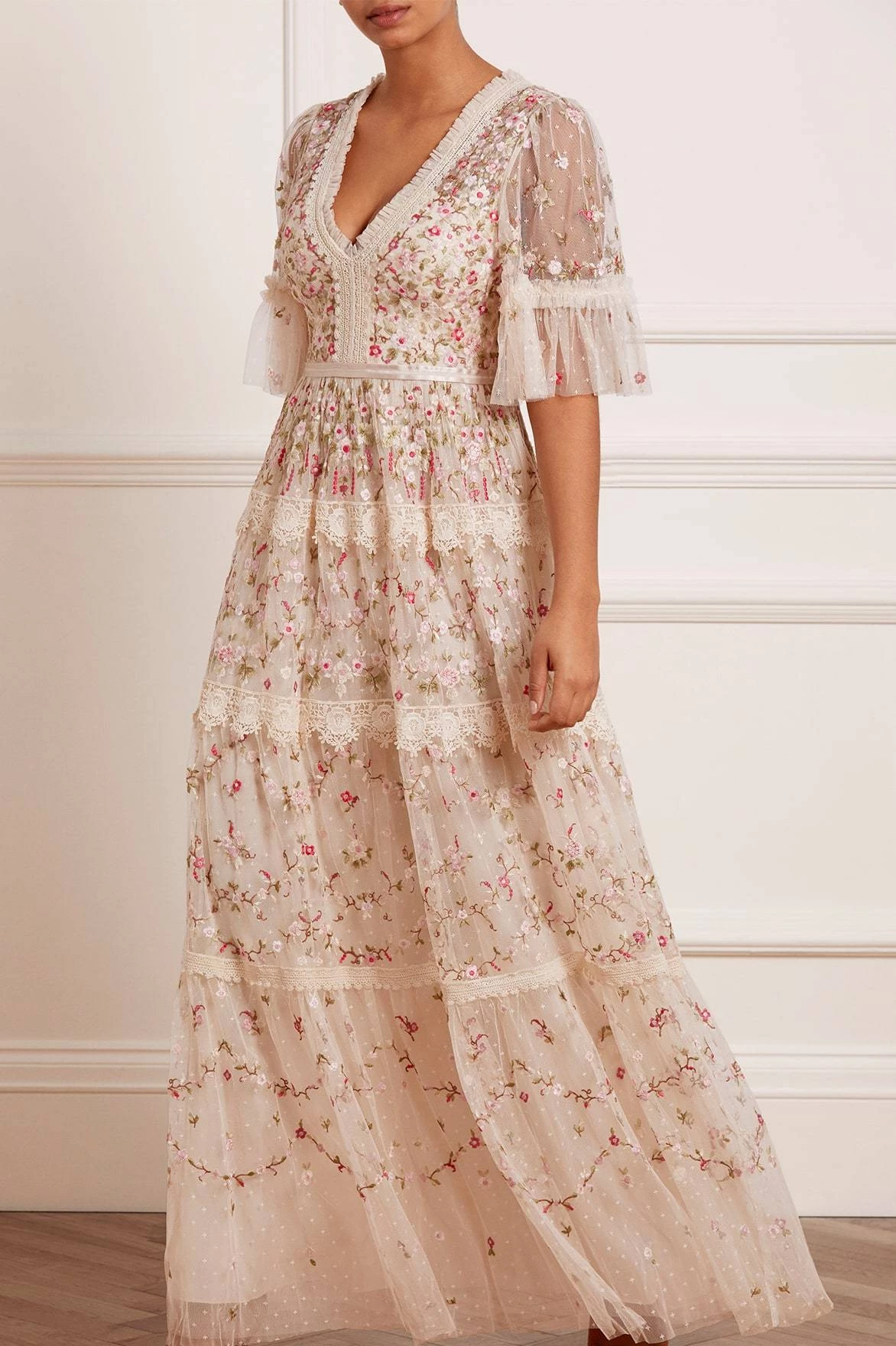 The Araminta Lace Gown in Champagne. Intricately embroidered in a multi-coloured artwork, this gown features lace trim borders. Designed with a flattering V-neckline shaping, lace trims and signature detailing adding romantic texture. The Araminta is perfect for every occasion.