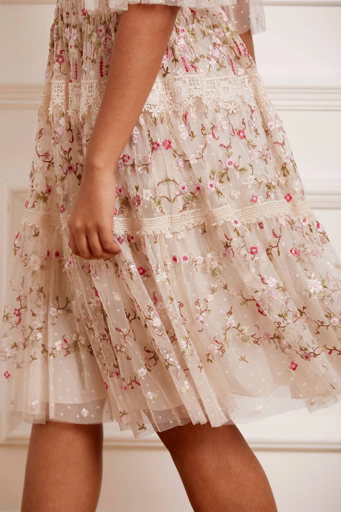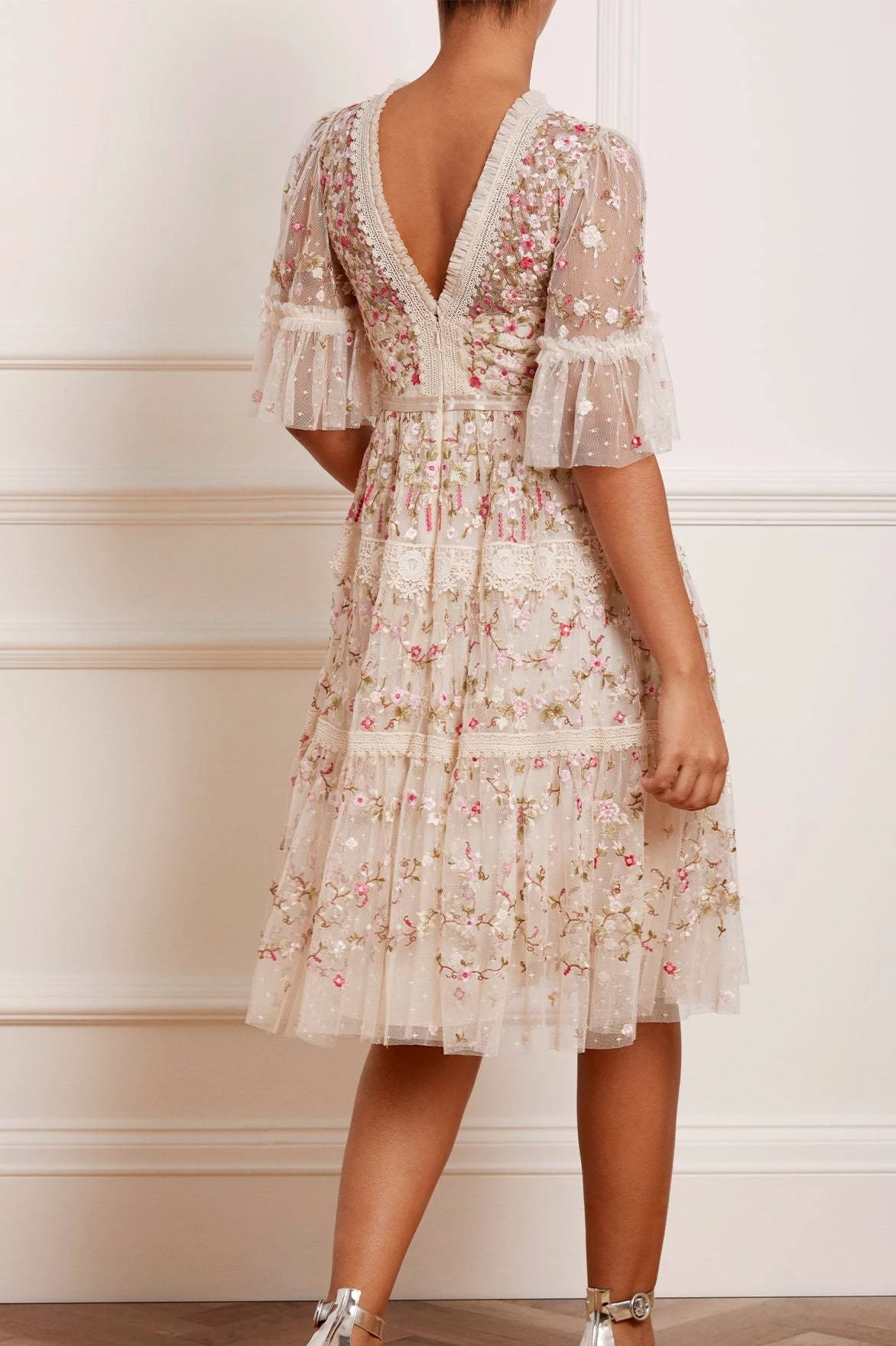 The Araminta Lace Midi Dress in Champagne. Intricately embroidered in a multi-coloured artwork, this midi dress is inspired by lace trim borders. Designed with a flattering V-neckline shaping, lace trims and signature detailing adding romantic texture. The Araminta is perfect for every occasion.