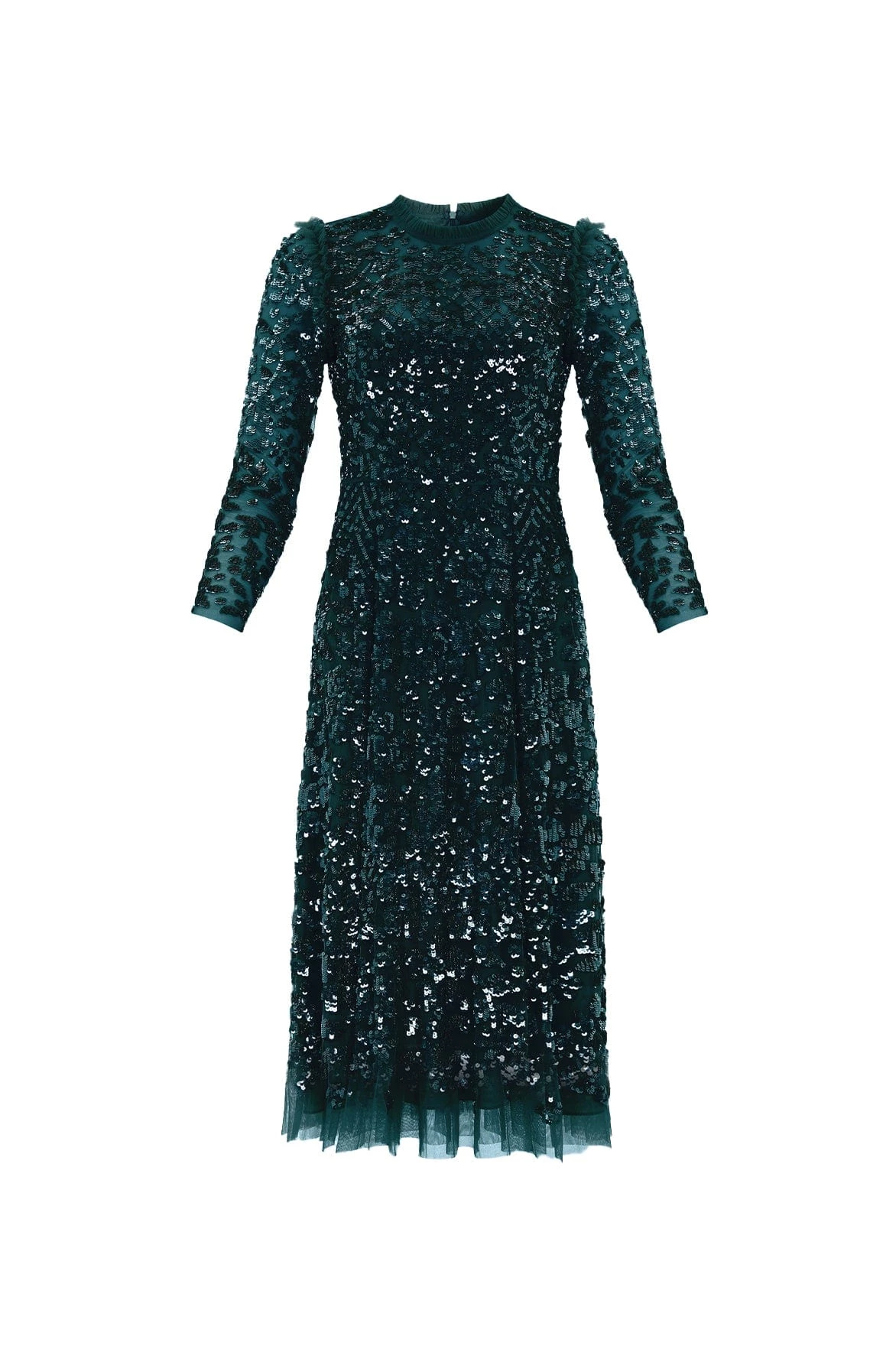 NEW SEASON | NEEDLE & THREAD EXCLUSIVE. The Aurelia Long Sleeve Ballerina Dress in Emerald Green. This ballerina dress is designed beautifully in a floral lace artwork inspired by a vintage lace tablecloth. This embellished dress is decorated with shimmering tonal sequins creating sparkle as you walk. Designed romantically with long sleeves, a playful silhouette and feminine detailing throughout. Expect all eyes on you in this statement piece.