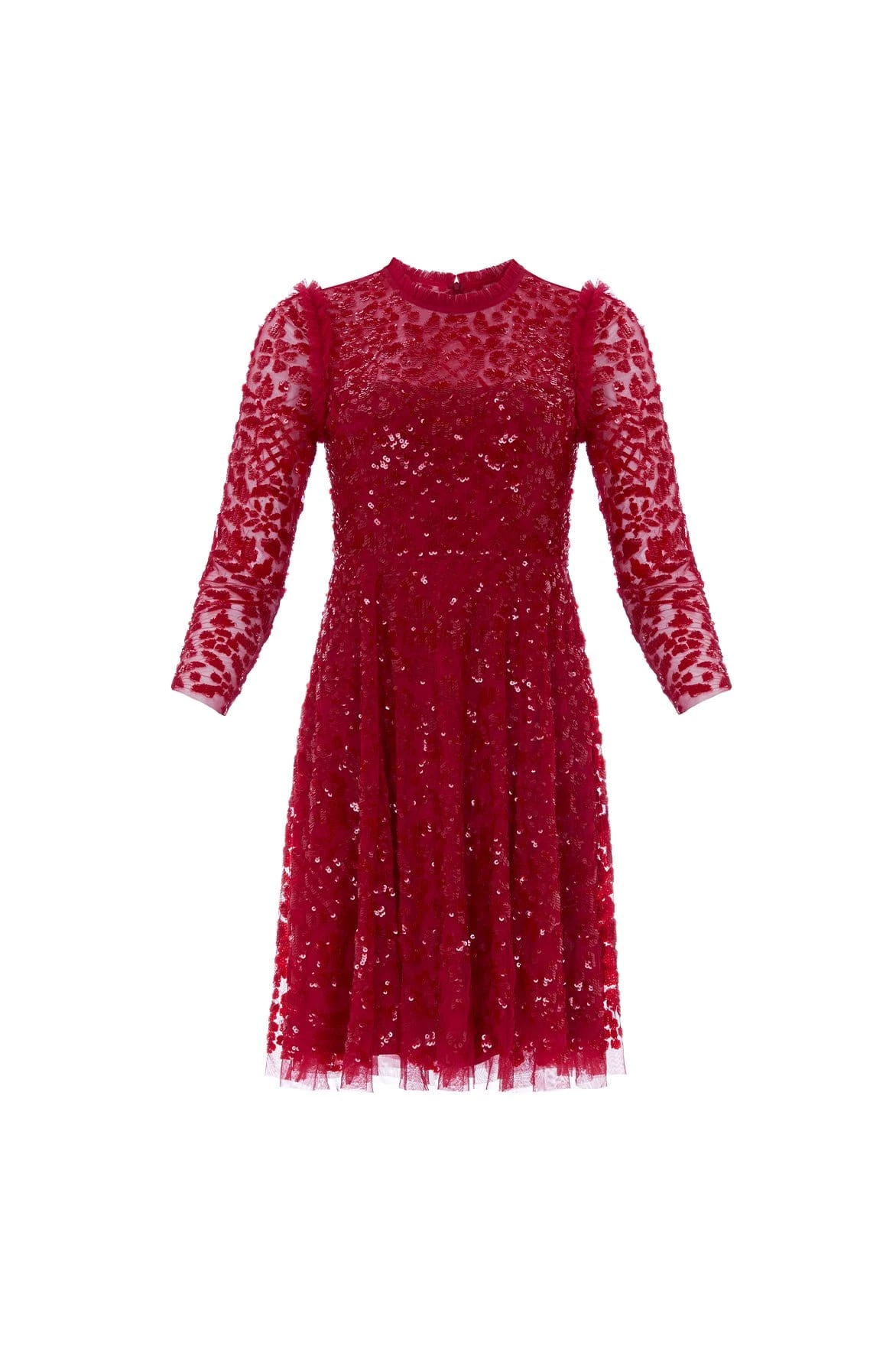 NEEDLE & THREAD EXCLUSIVE. The Aurelia Long Sleeve Mini Dress in Deep Red. This Needle & Thread signature style is beautifully designed with floral lace artwork inspired by a vintage tablecloth. Adorned with shimmering sequins and soft tulle frills in romantic, deep red. Perfect for making an entrance.