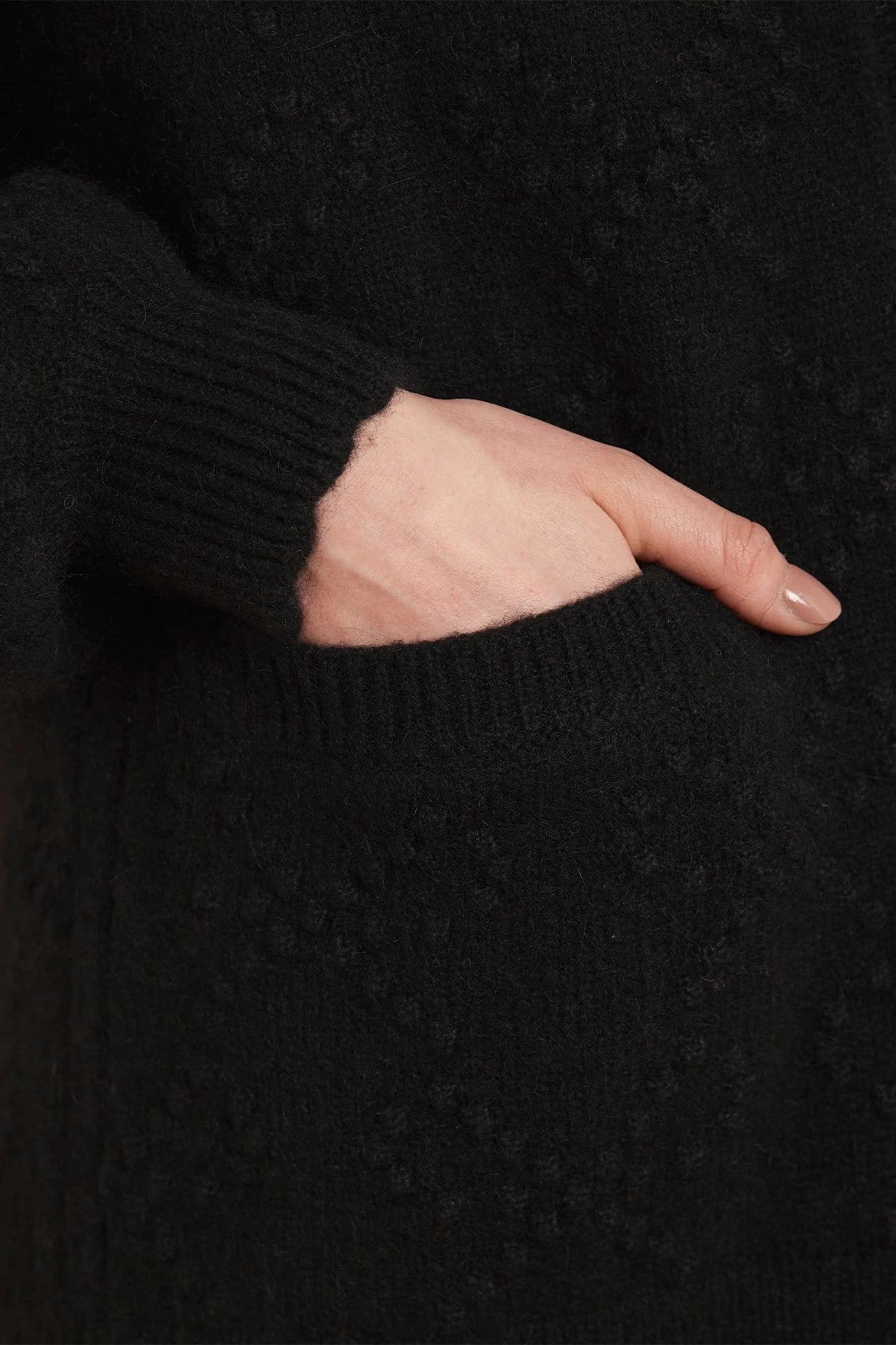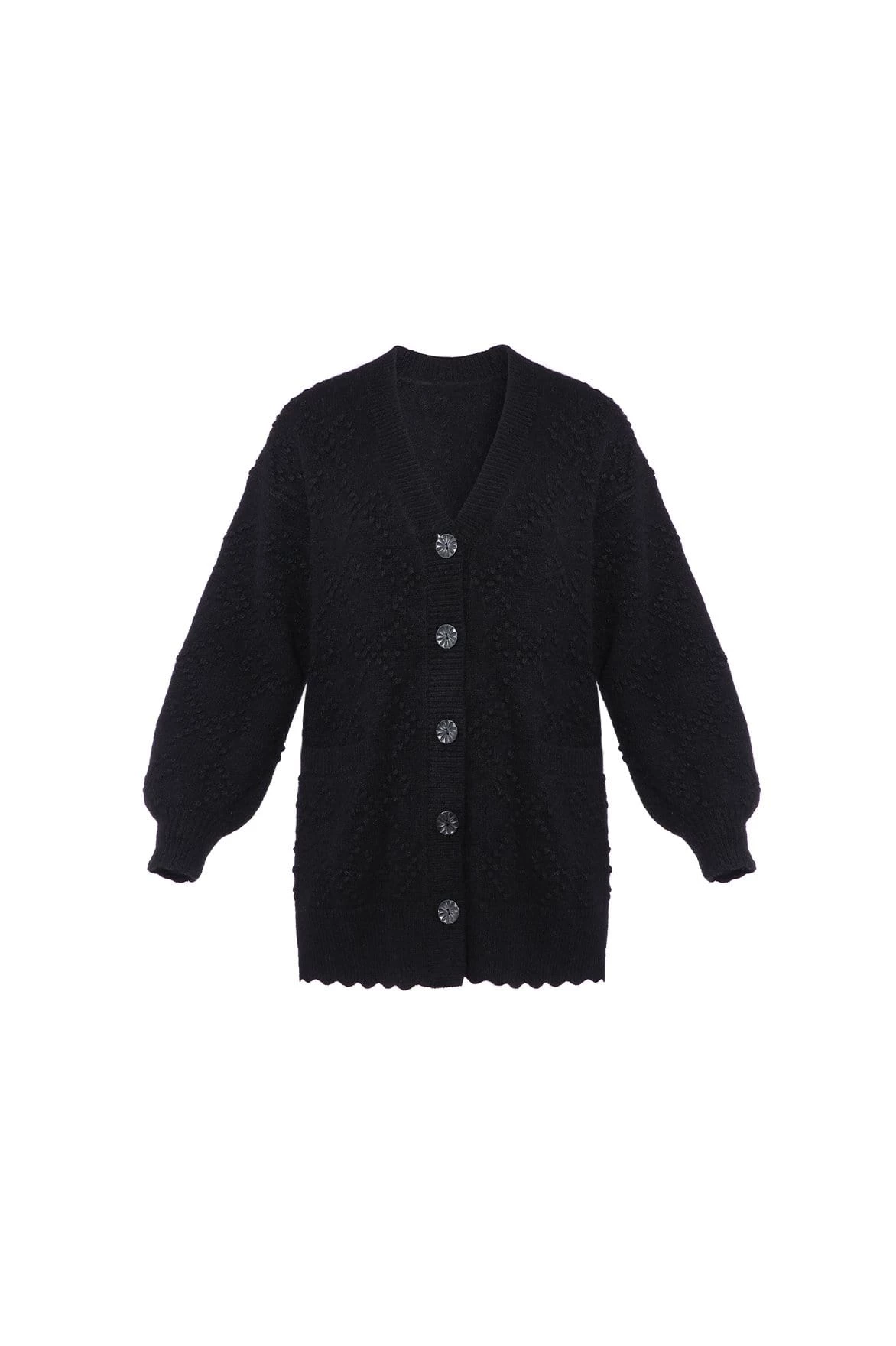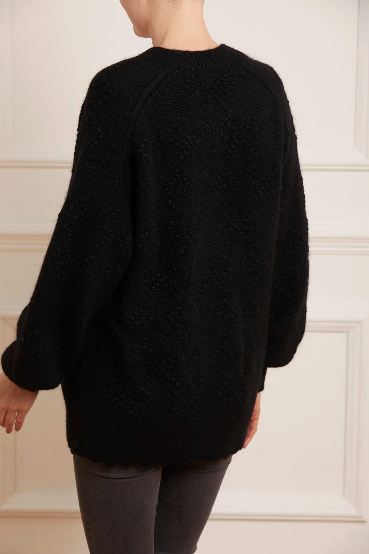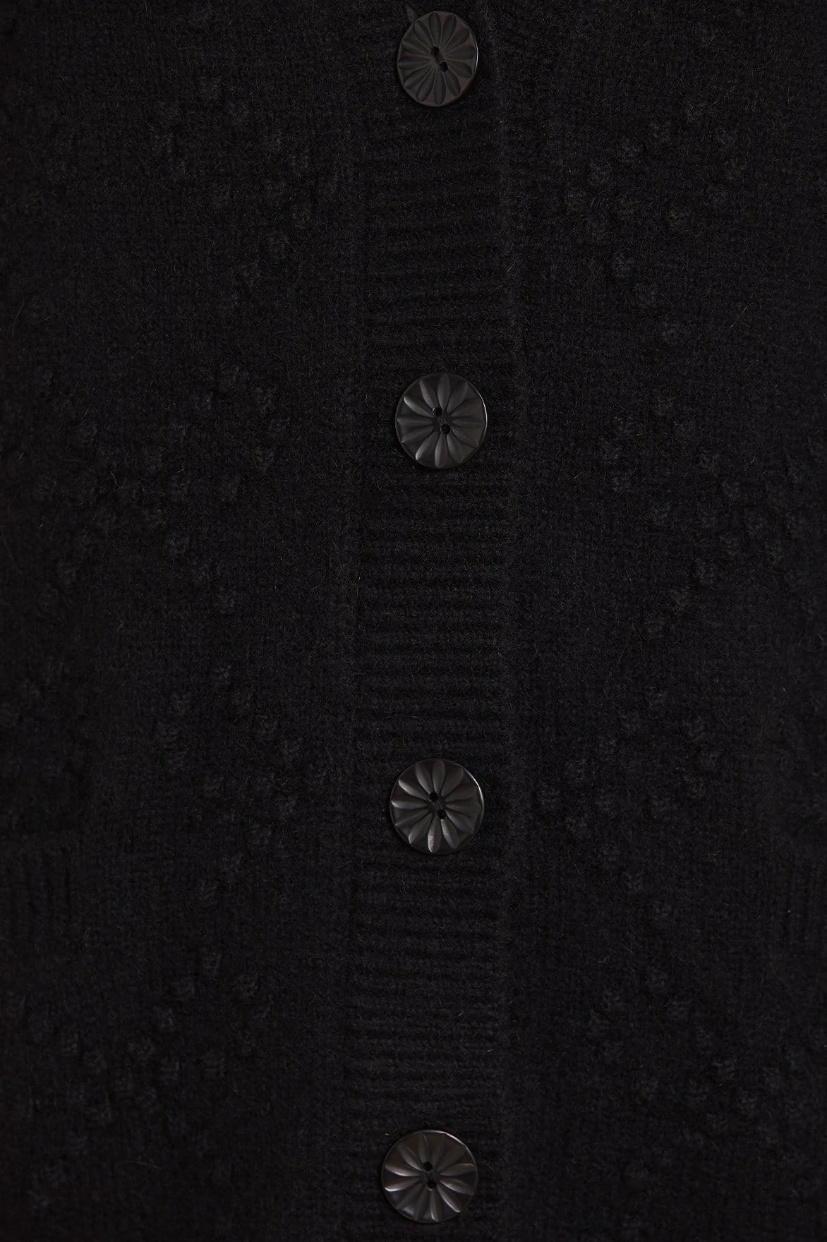 NEW SEASON | The Bow Stitch Longline Cardigan in Black. Developed in soft alpaca yarn creating a fluffy feel texture. Decorated with bobble stitches and romantic bow motifs creating a playful piece. This comfortable knit is designed with an oversized fit, making it the perfect layering piece. Beautifully fitted with vintage sourced buttons with an intricate embossed design. The perfect everyday piece.