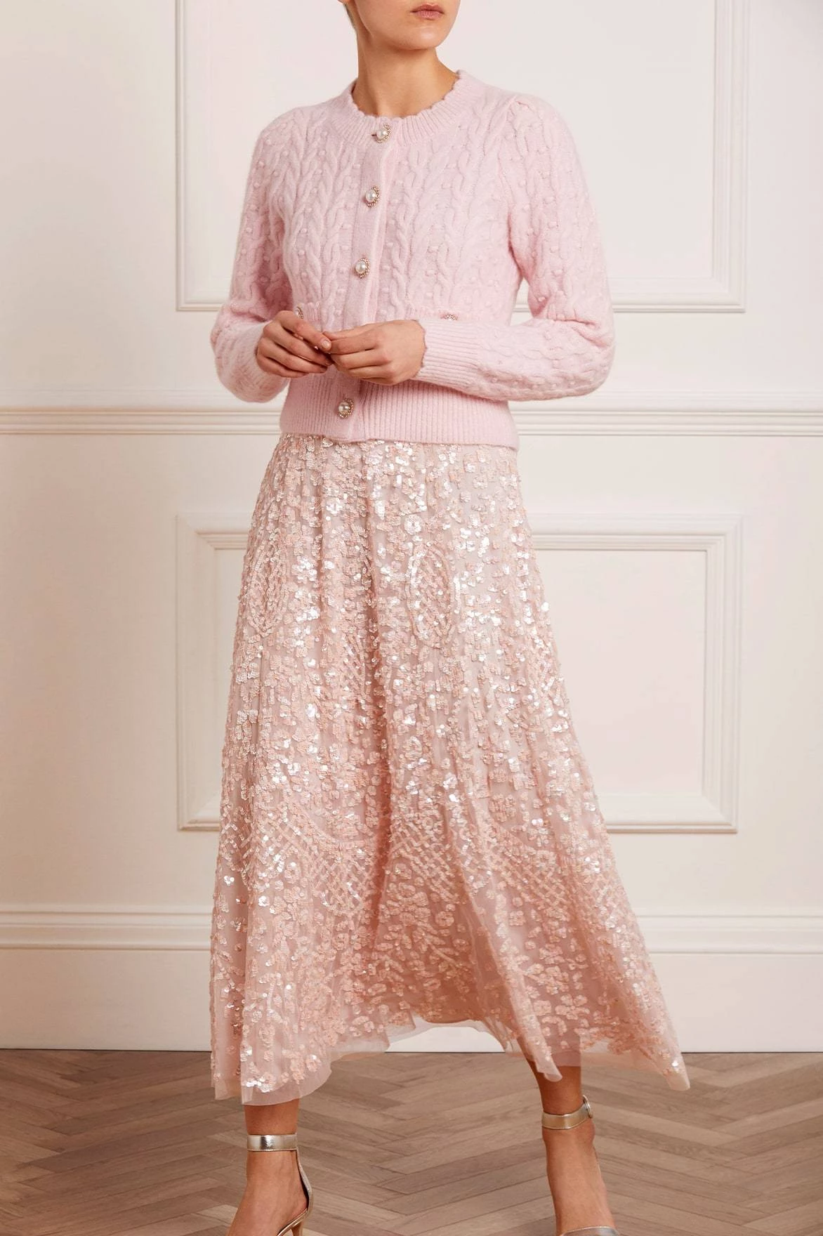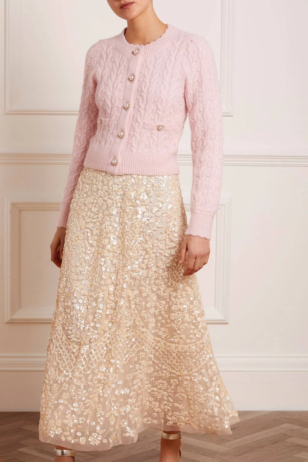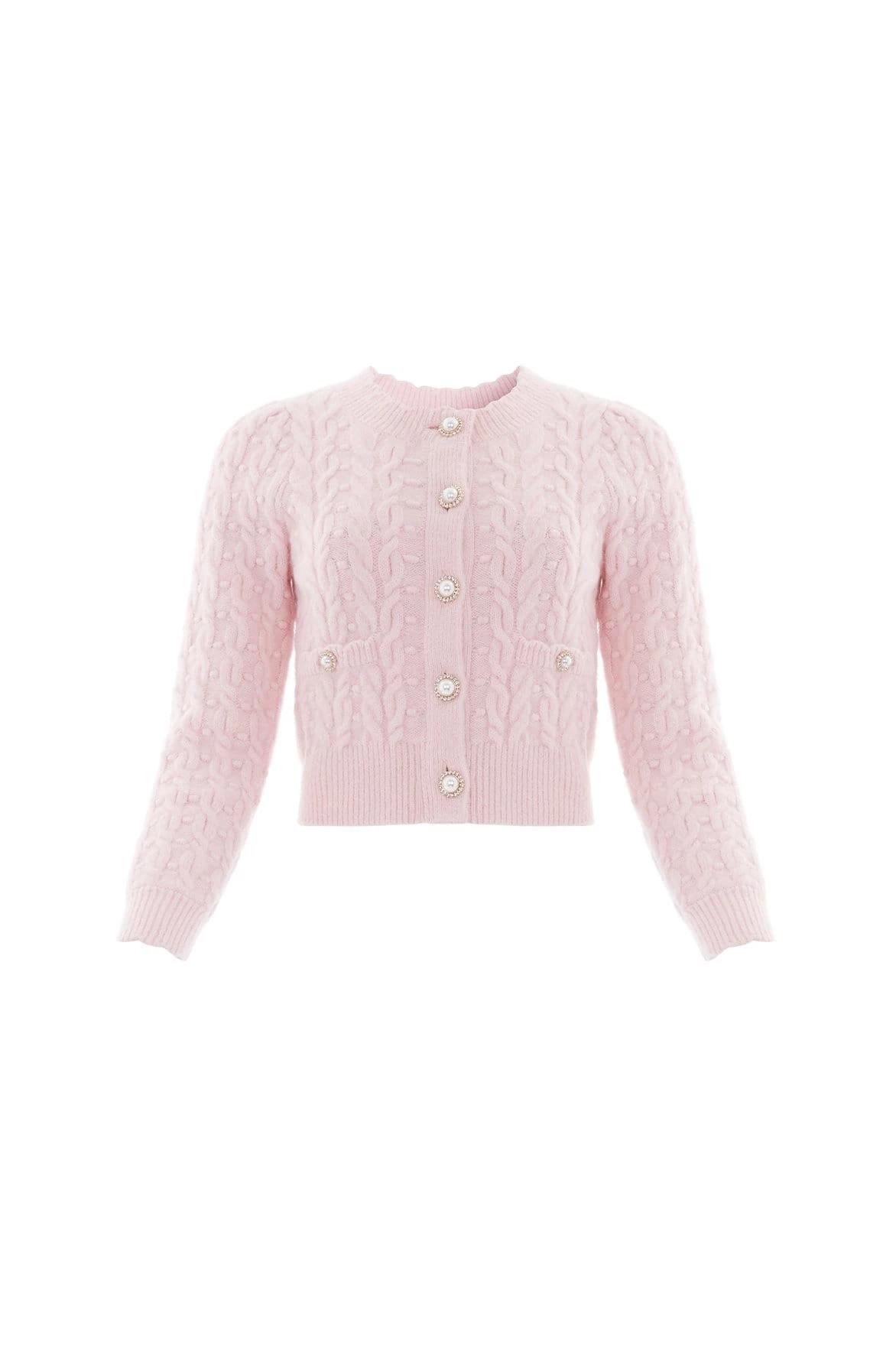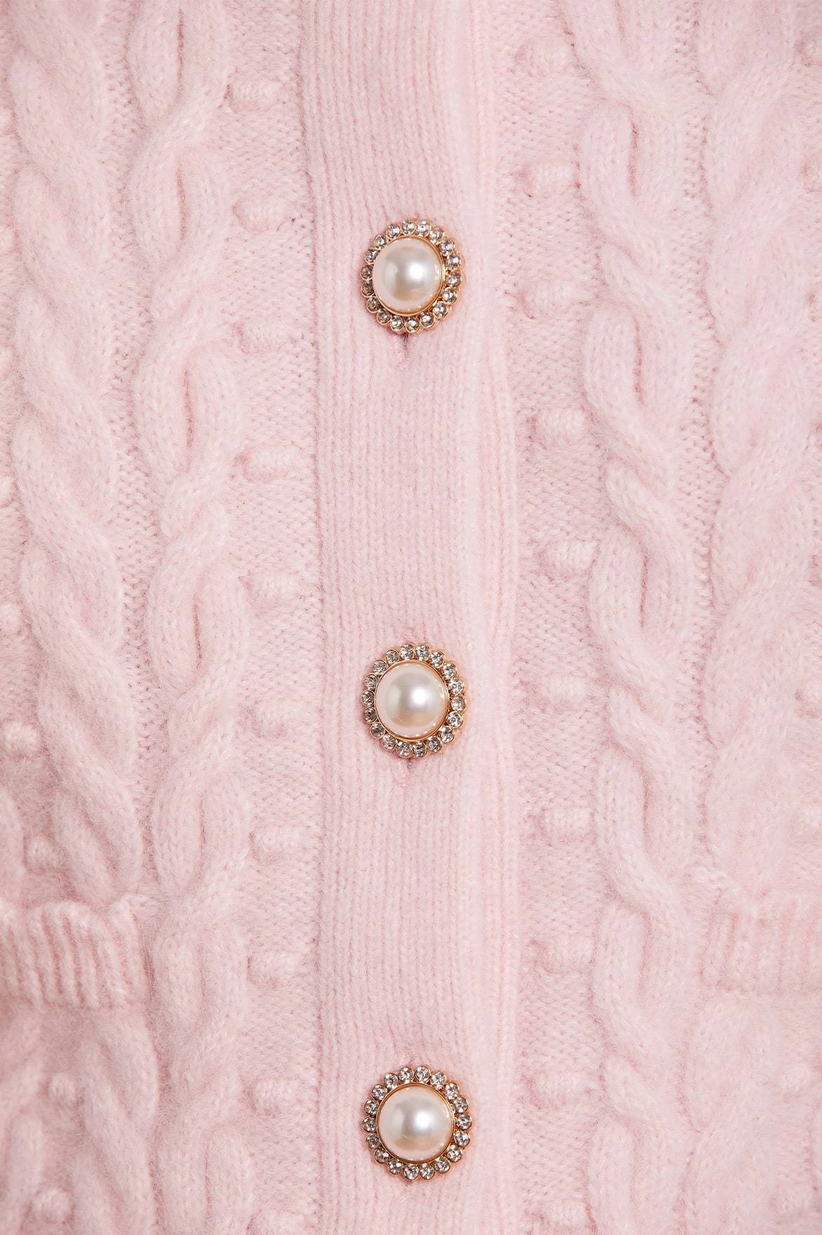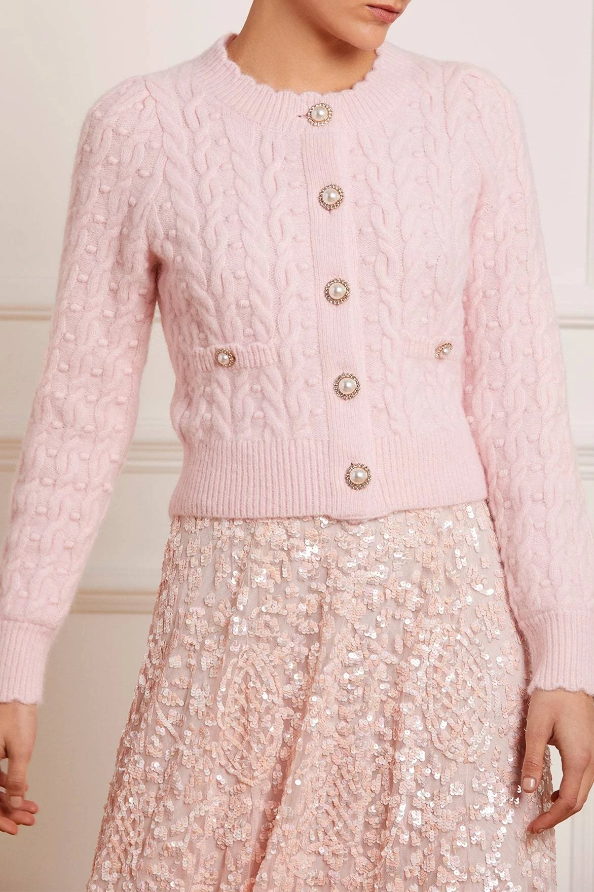NEEDLE & THREAD EXCLUSIVE. The Cable Bobble Short Cardigan in Petal Pink. This cardigan is crafted from soft alpaca yarn, resulting in a cosy, fluffy texture. Featuring intricate cables and bobbles to create a substantial, deeply tactile knit. Designed with faux pockets, crystal buttons and scallop detailing. Make this style a new wardrobe favourite.