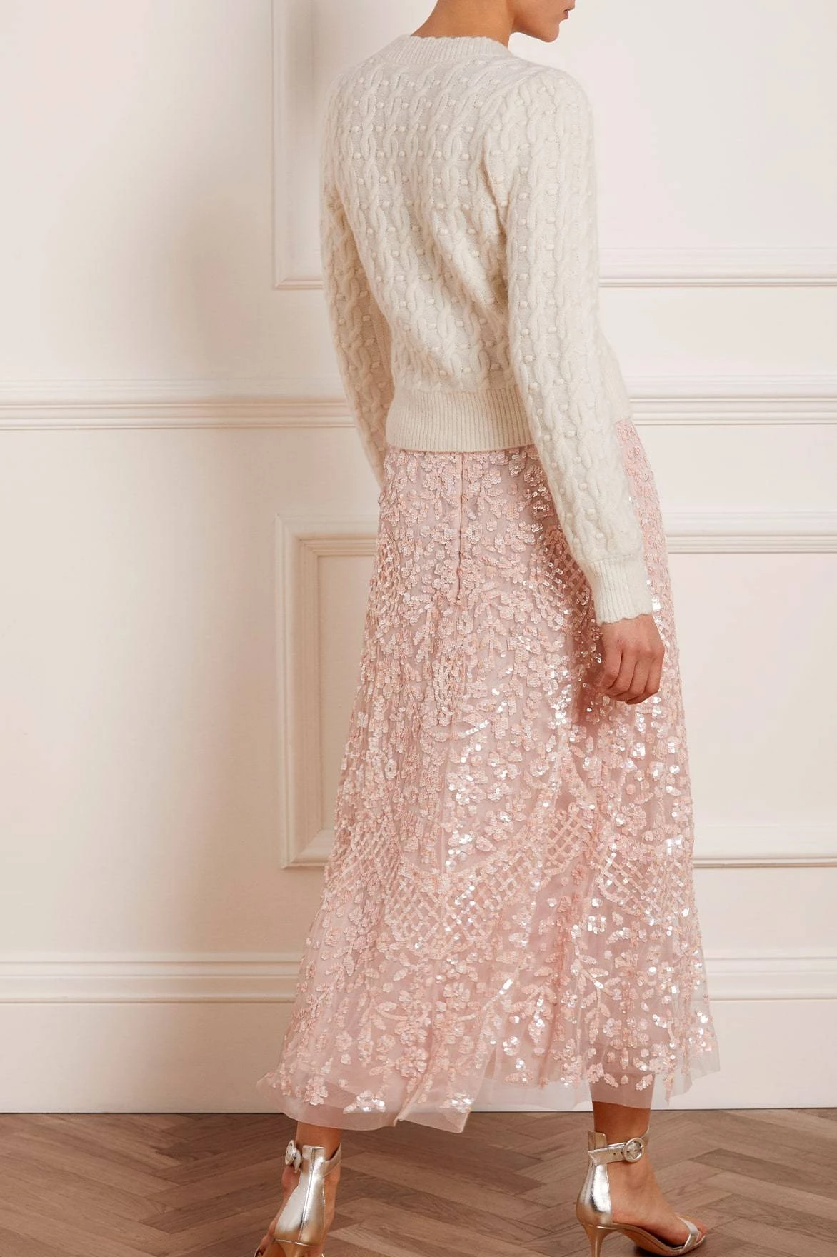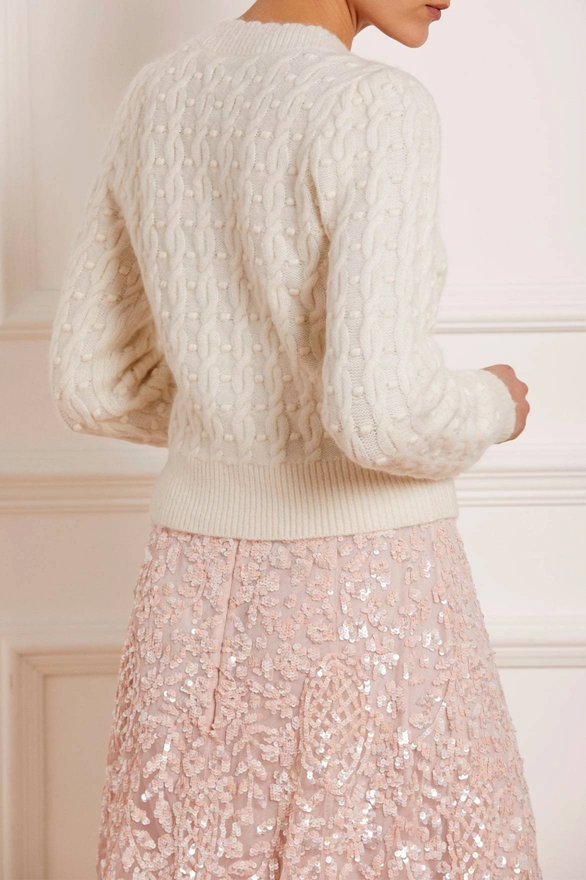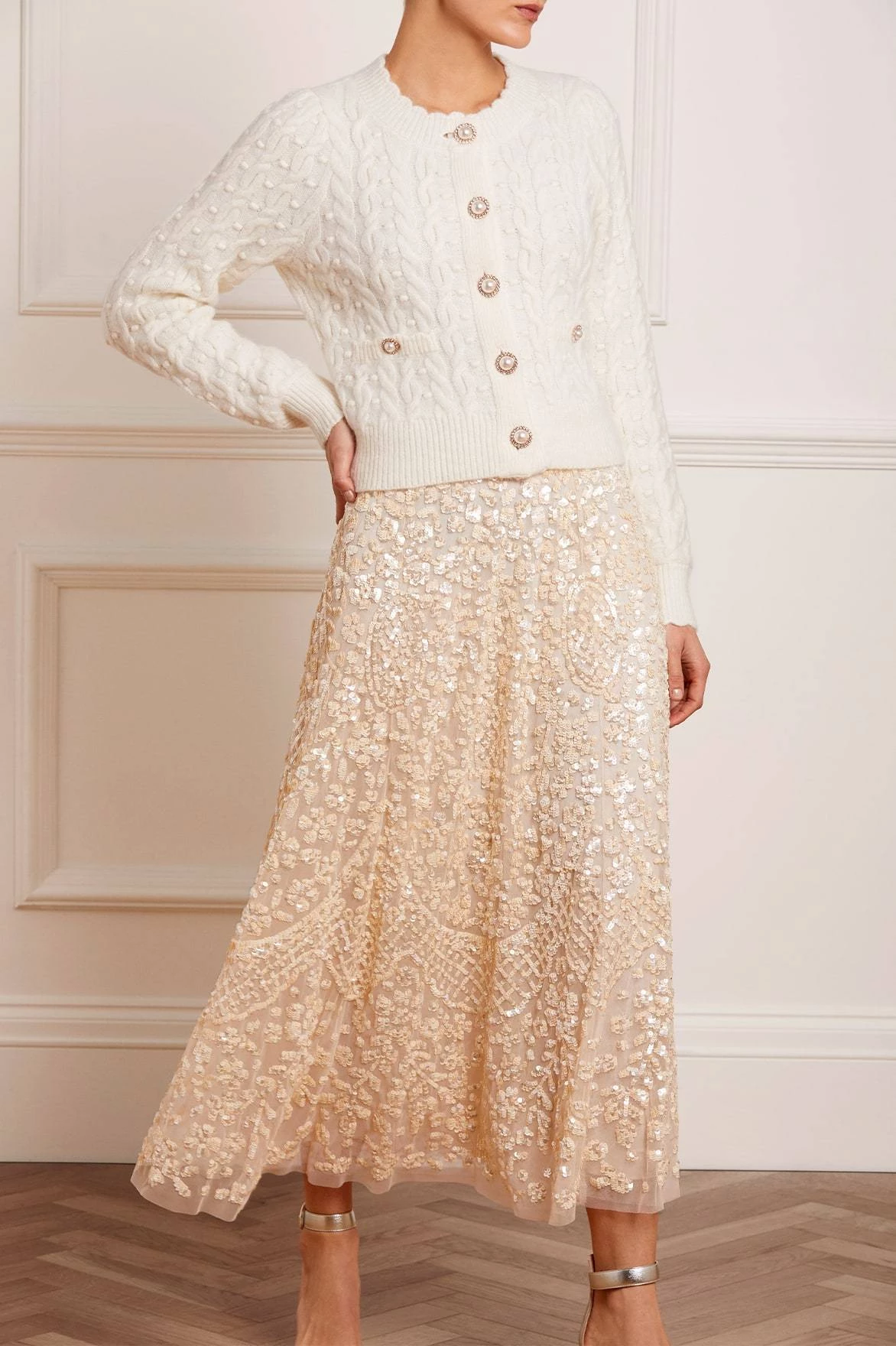 NEEDLE & THREAD EXCLUSIVE. The Cable Bobble Short Cardigan in Champagne. This cardigan is crafted from soft alpaca yarn, resulting in a cosy, fluffy texture. Featuring intricate cables and bobbles to create a substantial, deeply tactile knit. Designed with faux pockets, crystal buttons and scallop detailing. Make this style a new wardrobe favourite.