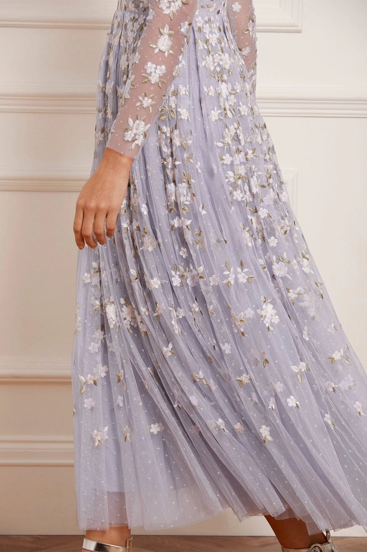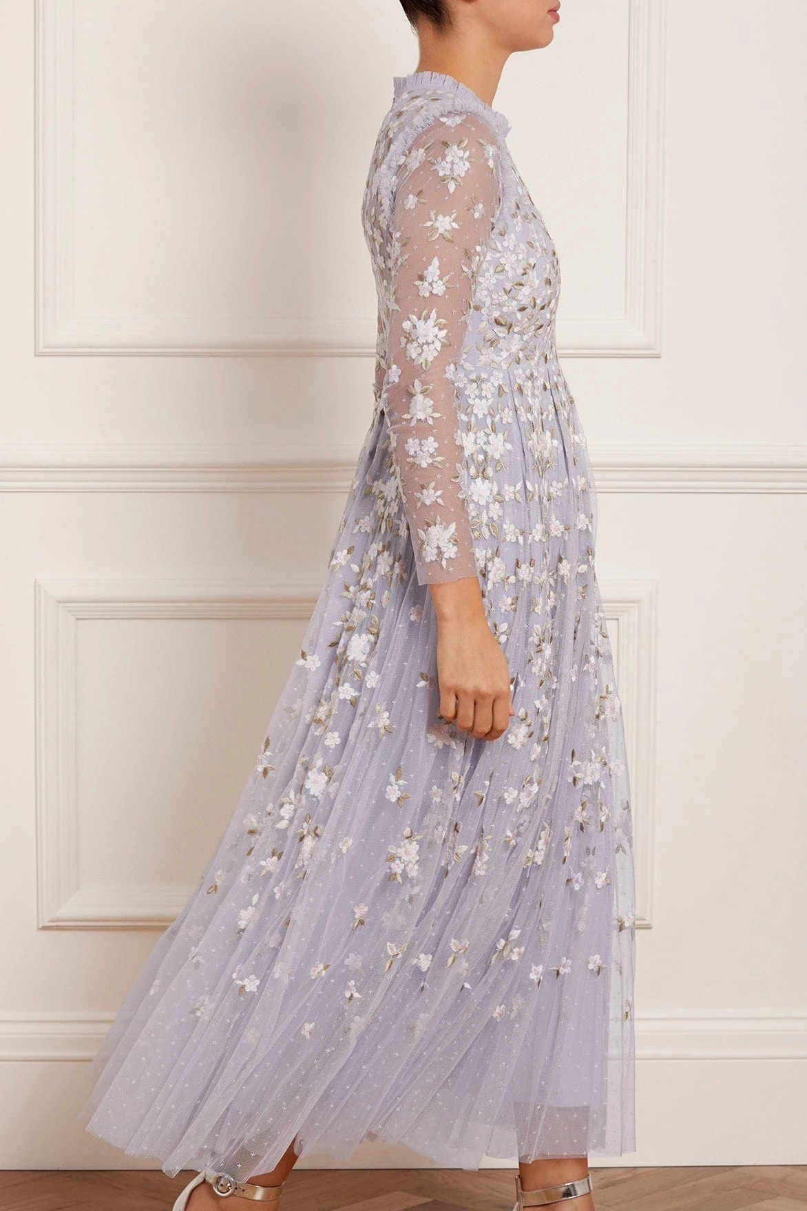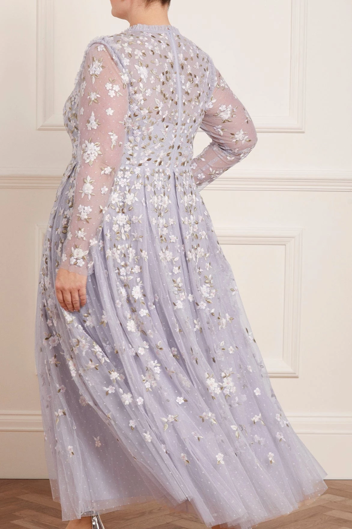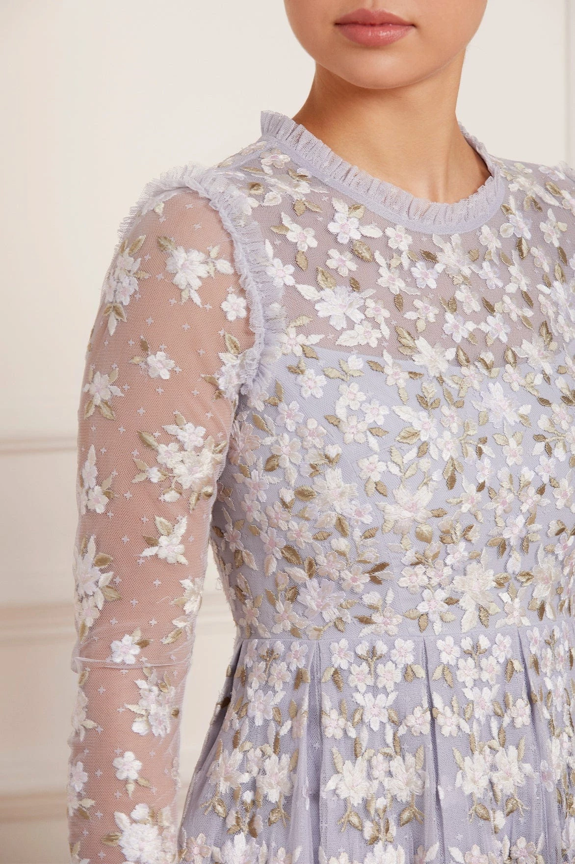NEW SEASON. The Camellia Ditsy Ankle Gown in Porcelain Blue. A beautifully classic Needle & Thread style. The artwork of this gown is embroidered with floral motifs on soft, pretty tulle. This gown features a full pleated skirt, creating a voluminous shape for added movement. A truly timeless piece.