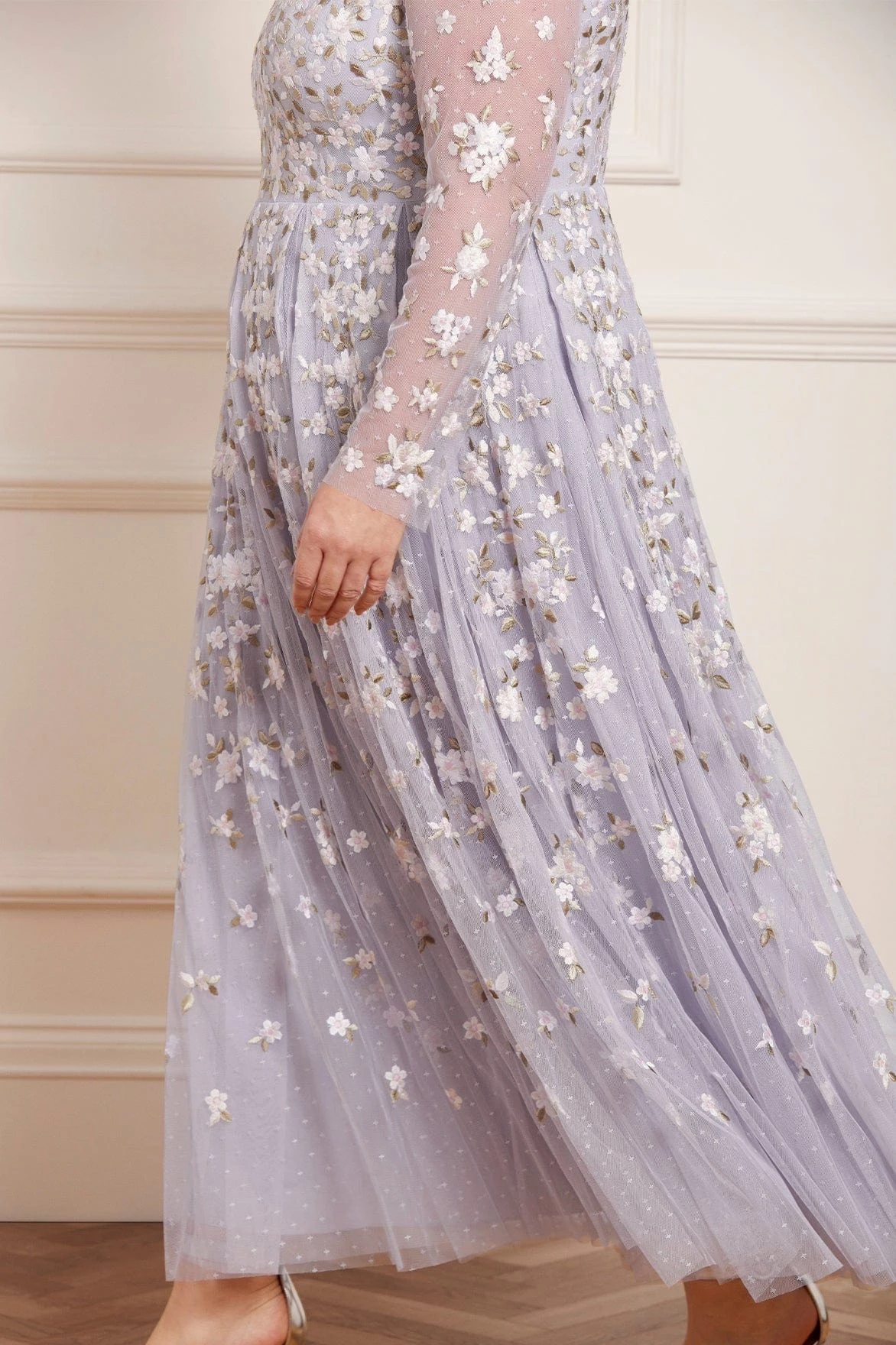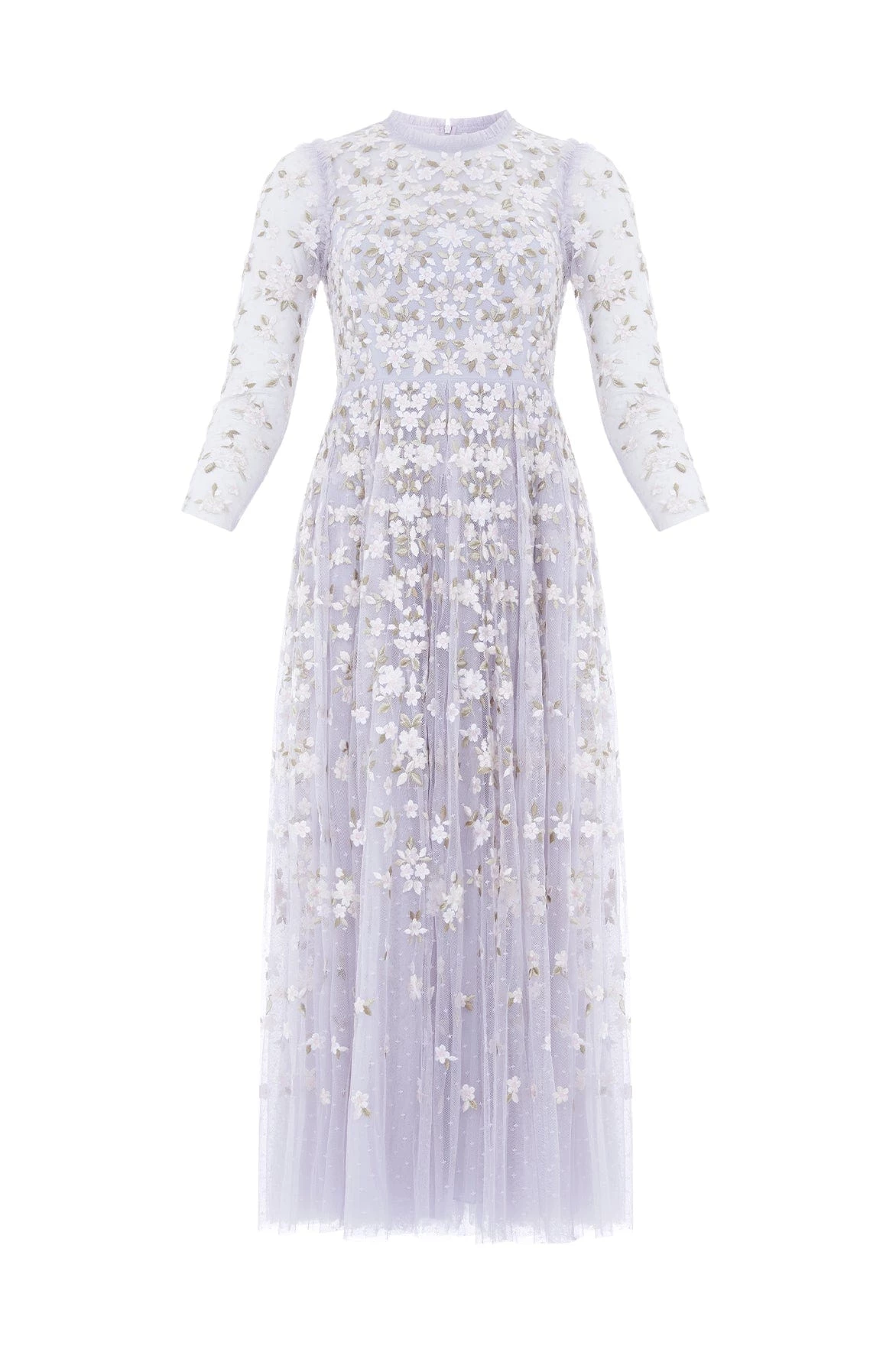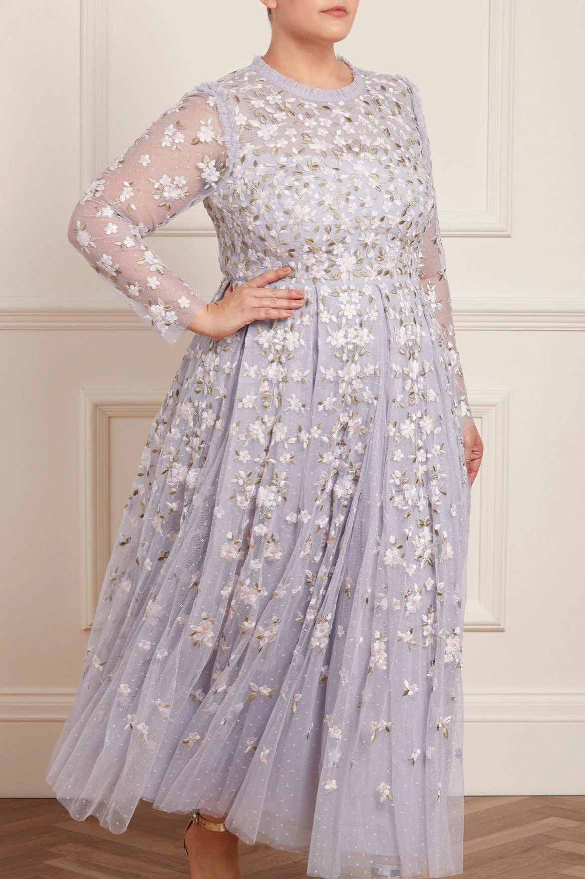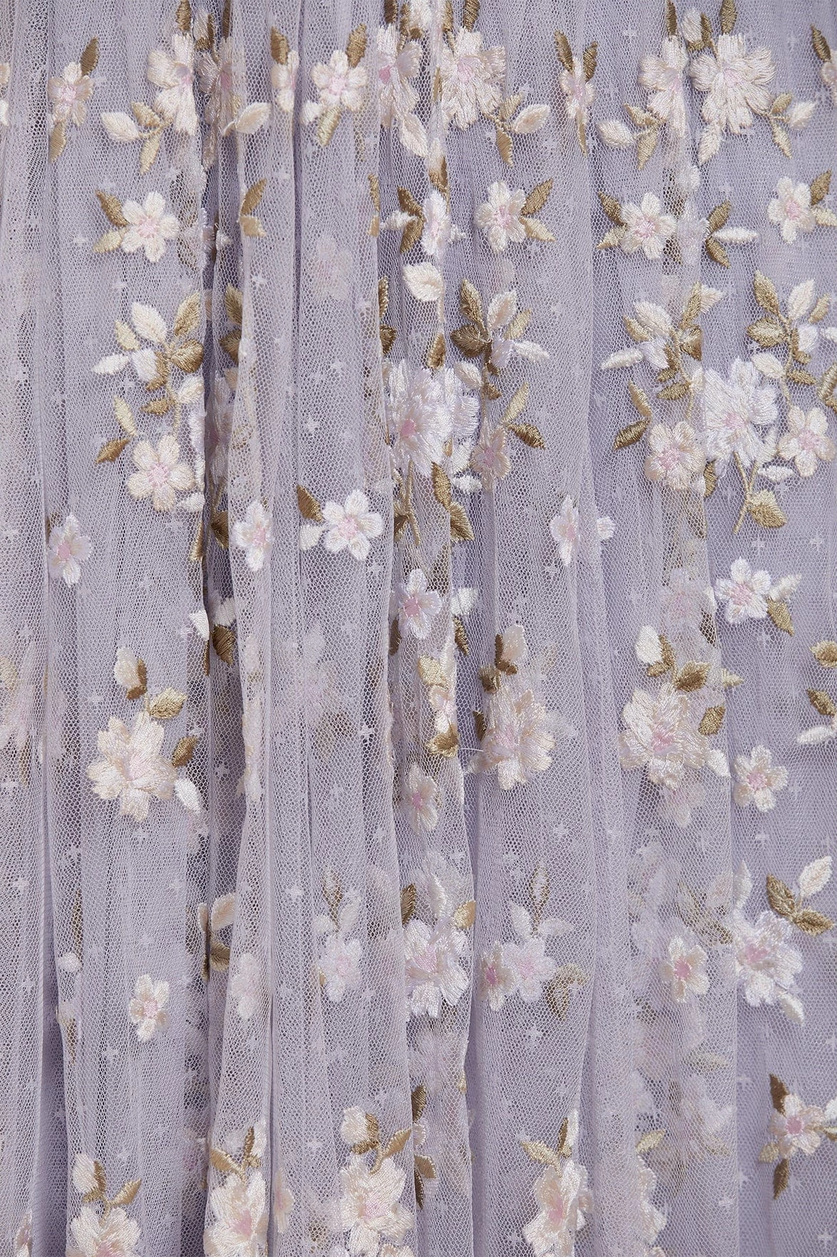 NEW SEASON. The Camellia Ditsy Ankle Gown in Porcelain Blue. A beautifully classic Needle & Thread style. The artwork of this gown is embroidered with floral motifs on soft, pretty tulle. This gown features a full pleated skirt, creating a voluminous shape for added movement. A truly timeless piece.