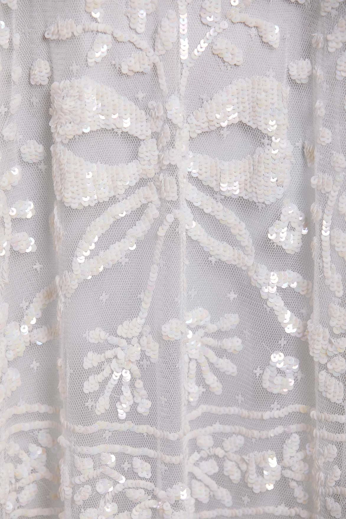 NEEDLE & THREAD EXCLUSIVE. The Celia Long Sleeve Ankle Gown in Ice Blue. This statement gown is designed with romantic artwork featuring ornate florals, ribbon bows densely filled with shimmering ivory sequins and exquisite detailing. Crafted to produce an effortless, loose fit with soft, playful tulle frills on the hem and cuffs. A key piece in our collection.