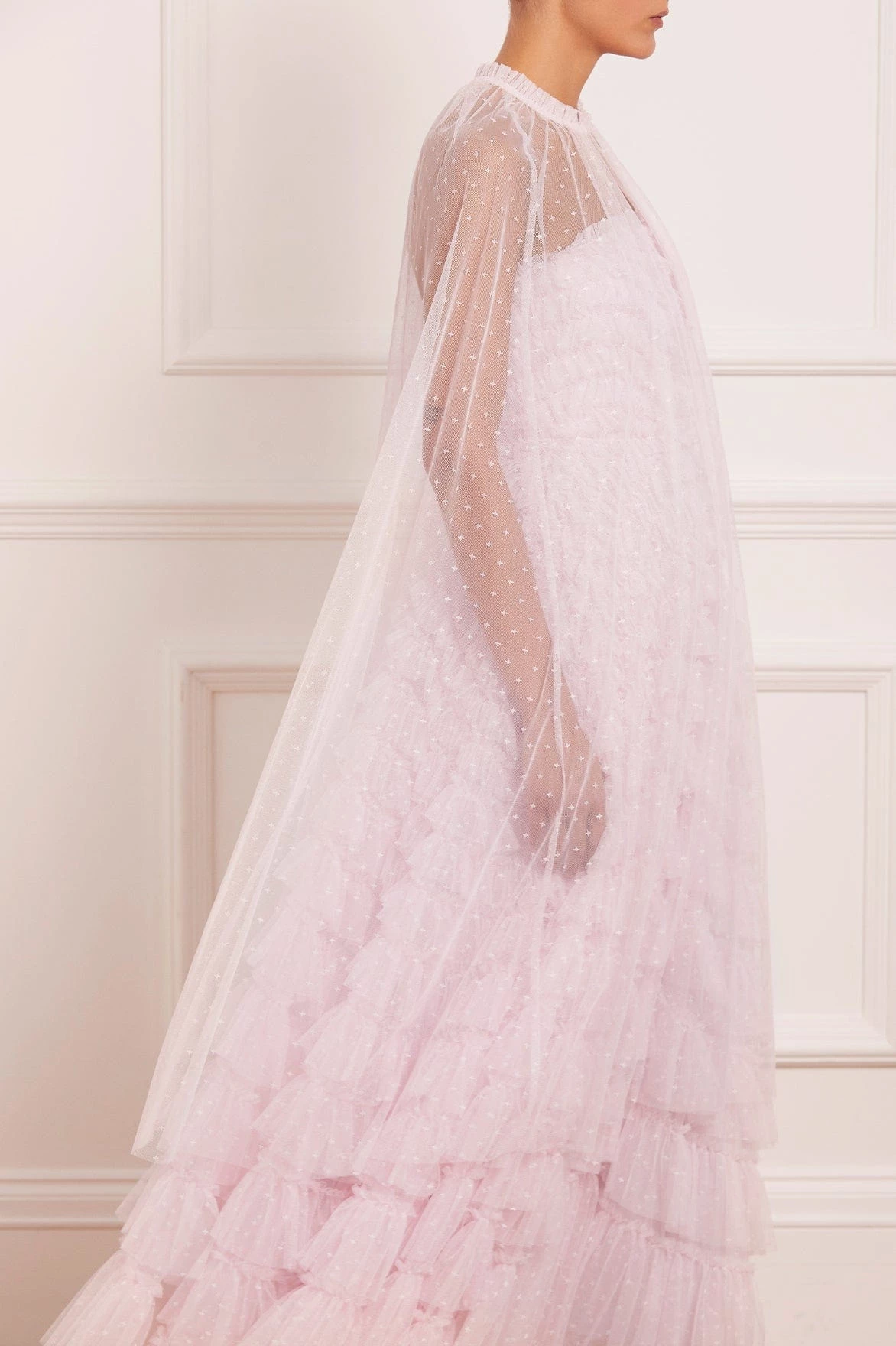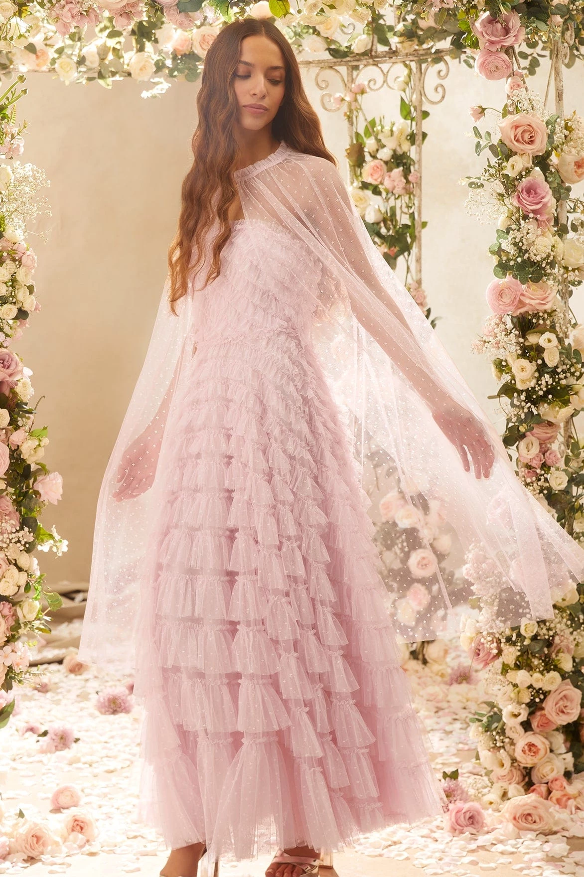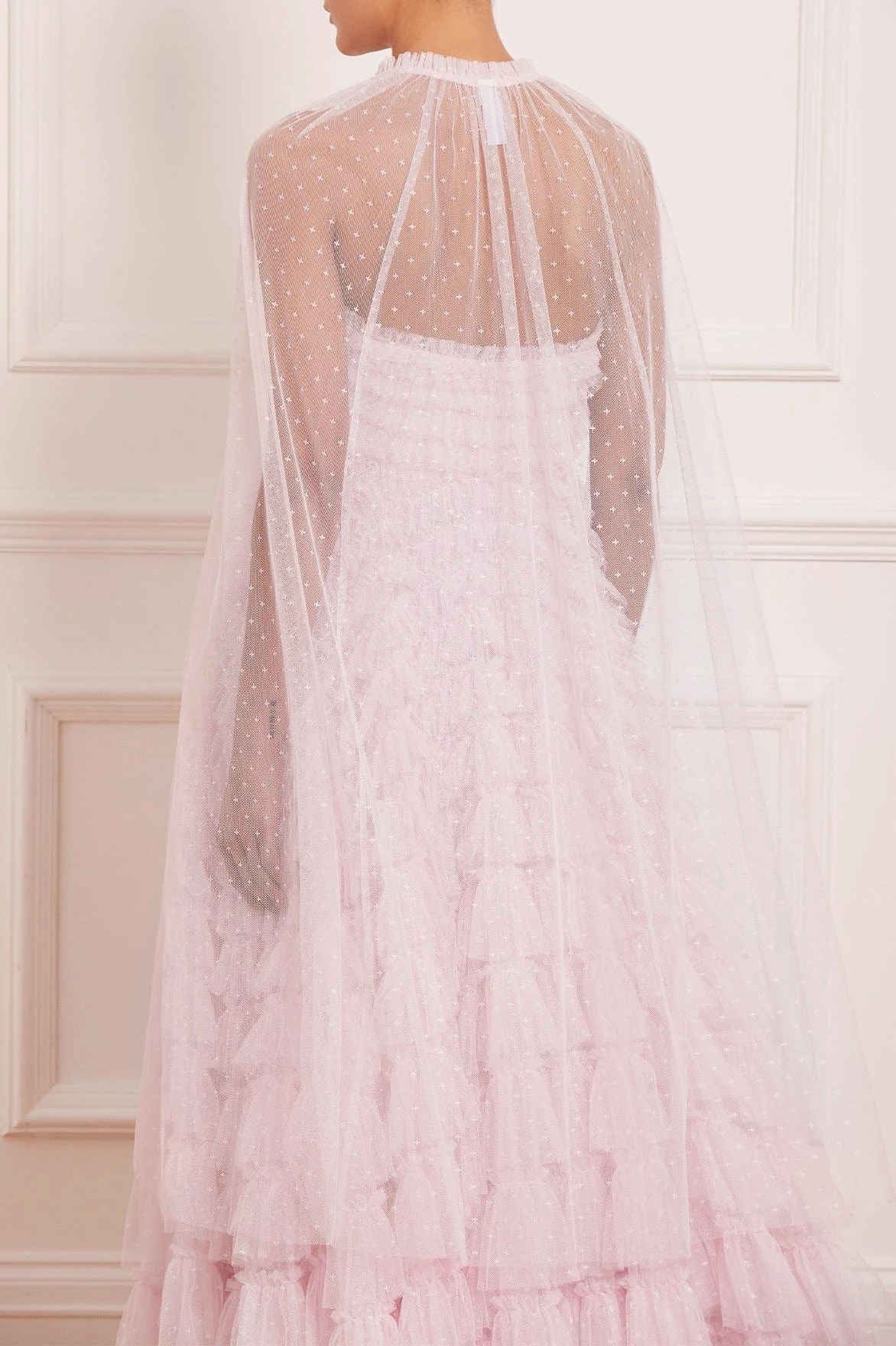 NEW SEASON |NEEDLE & THREAD EXCLUSIVE. The Elizabeth Rose Midaxi Cape in Wisteria. This cape is delicately textured with ‘x’ kisses tulle and signature Needle & Thread frills across the neckline. Beautifully designed to style layer over our Elizabeth Rose Corset Ankle Gown.