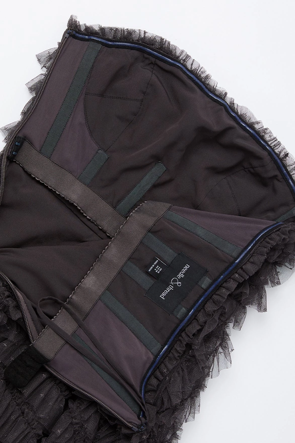 NEW SEASON | NEEDLE & THREAD EXCLUSIVE. The Elizabeth Rose Strapless Corset Micro Mini Dress in Graphite. This dress is a classic, romantic style. Beautifully designed with large frills and layered tulle throughout the silhouette, adding volume and creating whimsical movement. The corset bodice features internal panels of power mesh fabric, adding structure to hold the silhouette in place whilst still allowing movement and comfort. Make a statement in the Elizabeth Rose.
