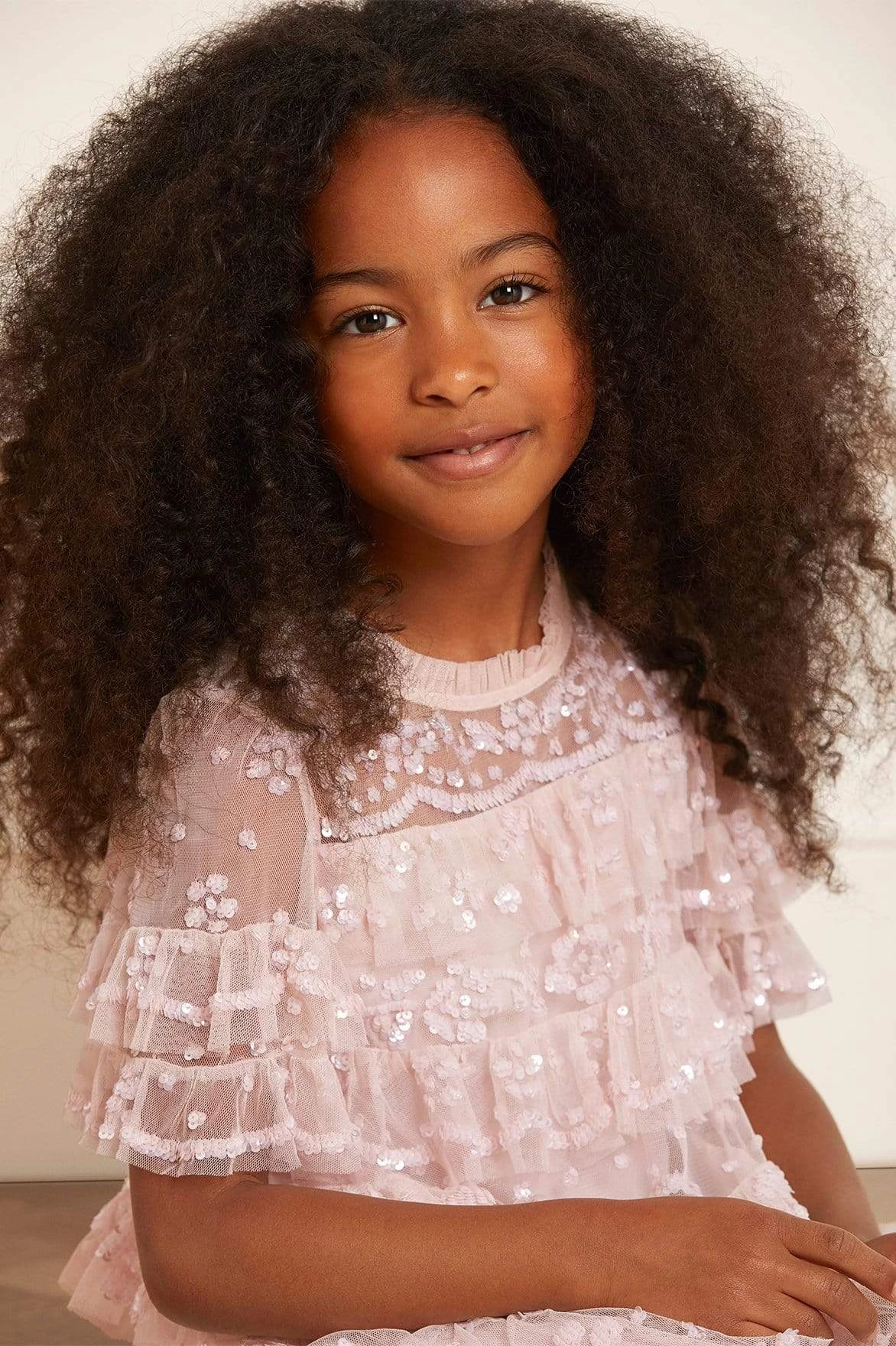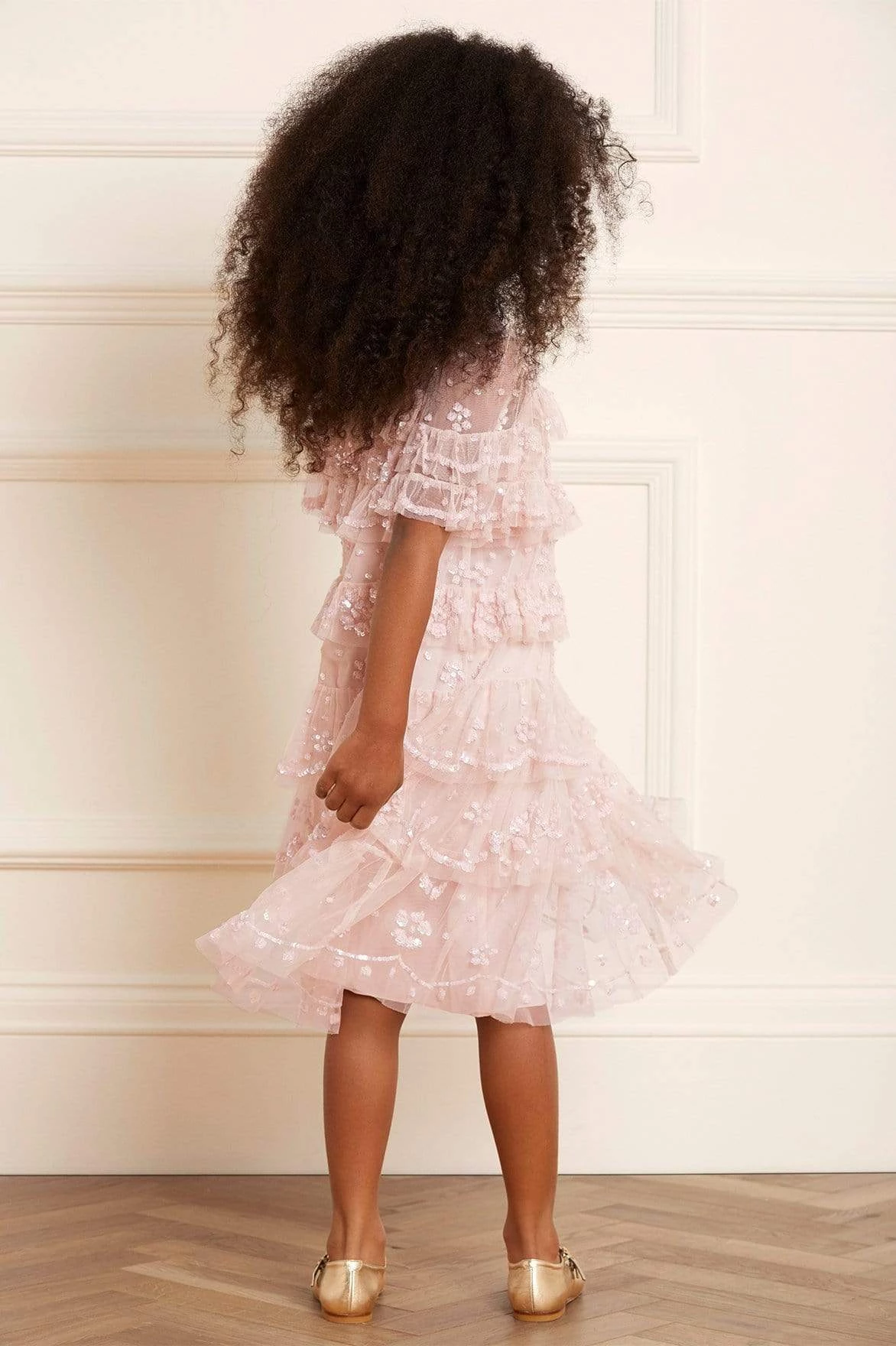 NEW SEASON | Eloise KIDS Dress in Petal Pink. A beautifully designed dress with floral lace-inspired artwork and borders of shimmering sequins in iridescent tones. Incorporating a soft, relaxed silhouette and gentle circle-cut tiered panels that create ethereal movement perfect for twirling. The ultimate princess dress for her wardrobe.