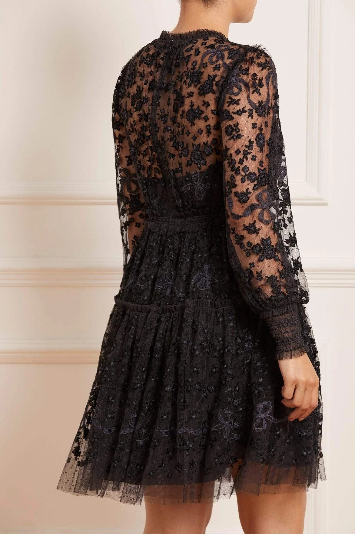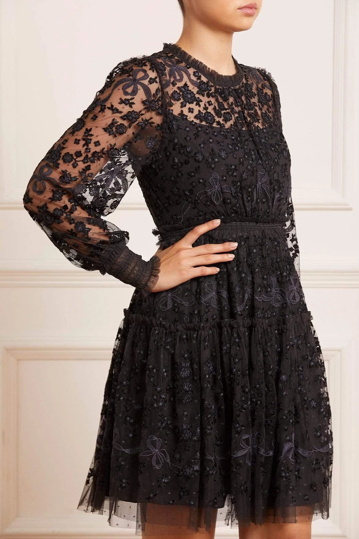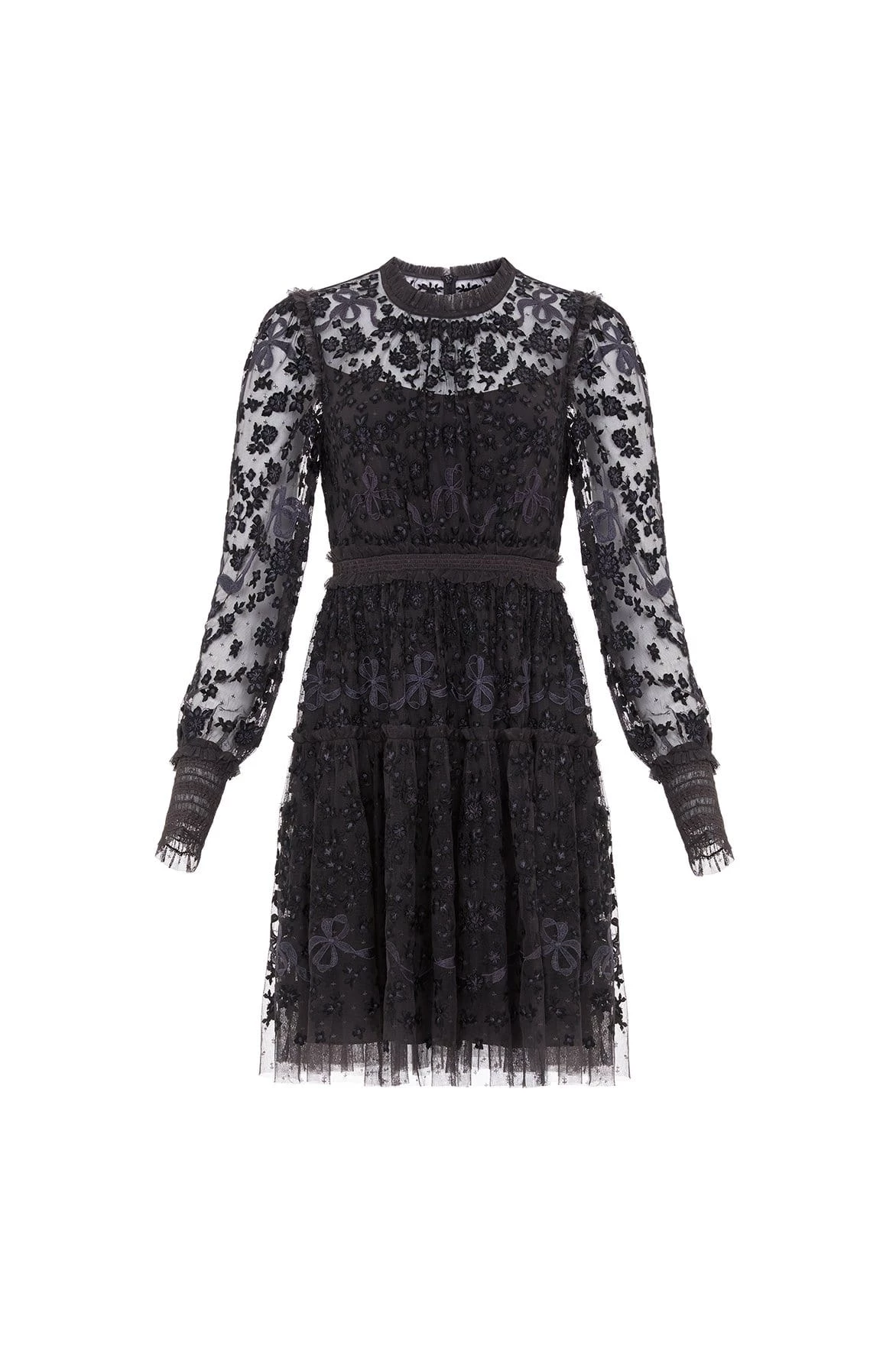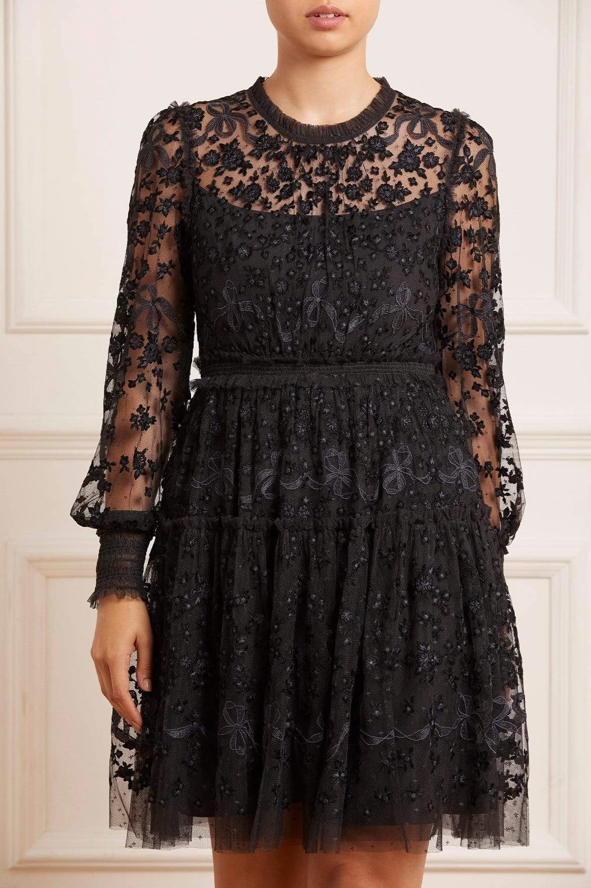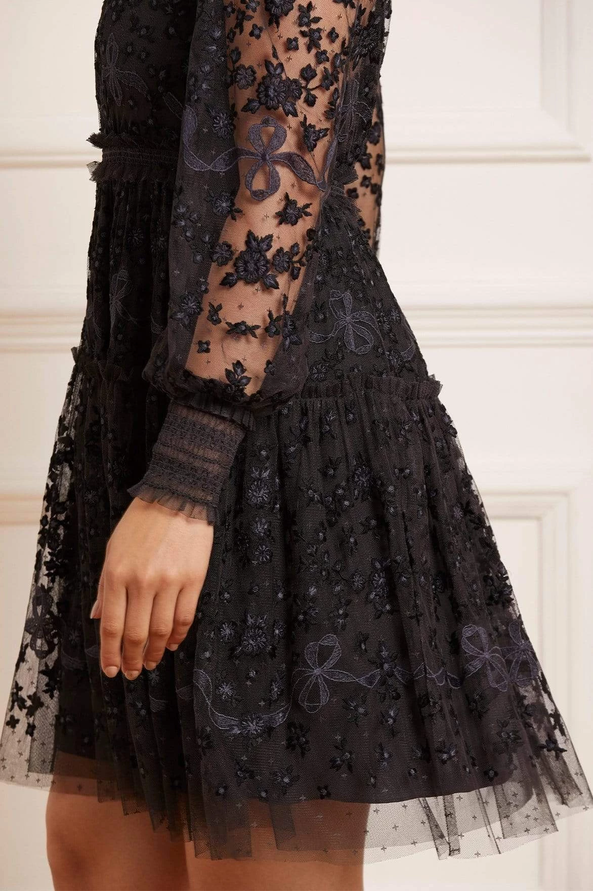 The Emilana Dress in Graphite. This romantic dress is beautifully embroidered with delicate floral and ribbon motifs. The artwork on the dress is inspired by a series of hand-embroidered French postcards from the early 1900s, creating a soft, pretty design. Crafted with signature Needle & Thread details, tiered panels and smocked cuff sleeves for easy wearing. Make this dress your new wardrobe staple.
