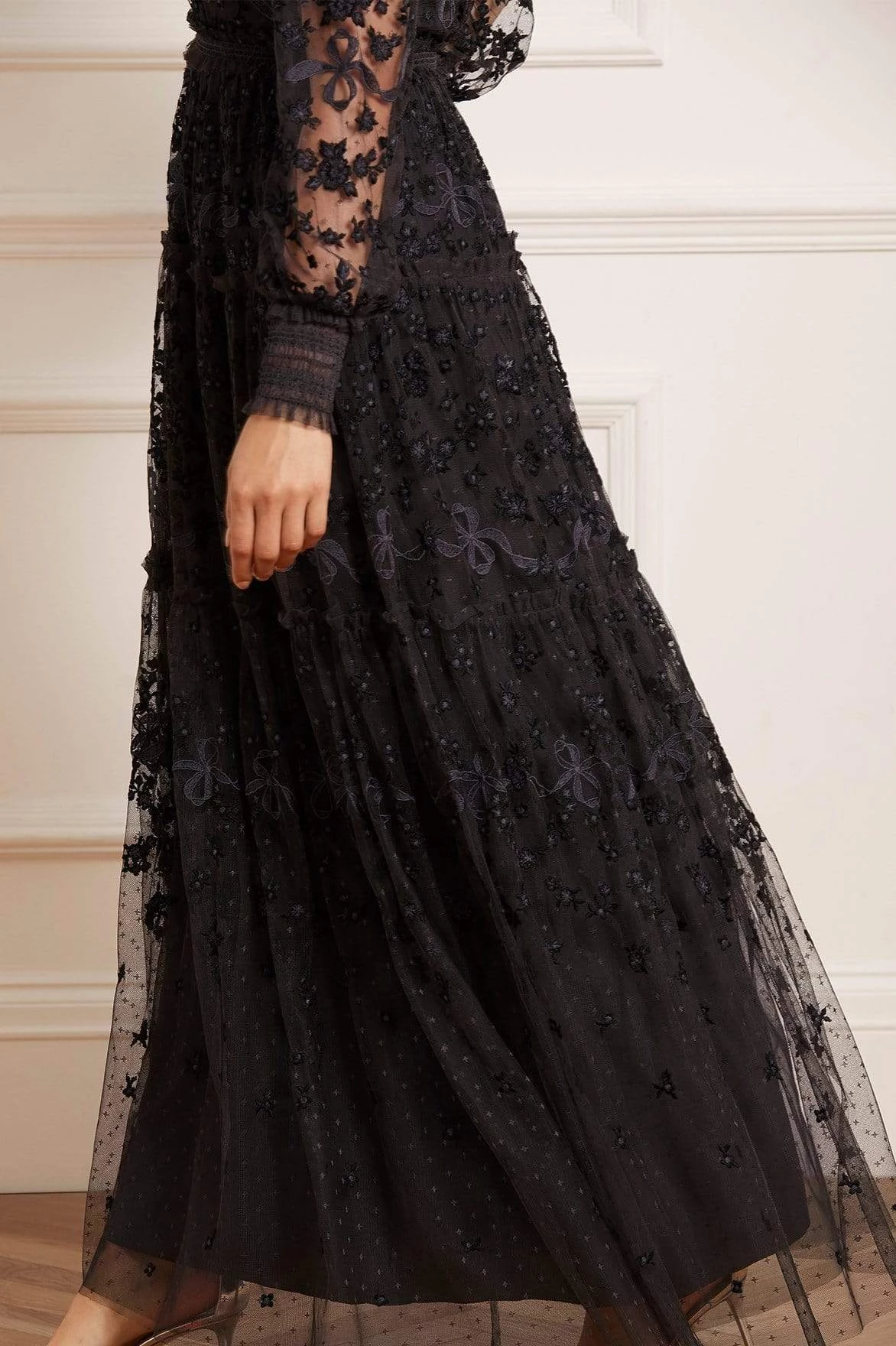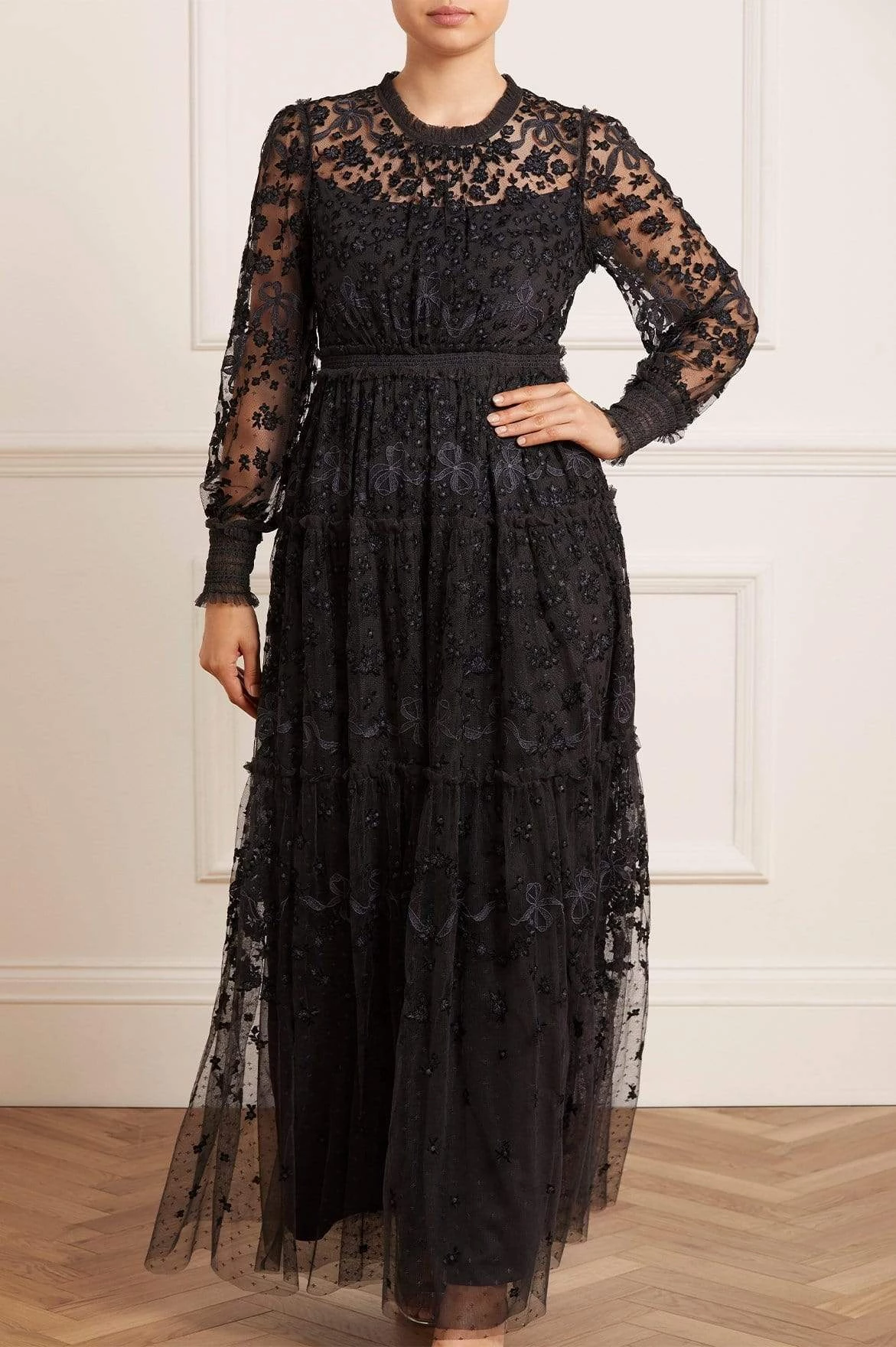 The Emilana Gown in Graphite. This romantic gown is beautifully embroidered with delicate floral and ribbon motifs. The artwork on the gown is inspired by a series of hand-embroidered French postcards from the early 1900s, creating a soft, pretty design. Crafted with signature Needle & Thread details, tiered panels and smocked cuff sleeves for easy wearing. Make this gown your new wardrobe staple.