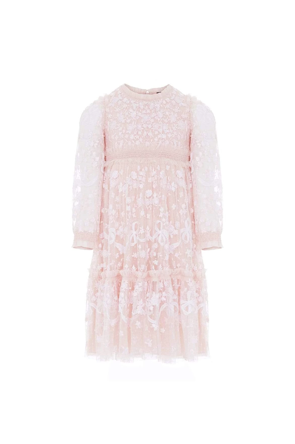 NEW SEASON | The Emilana Long Sleeve KIDS Dress in Petal Pink. This dress is embroidered with floral and bow motifs in gentle pastel tones. Featuring soft layered tulle to create frothy volume, combined with comfortable elasticated waist and cuffs. This effortless style is perfect for every occasion.