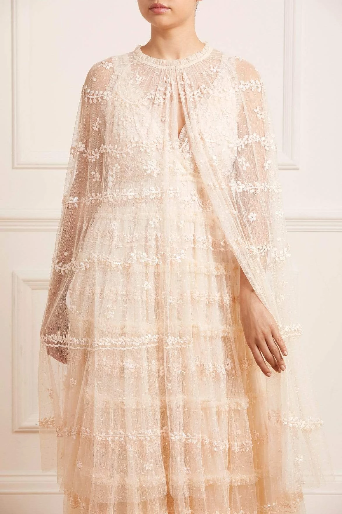 The Eve Sequin Midaxi Cape in Champagne / Pink. This romantic cape is intricately adorned with shimmering sequin borders in pretty, lace-inspired designs. Designed to sit over the Eve Sequin Cami Gown for a statement look. Make this cape your new go-to piece this season.