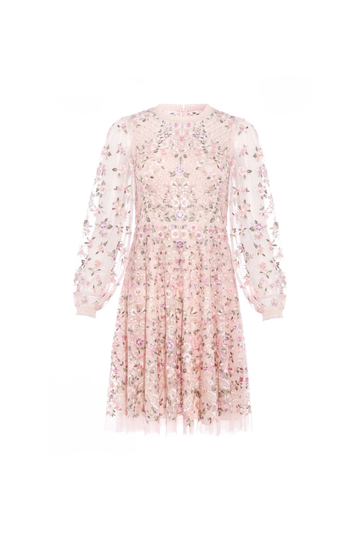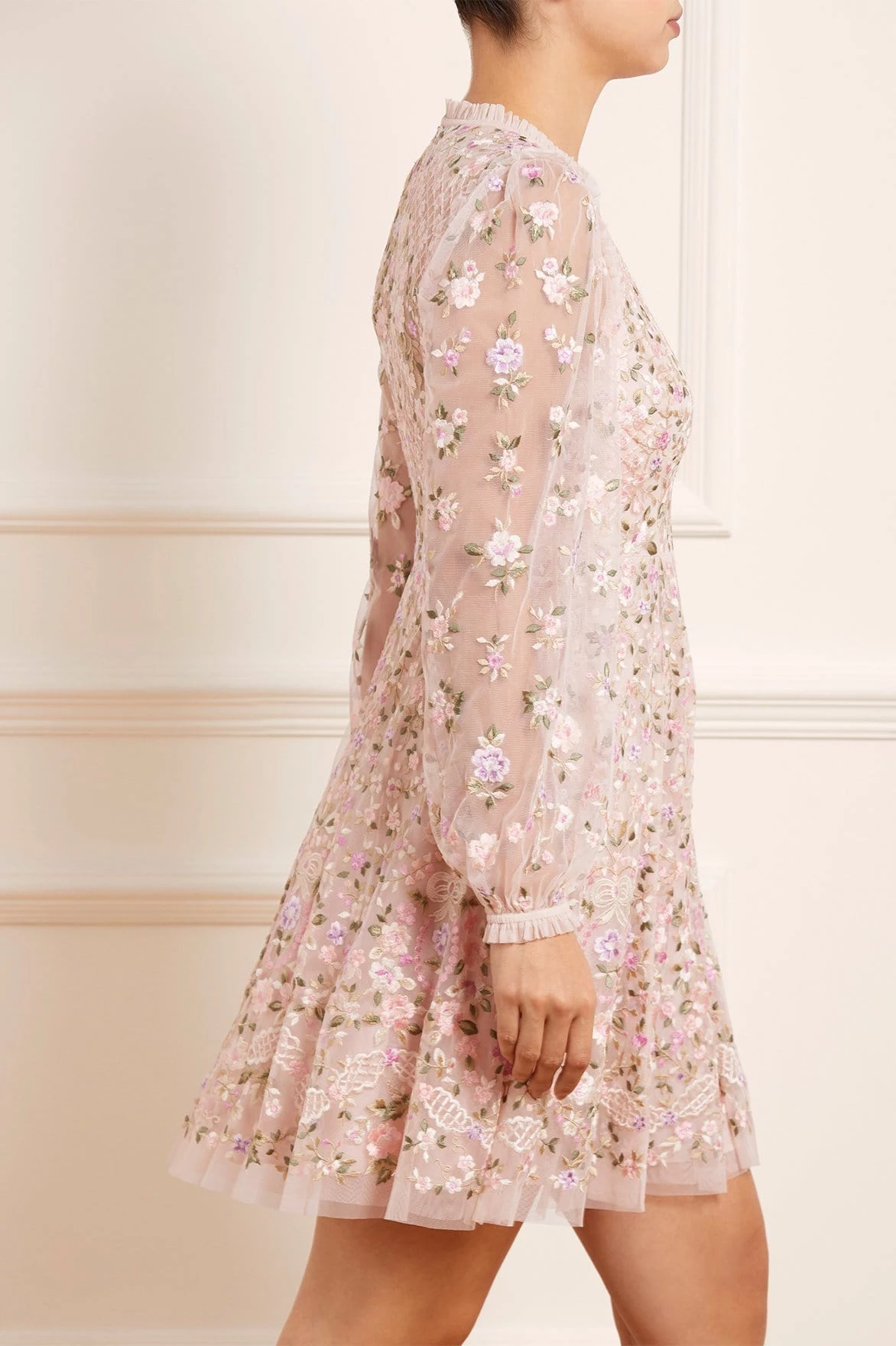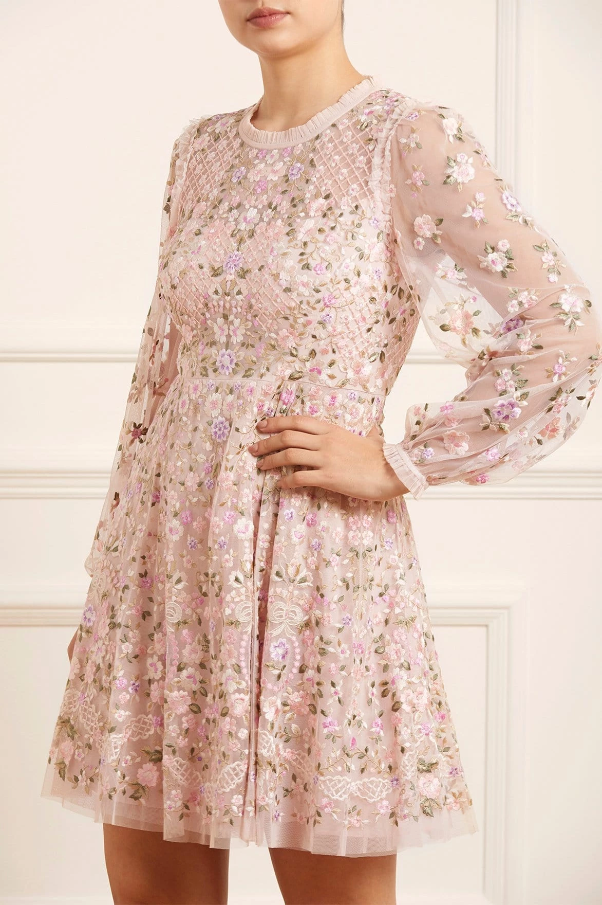 The Floret Mini Dress in Petal Pink. This piece is inspired by vintage lace and garden florals and fully embroidered in rich, multi-coloured thread. Beautifully decorated with intricate flowers and delicate trellis motifs, resulting in an effortless silhouette. A style you’ll keep coming back to.