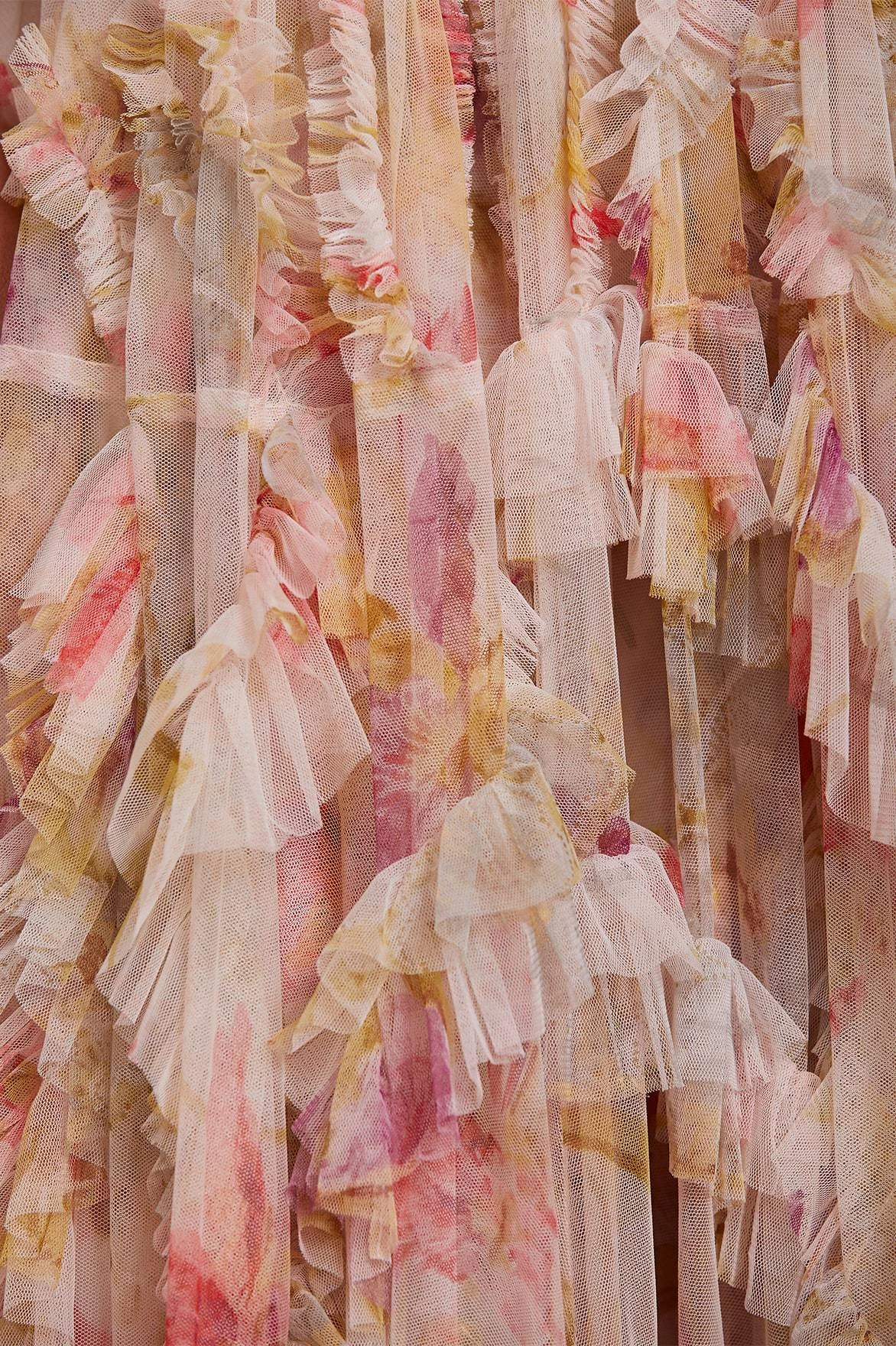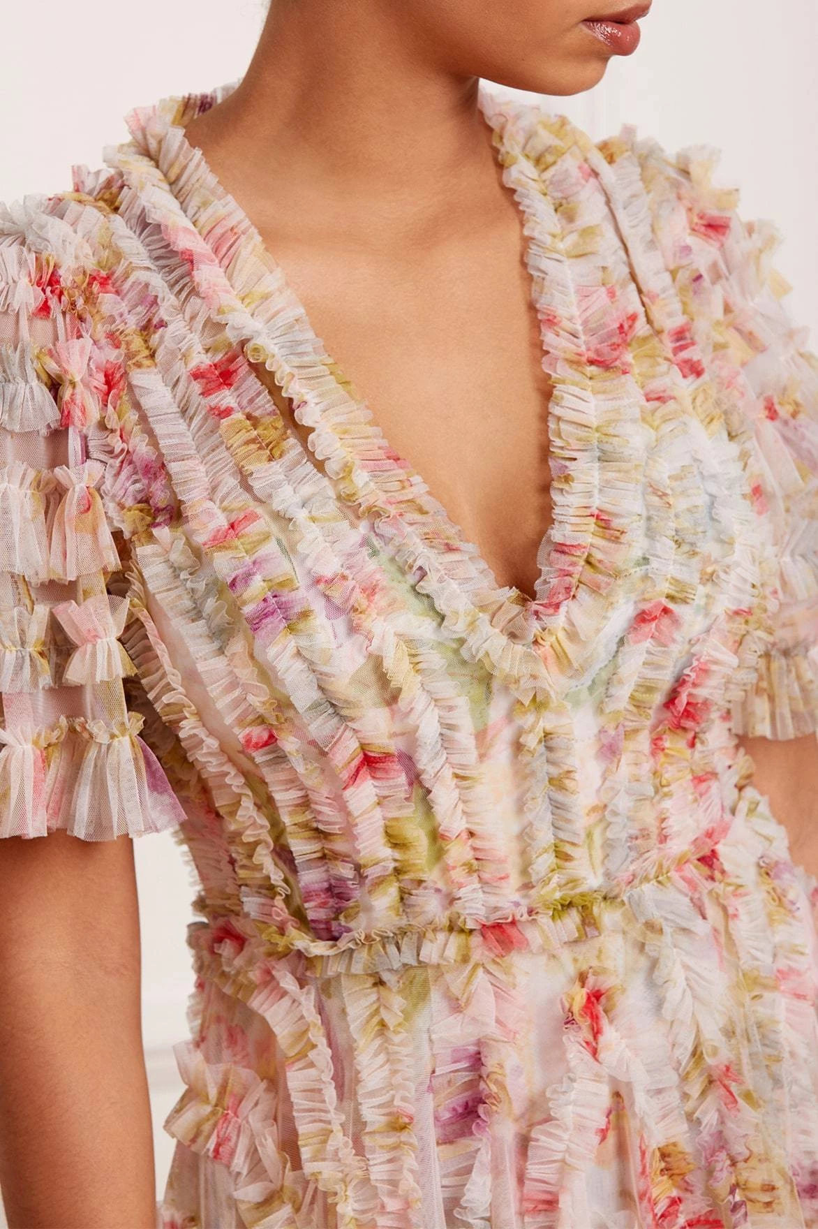 The Iris Grace Ankle Gown in Moonshine. This ankle gown features large iris motifs in detailed embroidery and a lace-inspired texture. Its soft dusty colour palette is perfect for all seasons. Crafted with a dramatic silhouette, tulle frills and indulgent texture throughout. A truly show-stopping piece.