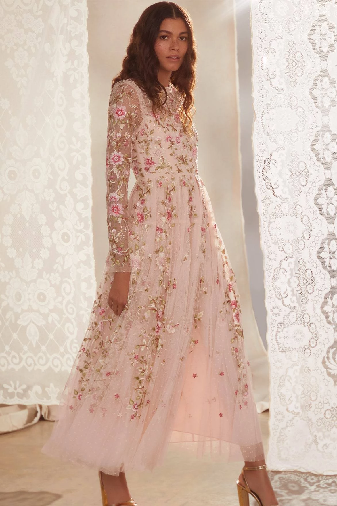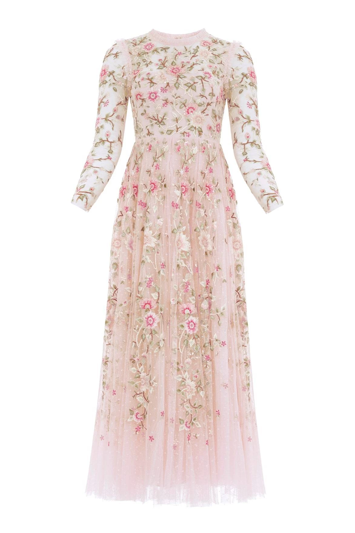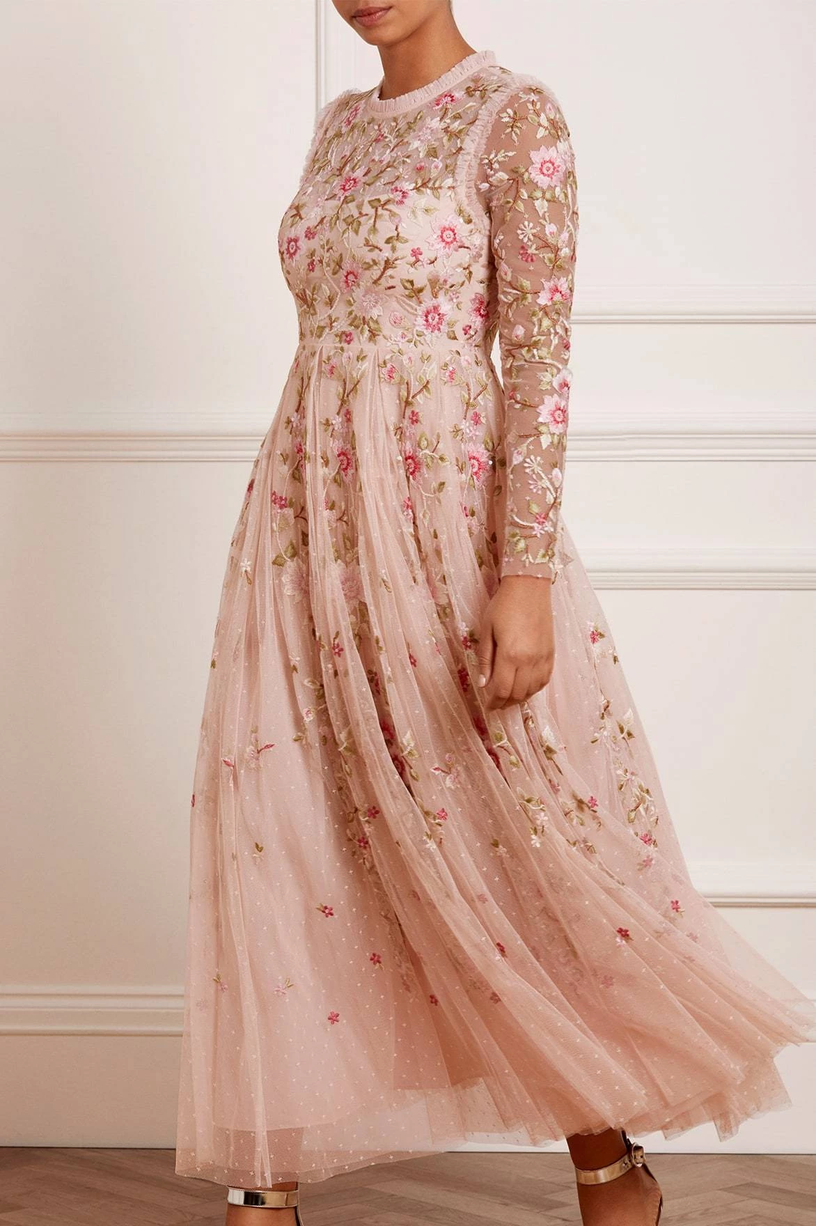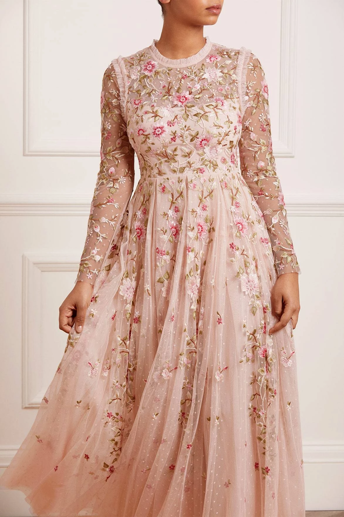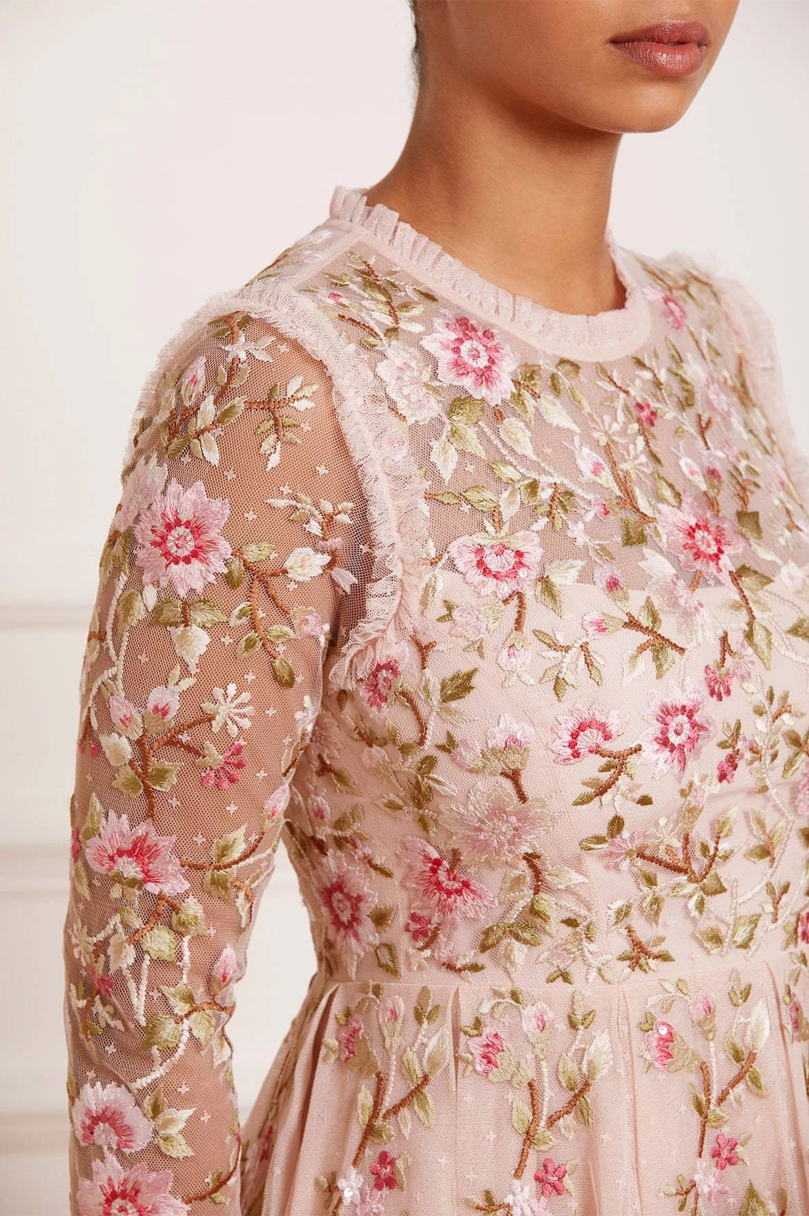The Lillian Rose Ankle Gown in Petal Pink. This beautiful dress is inspired by a floral artwork taken from an intricate Victorian fan. Crafted elaborately with layers of tulle and net, creating a romantic silhouette with sheer, elegant sleeves. Decorated with embroidered trailing rose motifs, engineered throughout in rich pinks. Make space in your wardrobe for the Lillian.