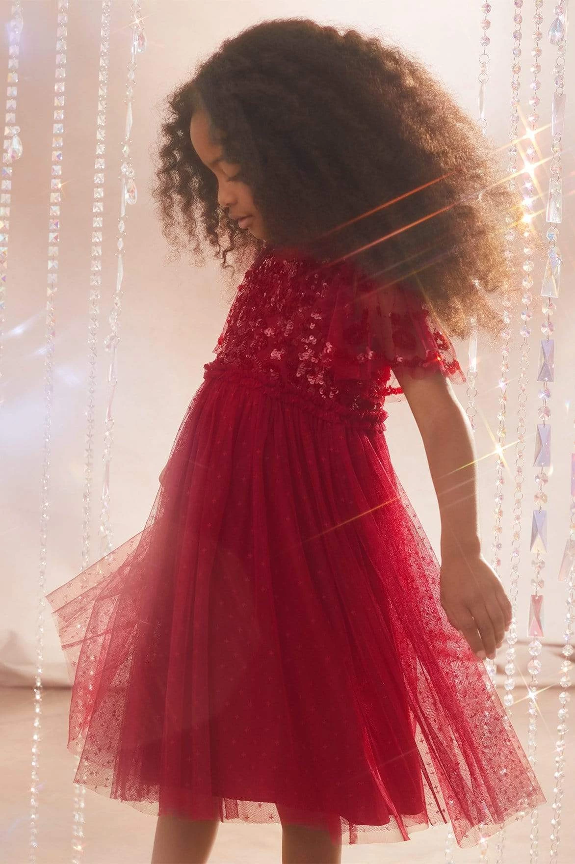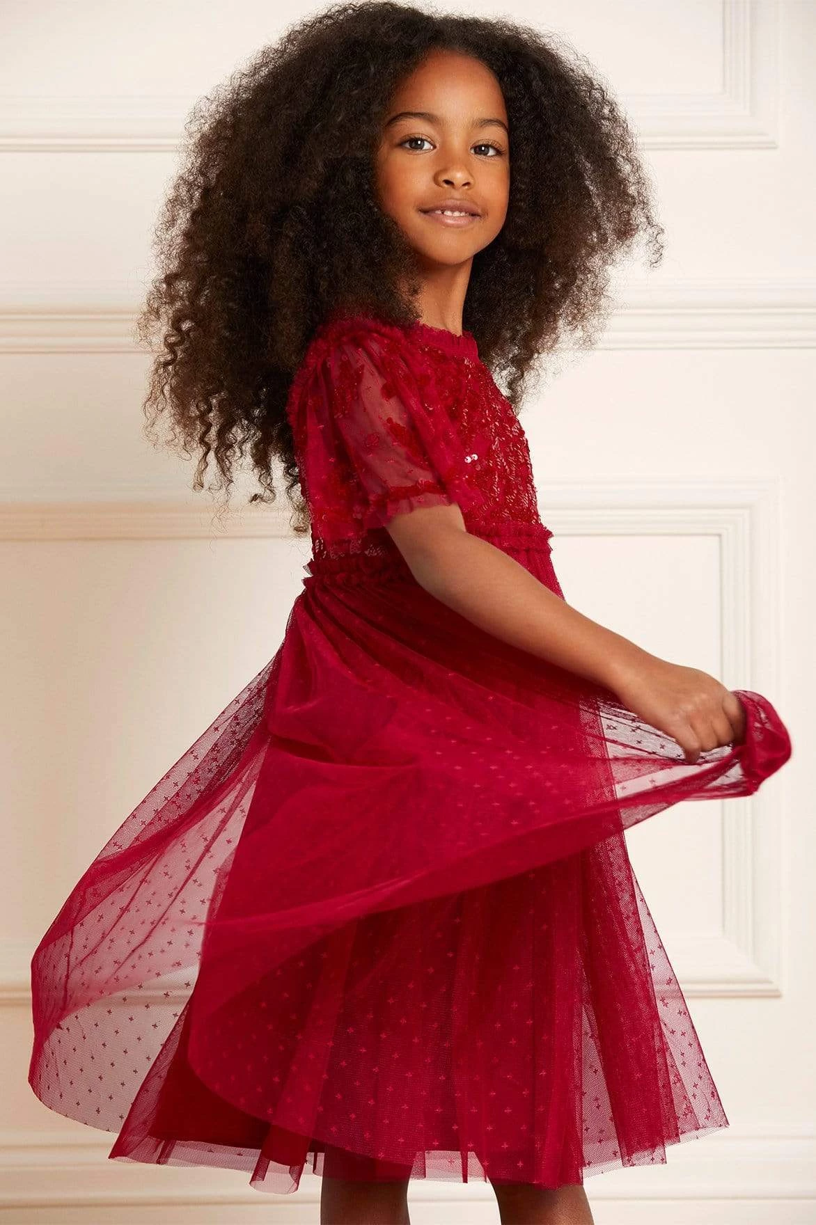 NEW SEASON | NEEDLE & THREAD EXCLUSIVE. The Lilybelle KIDS Dress in Deep Red. This dress is beautifully embellished with tonal sequins scattered across the bodice. An intricately designed style with tulle trims around the neck and waistline, featuring a multi-layered frothy tulle skirt to add elegance. Dress her up in the Lilybelle for any occasion.