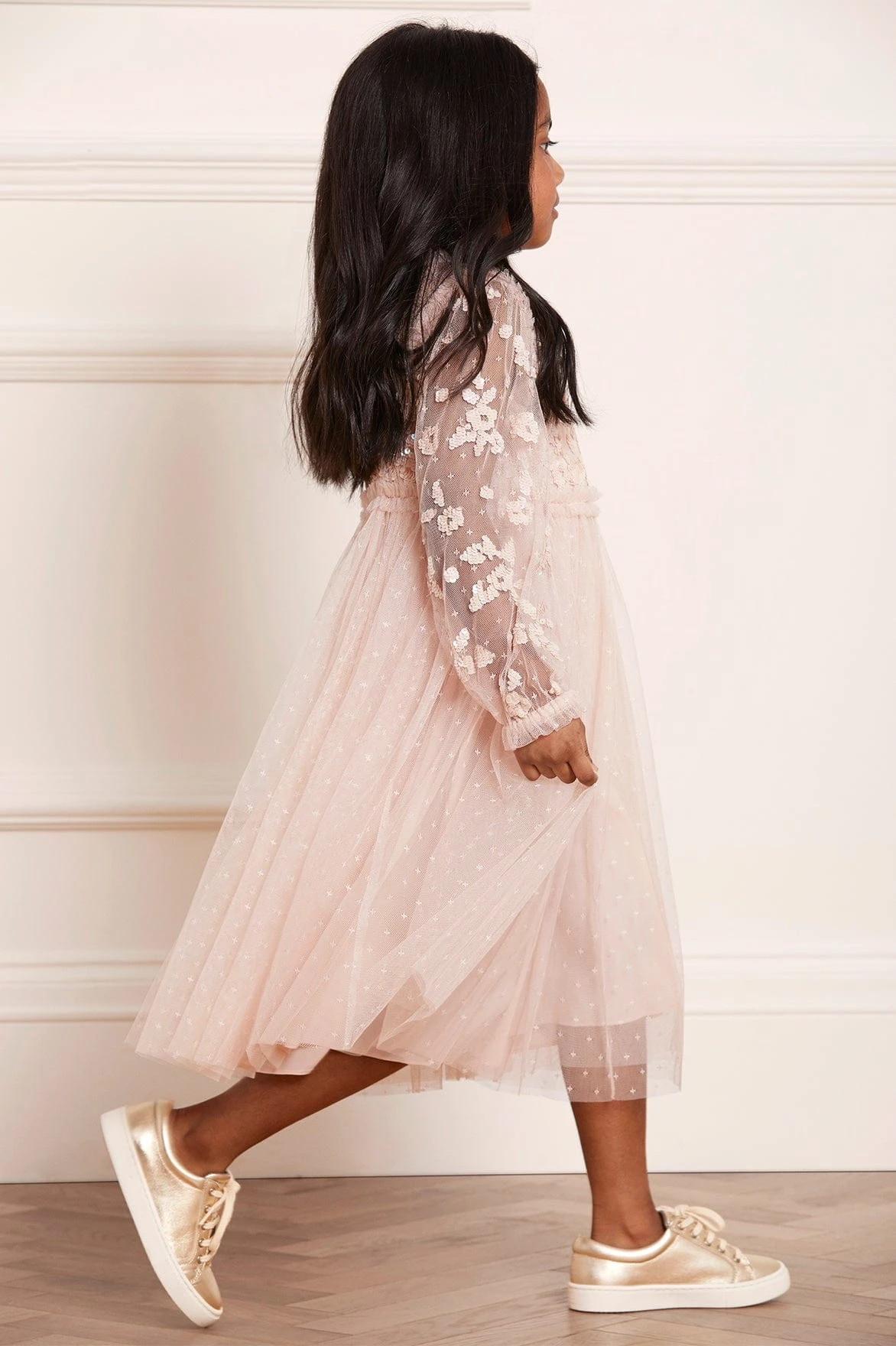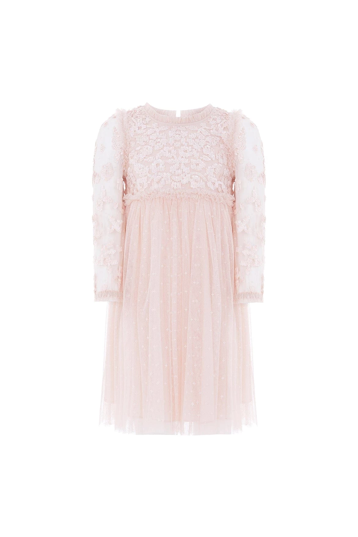 NEW SEASON | NEEDLE & THREAD EXCLUSIVE. The Lilybelle Long Sleeve KIDS Dress in Strawberry Icing. This long sleeve dress is beautifully embellished with tonal sequins scattered across the bodice. Intricately designed with tulle trims around the neck and waistline. Featuring a multi-layered frothy tulle skirt, adding a pretty, playful texture. Dress her up in the Lilybelle for any occasion.