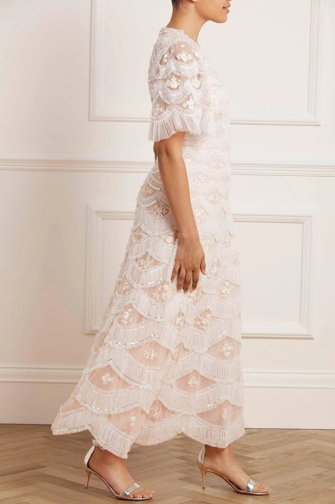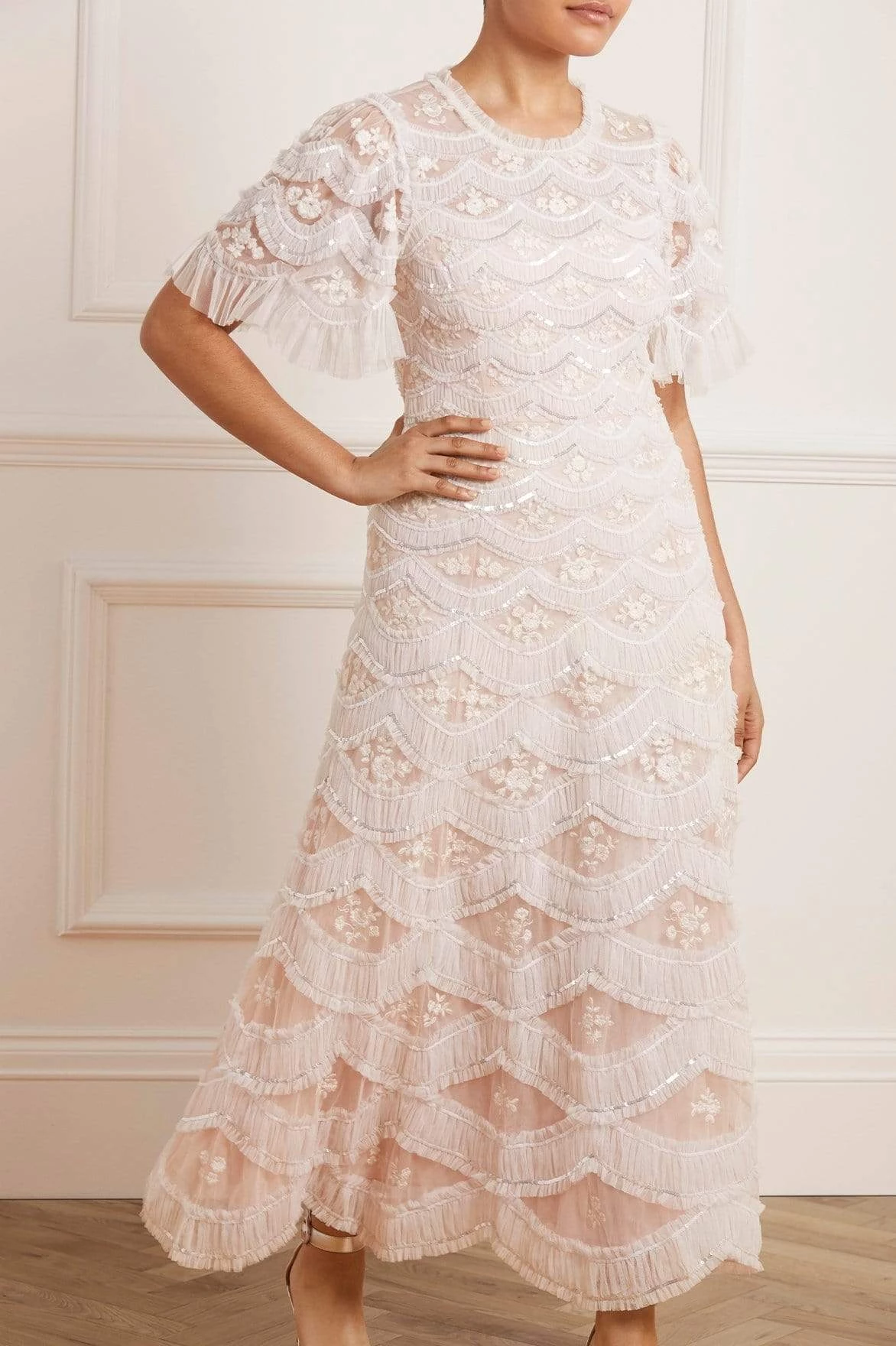 The Lunette Blossom Ankle Gown in Strawberry Icing / White. This gorgeous gown is inspired by traditional Wedgwood ceramics, and is beautifully adorned with floral embroidery motifs, shimmering sequins and delicately gathered tulle scallop borders with contrasting ivory detail. Designed with pretty fluted sleeves, a flattering silhouette and a romantic aesthetic throughout. The perfect gown to take you from day to night.