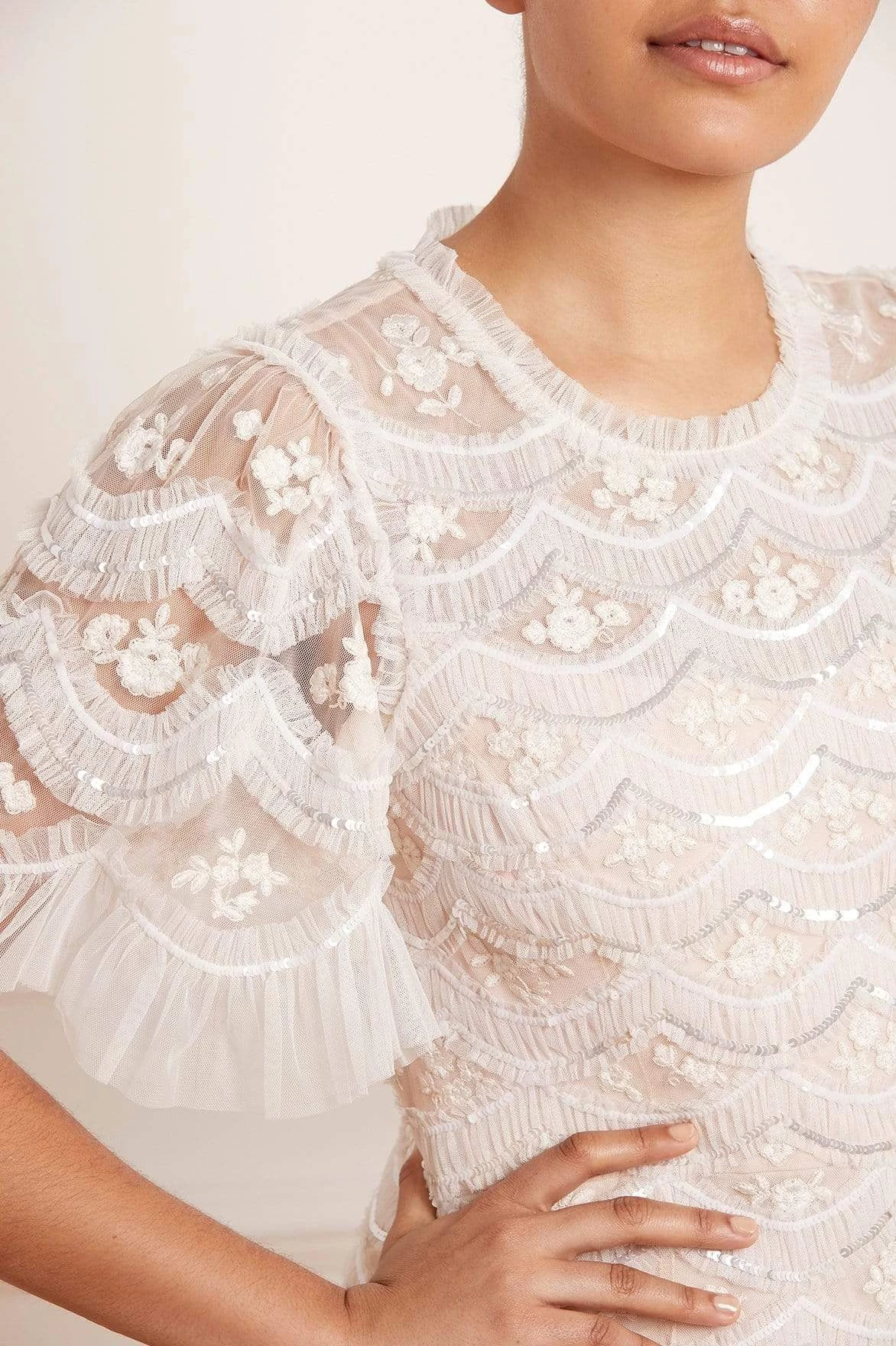 – Tulle decorated with tonal embroidery, iridescent sequins and gathered ruffles