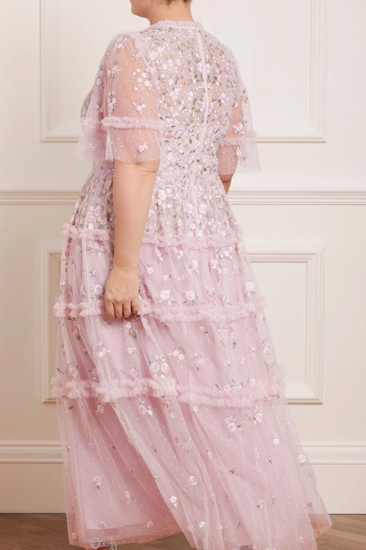 The Martha Ditsy Ankle Gown in Wisteria / Pale Pink. This ankle gown is delicately embroidered with floral motifs in soft tones, with a beautiful scattered layout. Designed with romantic sleeves featuring pretty tulle ruffles. The perfect gown for every occasion.