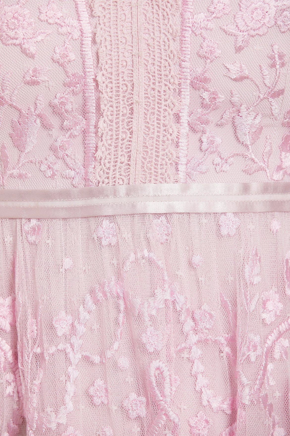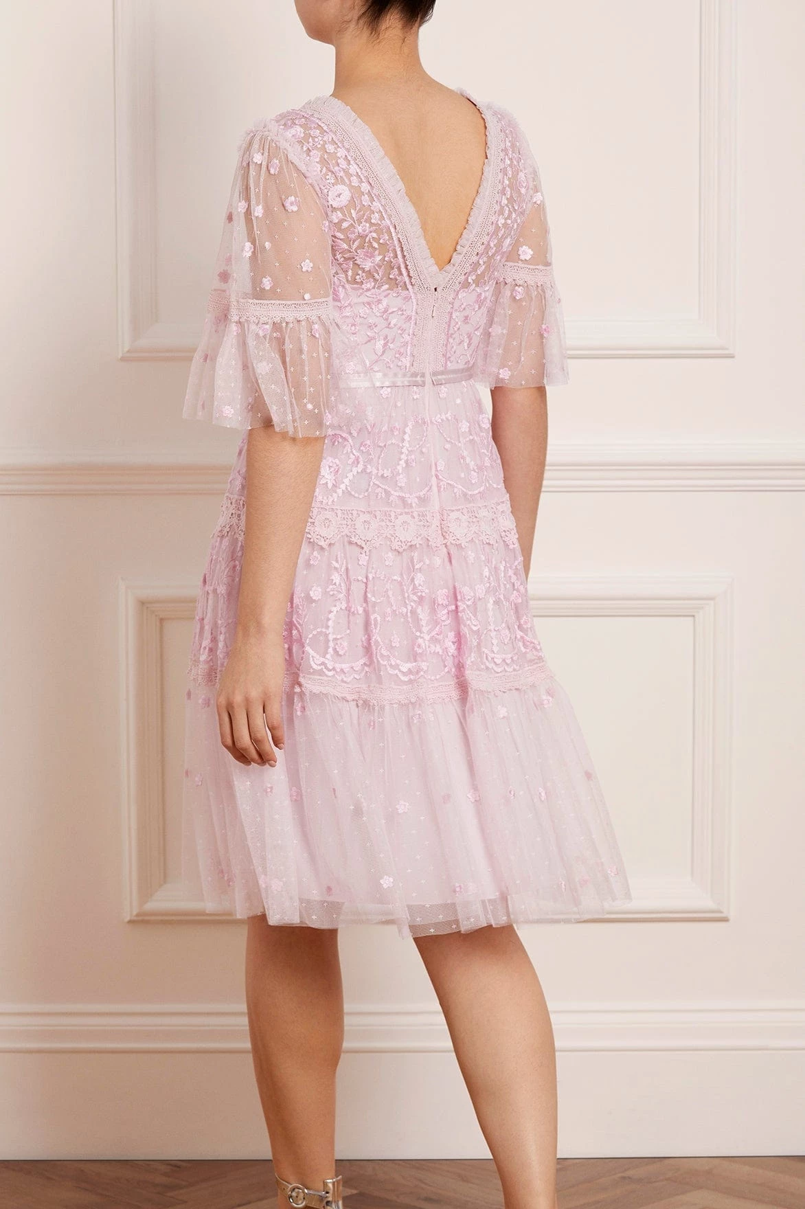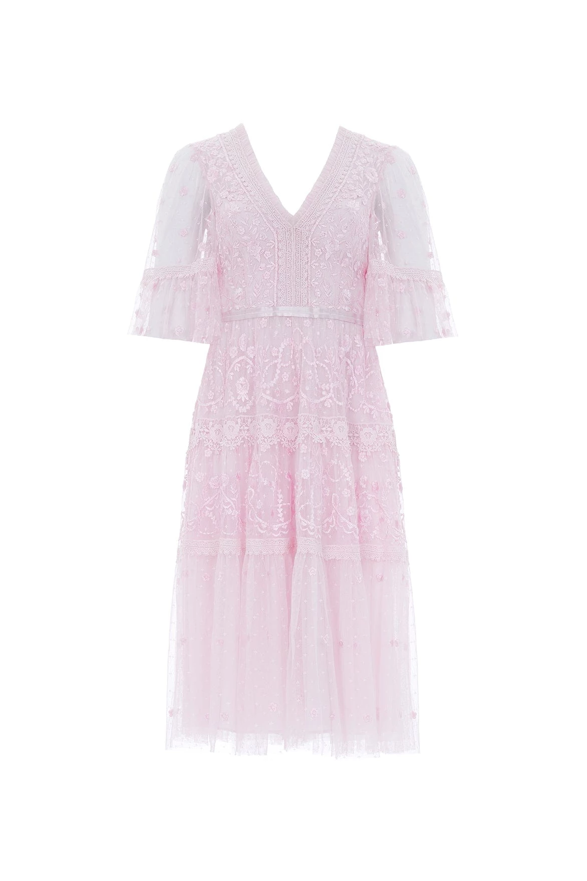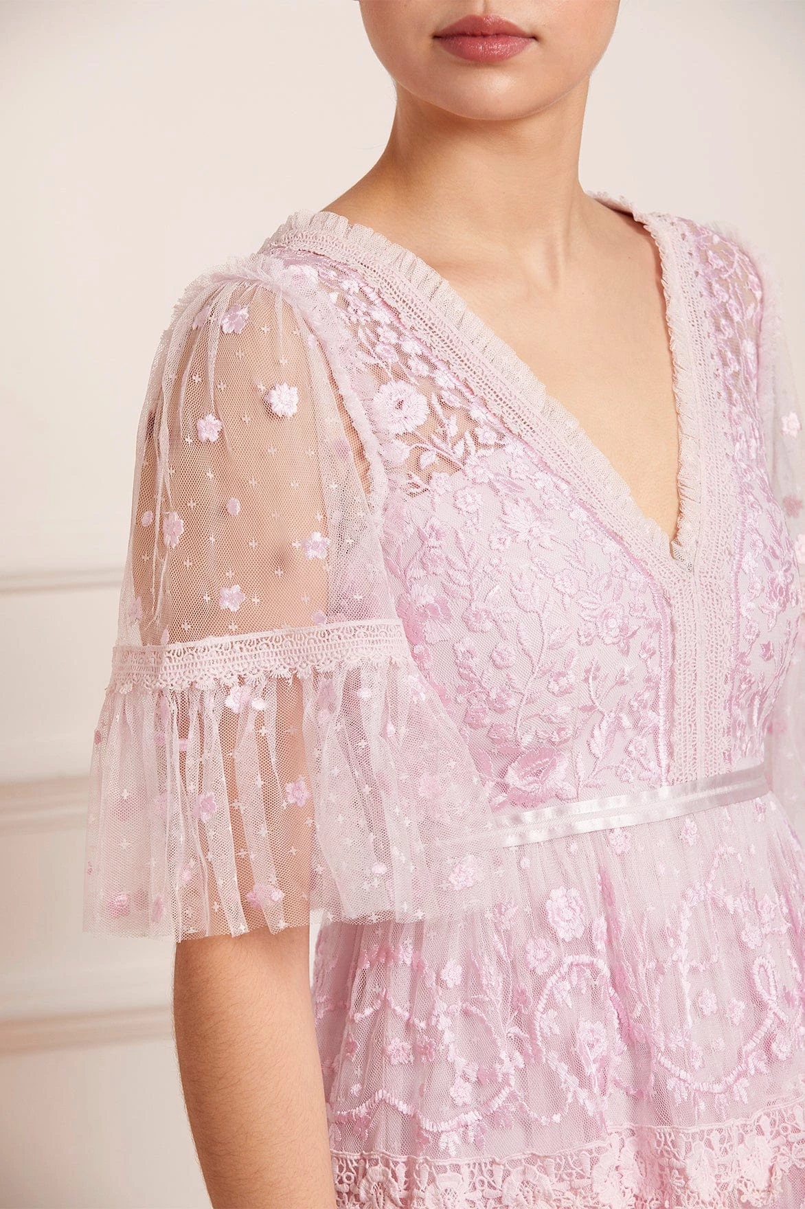 The Midsummer Lace Dress in Wisteria. A signature Needle & Thread style, updated for the Taking inspiration from Victorian lace, the Midsummer features intricately embroidered artwork in tonal colours on delicate tulle. Lace trims border the neckline and frame each tier of the skirt. This embroidered lace dress has sheer, romantic sleeves and our signature grosgrain ribbon at the waist. The perfect dress to take you from day to night.