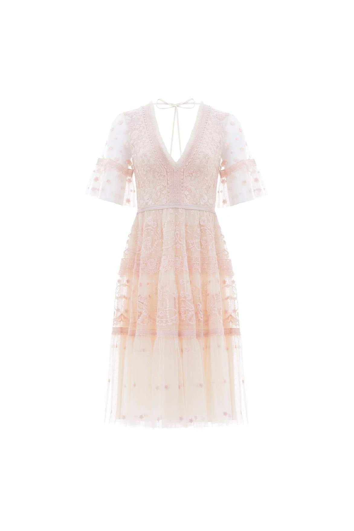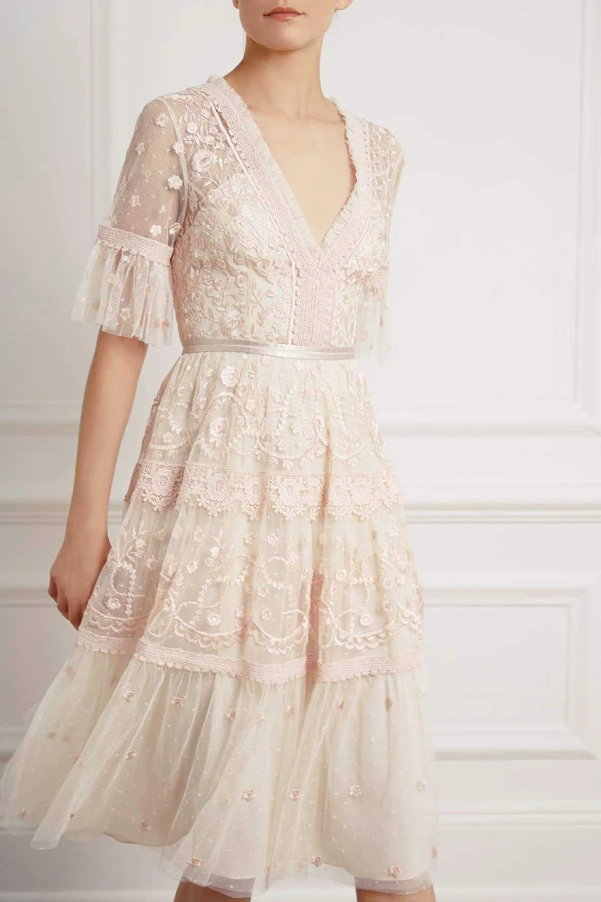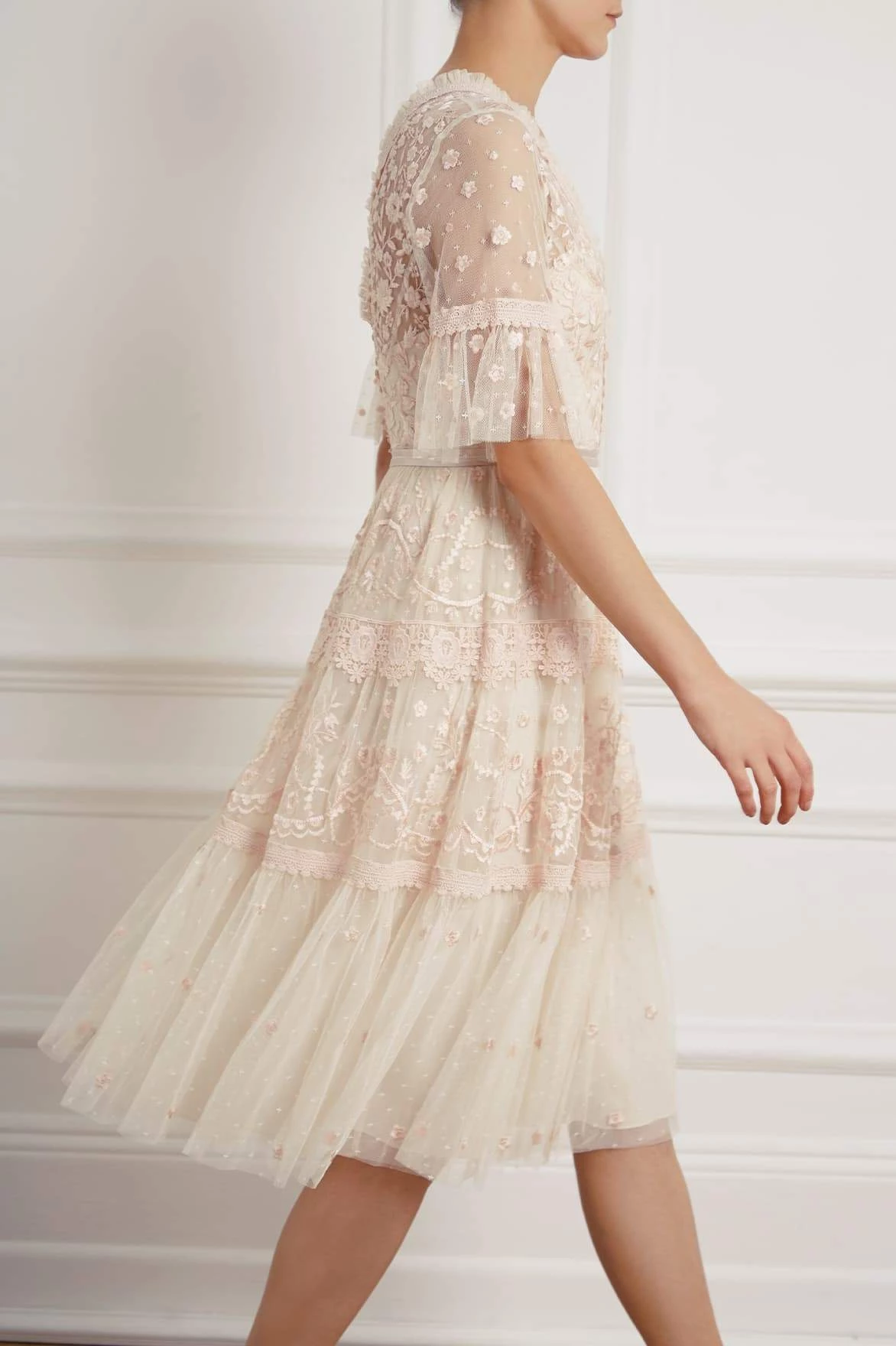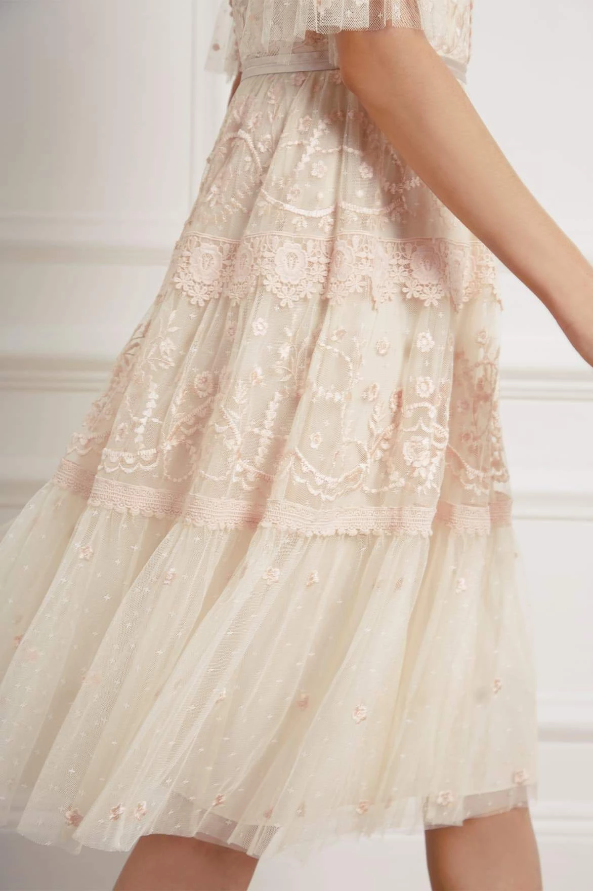 Midsummer Lace Dress in Champagne/Ballet Slipper. A signature Needle and Thread style, updated for the new season ahead. Taking inspiration from Victorian lace, the Midsummer features intricately embroidered artwork in romantic colours on delicate tulle. Lace trims border the neckline and frame each tier of the skirt. This embroidered lace gown has sheer, romantic sleeves and our signature grosgrain ribbon at the waist. The perfect dress to take you from day to night.
