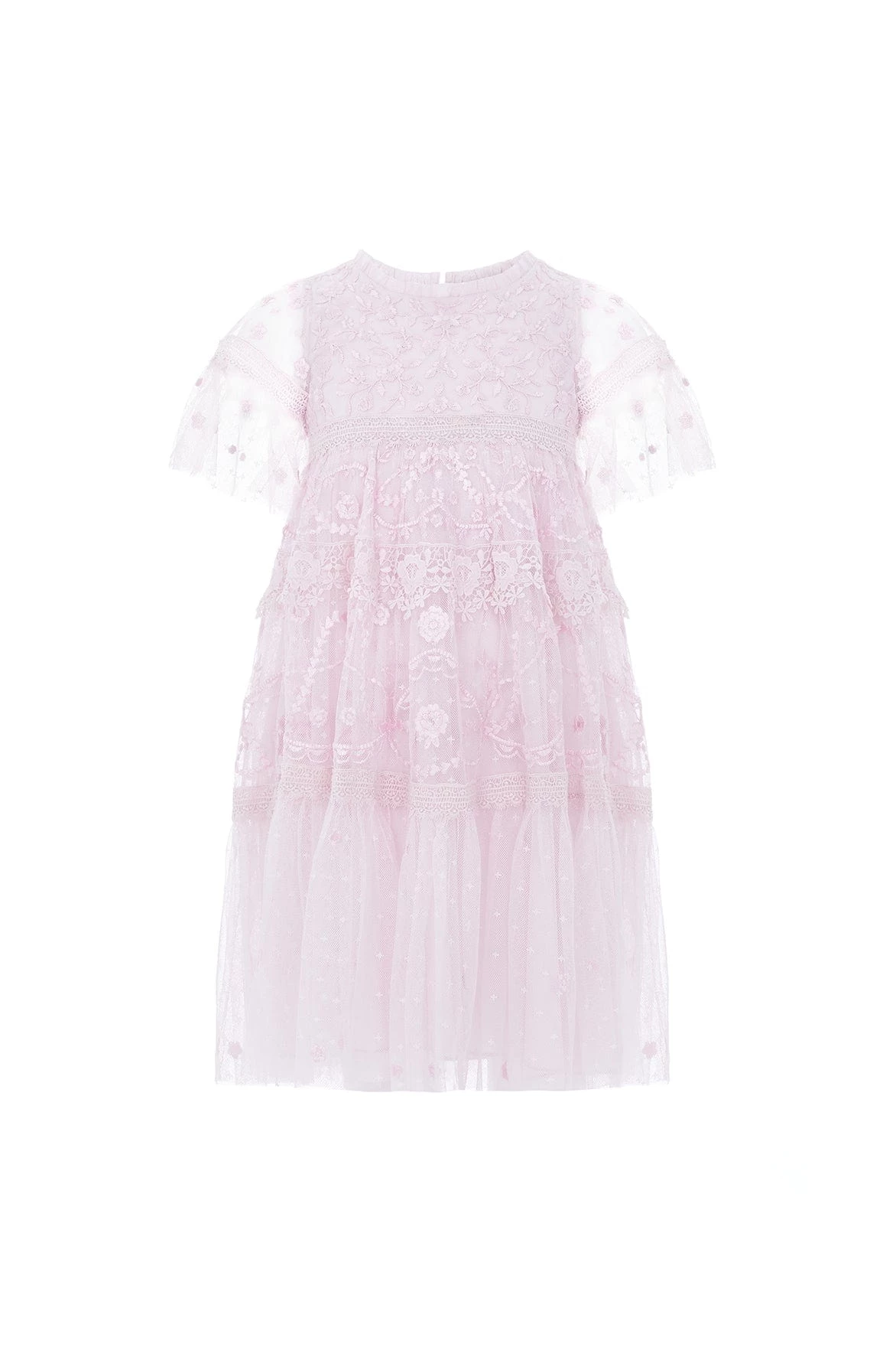 NEW SEASON | The Midsummer Lace KIDS Dress in Wisteria. This dress is designed beautifully with scattered floral motifs. Features intricate scallop border designs in champagne embroidery threads on delicate kisses tulle. This embroidered lace dress has short cap sleeves and a multi-layered tulle skirt with frill detailing. The Midsummer Dress is fit for a princess.