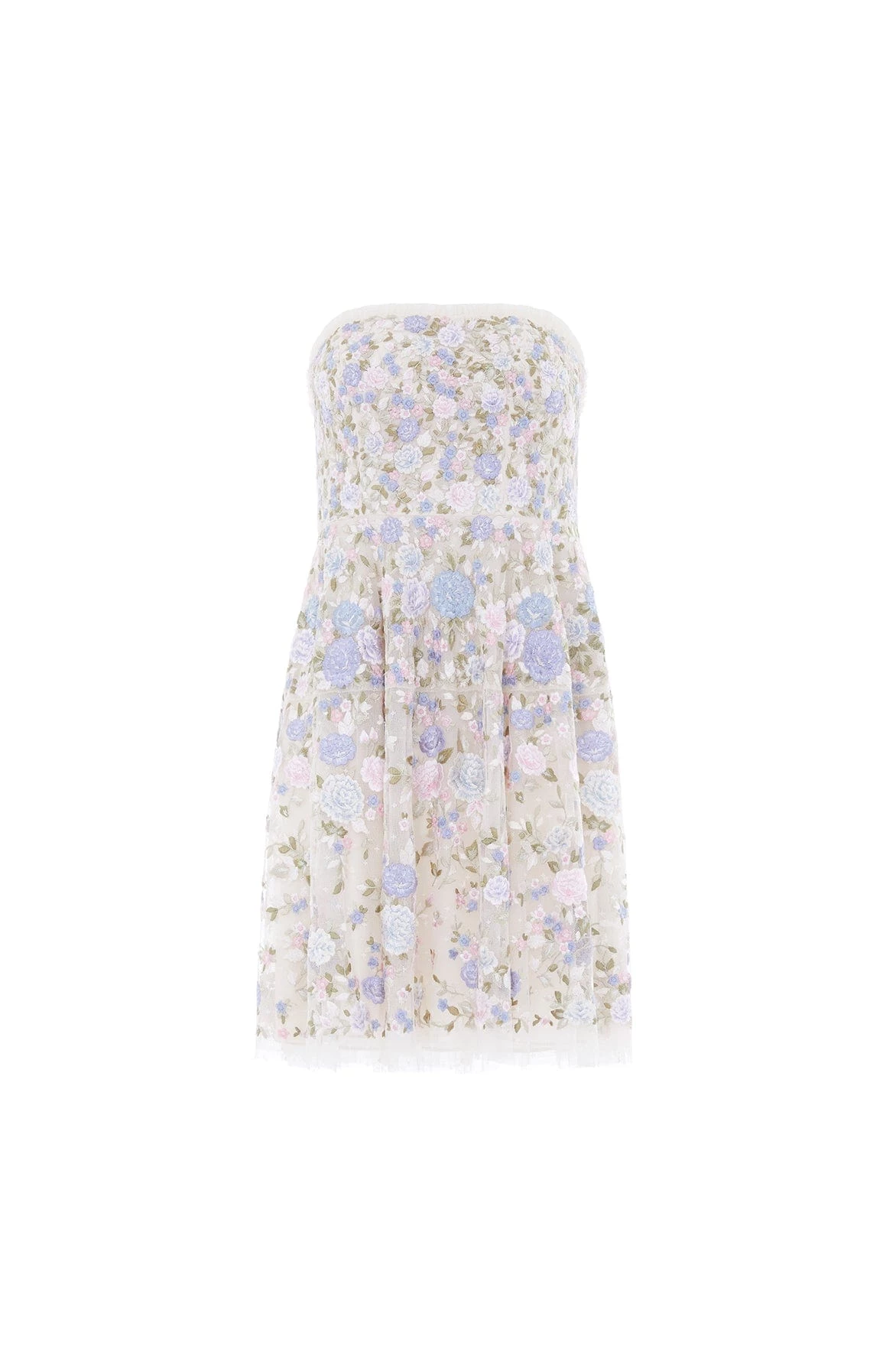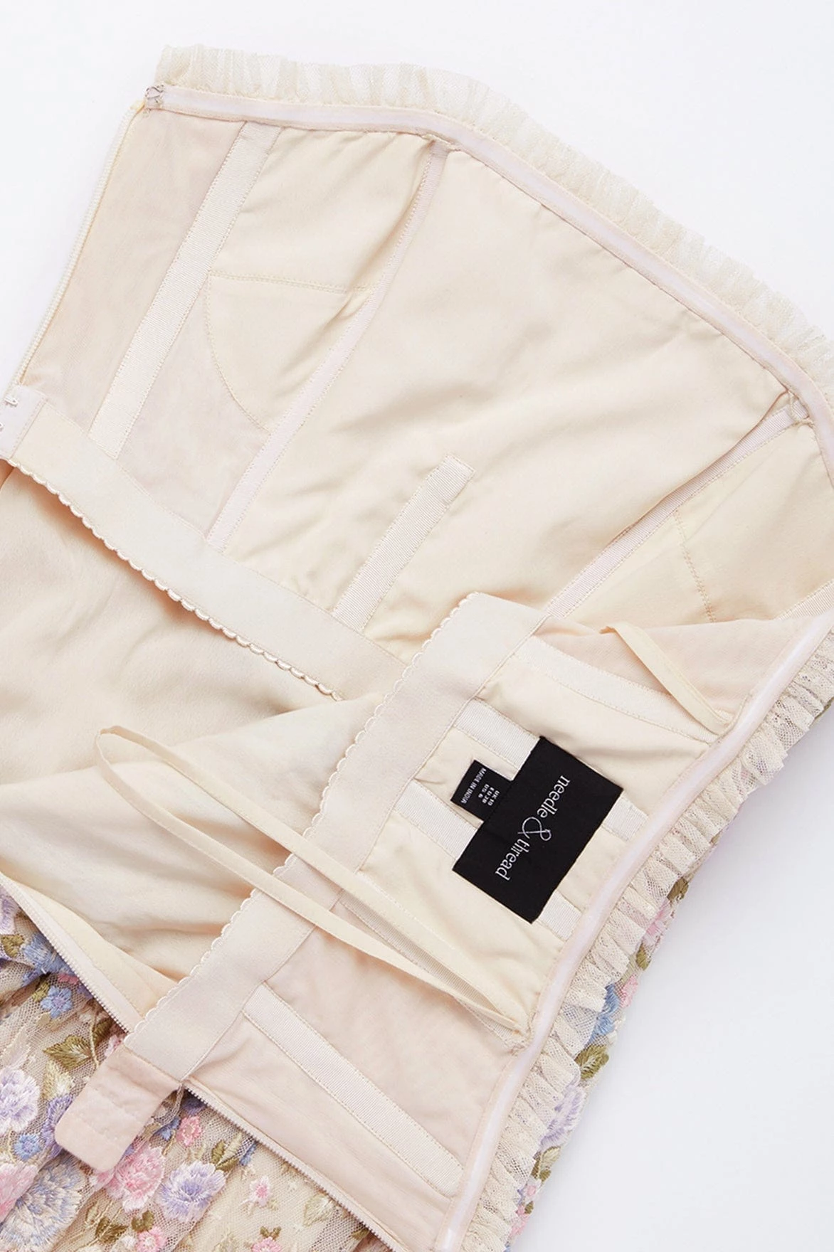 NEW SEASON. The Rose Dream Strapless Corset Micro Mini Dress in Champagne/Blue Multi. This mini dress is intricately embroidered with soft clusters of floral motifs in fresh, romantic pastel tones. Beautifully crafted with a flattering skirt shape, inspired by vintage couture styling. The bodice is integrated with a corset made with ribbon stitching, soft boning and panels of stretch mesh fabric for comfort and security in the fit. A true fairytale piece..