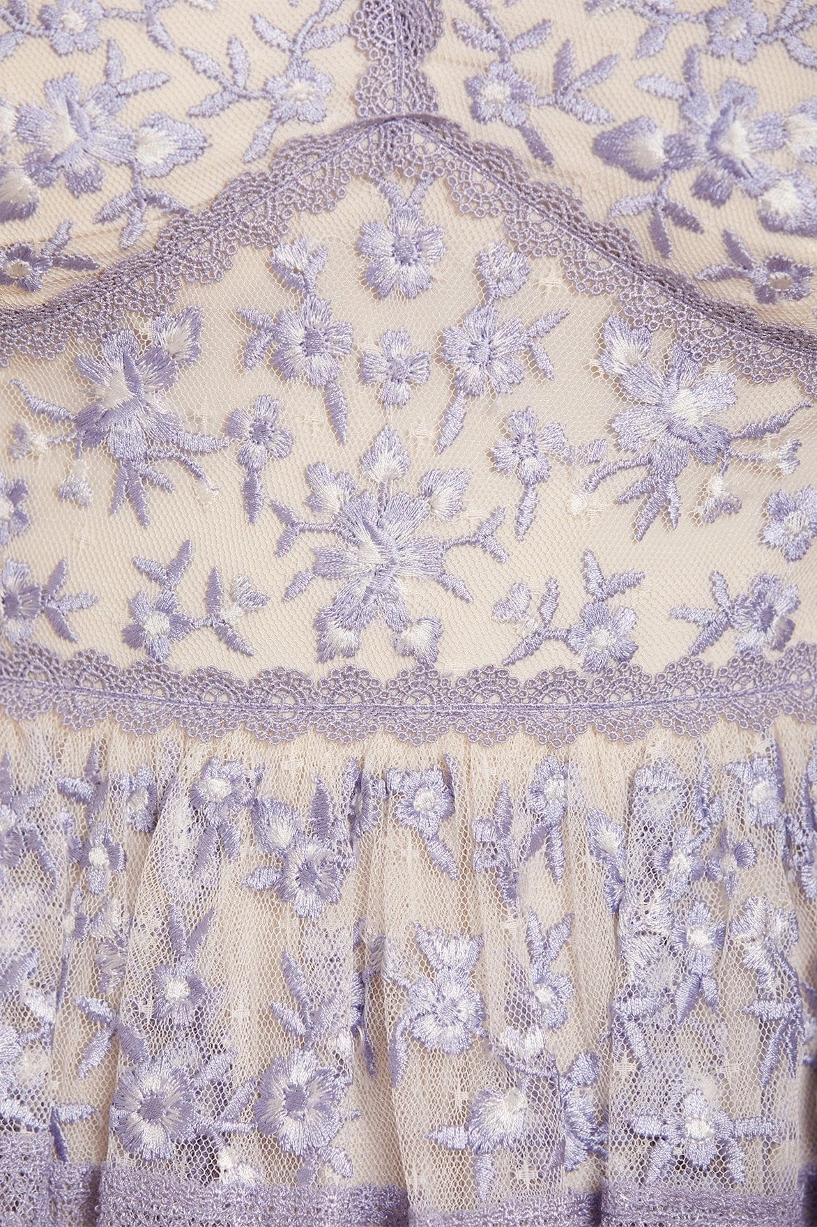 NEW SEASON. The Sweetheart Lace Mini Dress in Champagne/Blue. A signature Needle & Thread style. This mini dress is embroidered delicately with a floral lace artwork. Designed beautifully with intricate trimmed lace in pretty border motifs and perfectly positioned tiers through the skirt. Crafted from soft, kisses tulle creating a romantic texture throughout. The perfect dress to take you from day to night.