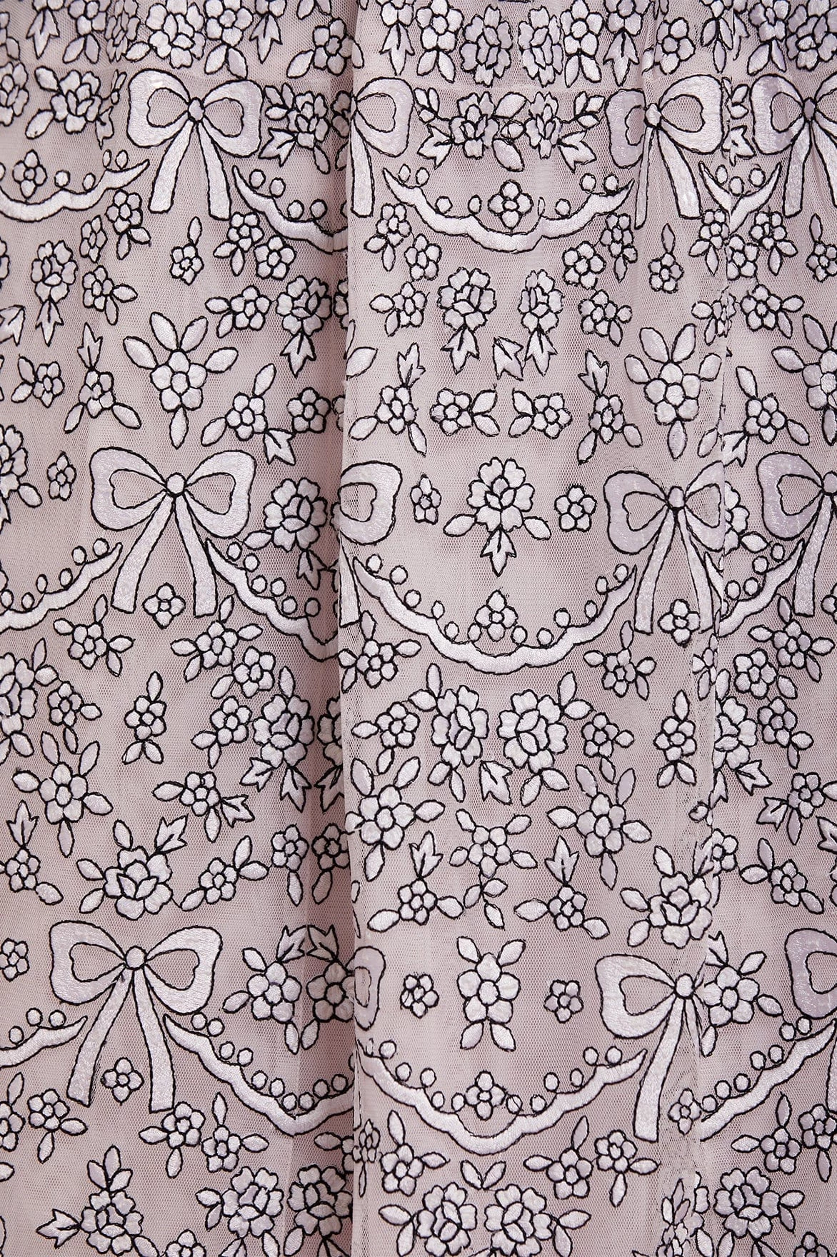 NEW SEASON | NEEDLE & THREAD EXCLUSIVE. The Ribbon Lace Long Sleeve Ankle Gown in Powder Pink/Monochrome. This gown is decorated with floral and ribbon motifs in contrasting thread to create a striking artwork design. Beautifully crafted with a flattering skirt shape, inspired by vintage couture styling. This gown features layers of net and tulle for romantic texture. This is sure to be a season best-seller.