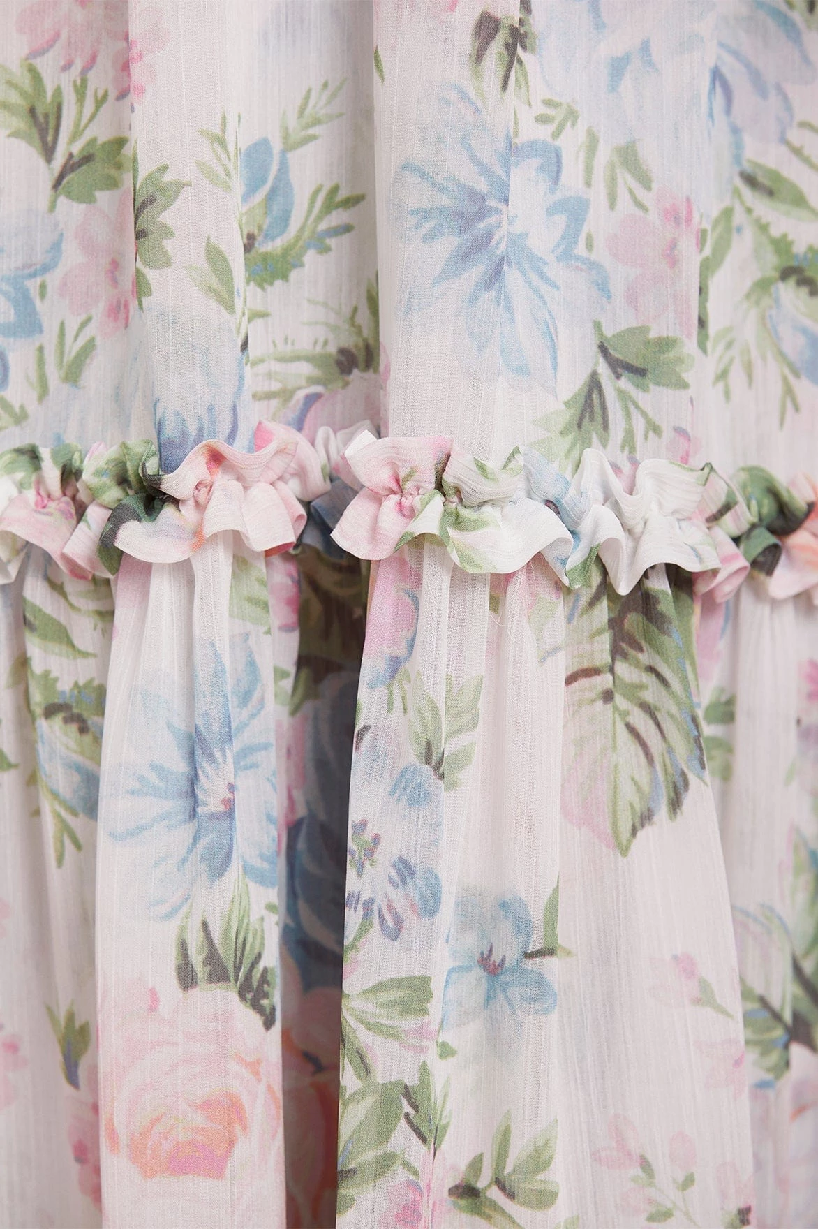 The Rose Fairytale Chiffon V-Neck Day Ankle Gown in Moonshine. This beautifully classic, romantic gown features an all over floral print in whimsical tones of wisteria and powder blue. Developed in a soft, crinkle textured chiffon, with an easy-to-wear silhouette, elasticated waist and gently loose-fitting bodice. Designed with signature Needle & Thread ruffles and detailing throughout. A truly elegant piece.
