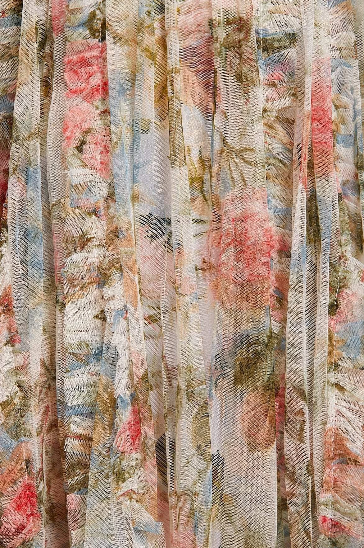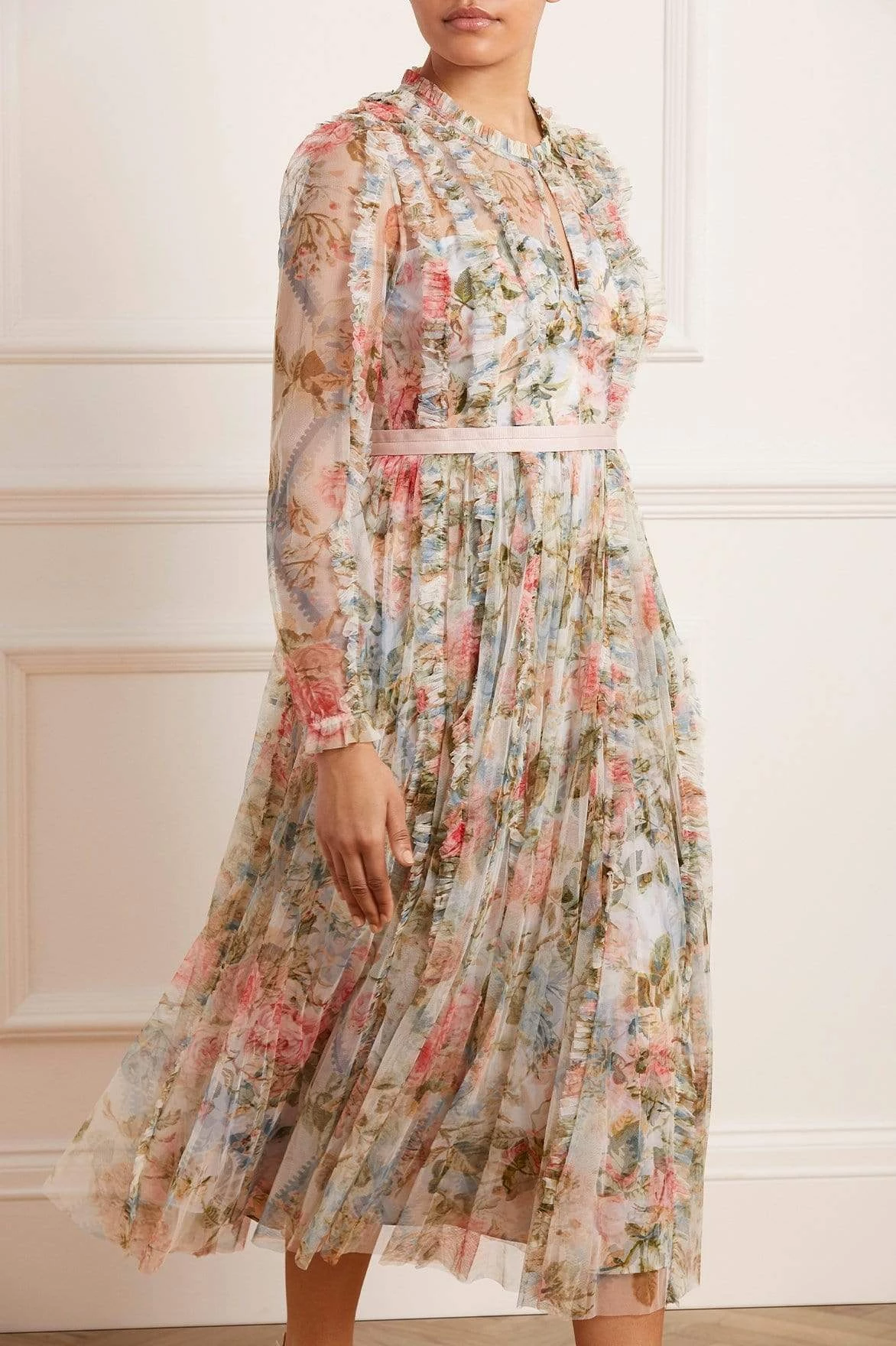 The Rose Garden Ballerina Dress in Multi-Coloured. This statement dress is designed with a floral print, featuring soft pastel roses and intricate trellis details. Crafted with layers of soft tulle and delicate ruffle details adorned throughout. Intricately designed with a Needle & Thread signature ribbon at the waist. The go-to dress for all your upcoming events.